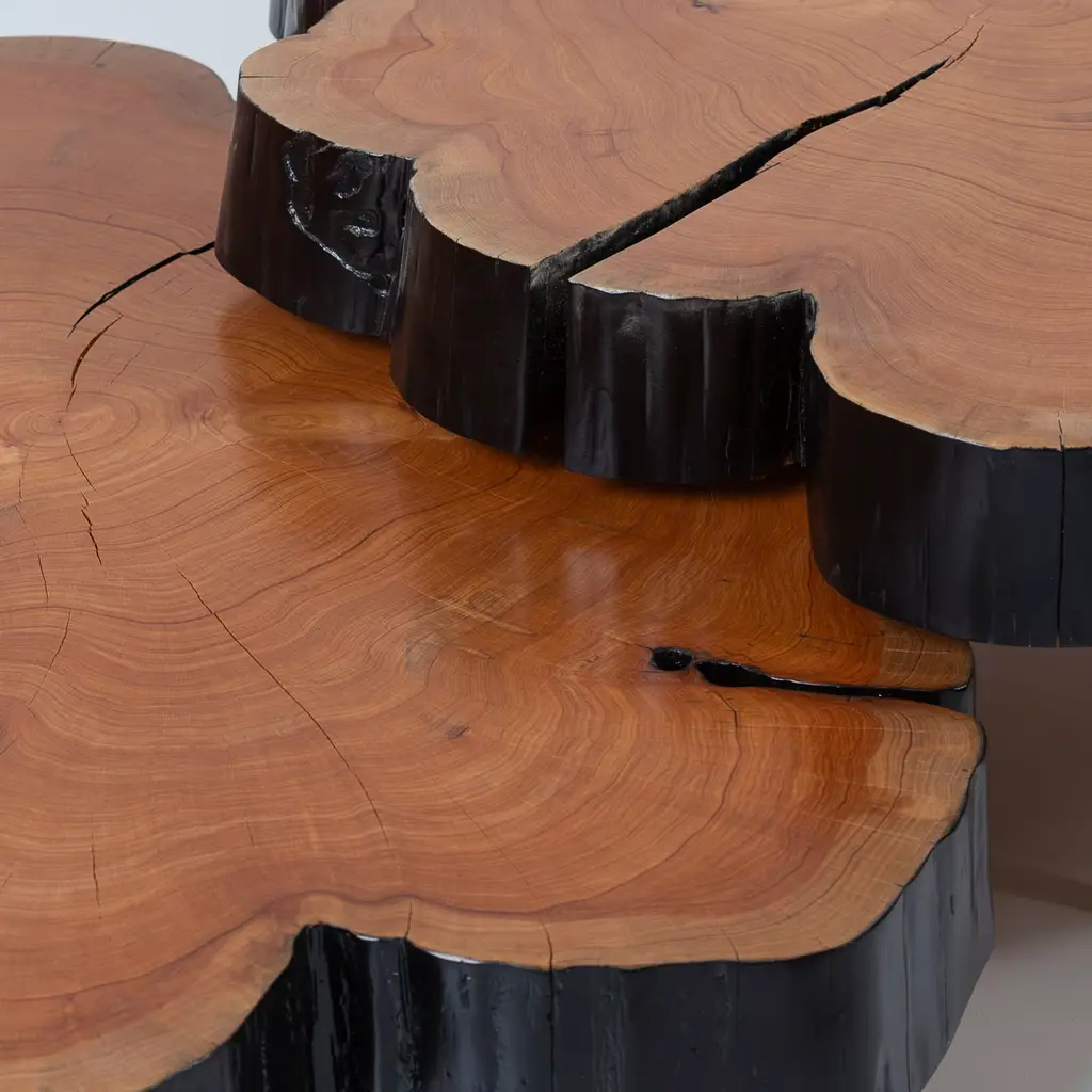 An ode to nature and its spontaneous, breath-taking shapes, this set of two coffee tables is sure to bring an uplifting accent to rustic-chic decors. Streamlined and classy brass feet sustain the tabletops, handcrafted from a century-old cypress stump and indeed entirely unique in their contours, swirls, and grain. The wood's peculiarities are enhanced by a later of transparent varnish and by a black dye along the sides.