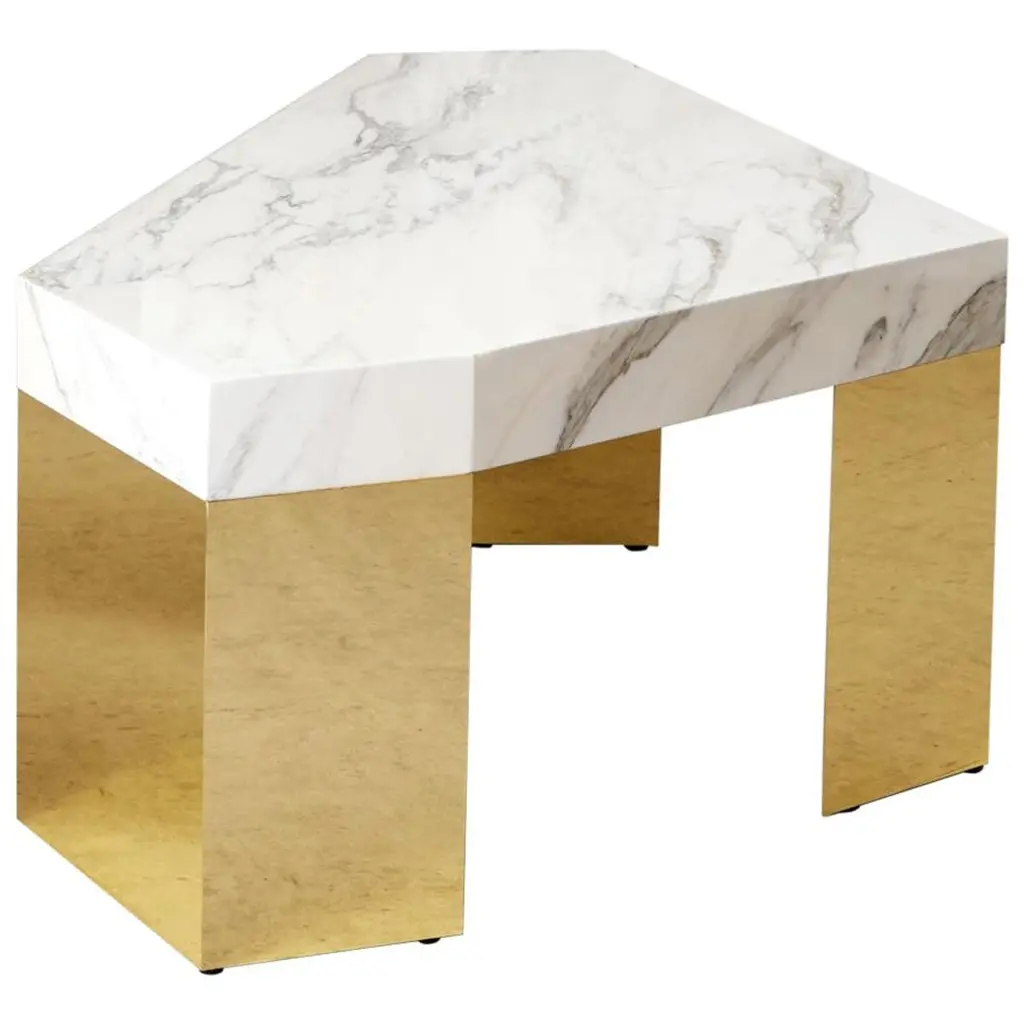This contemporary cocktail table features sophisticated honed Carrara Marble surfaces. The marble is enhanced by architectural banding and a plinth base finished in Burnished Silver Leaf.