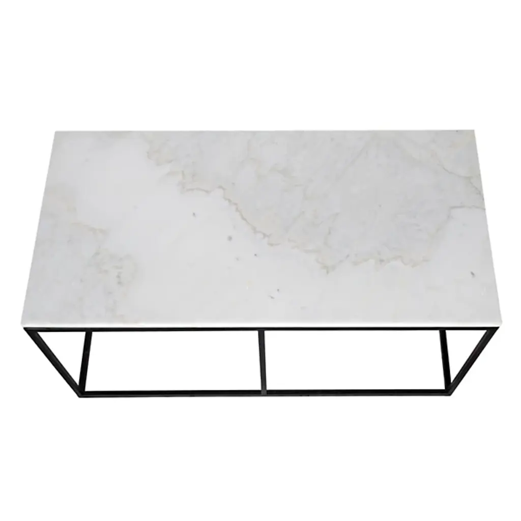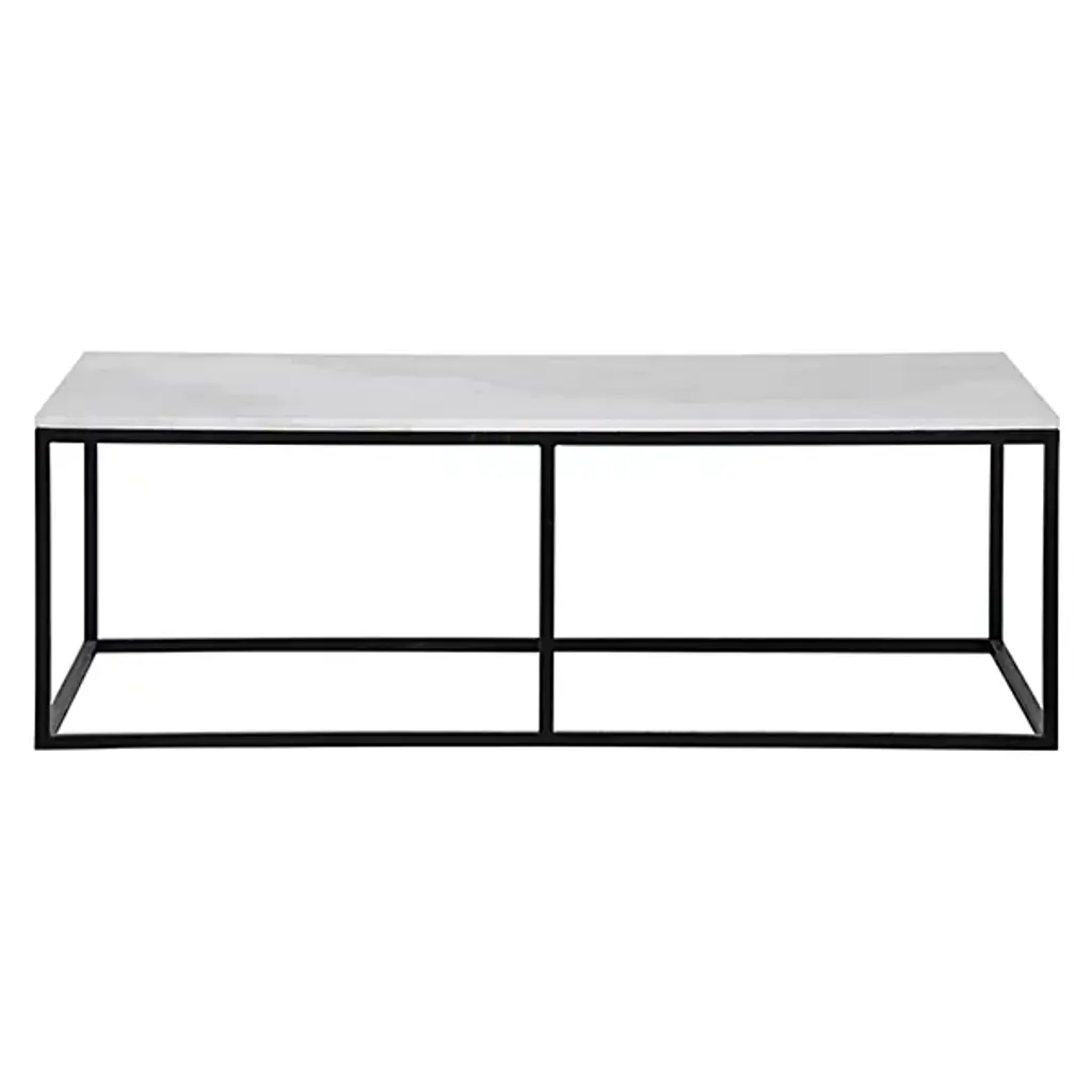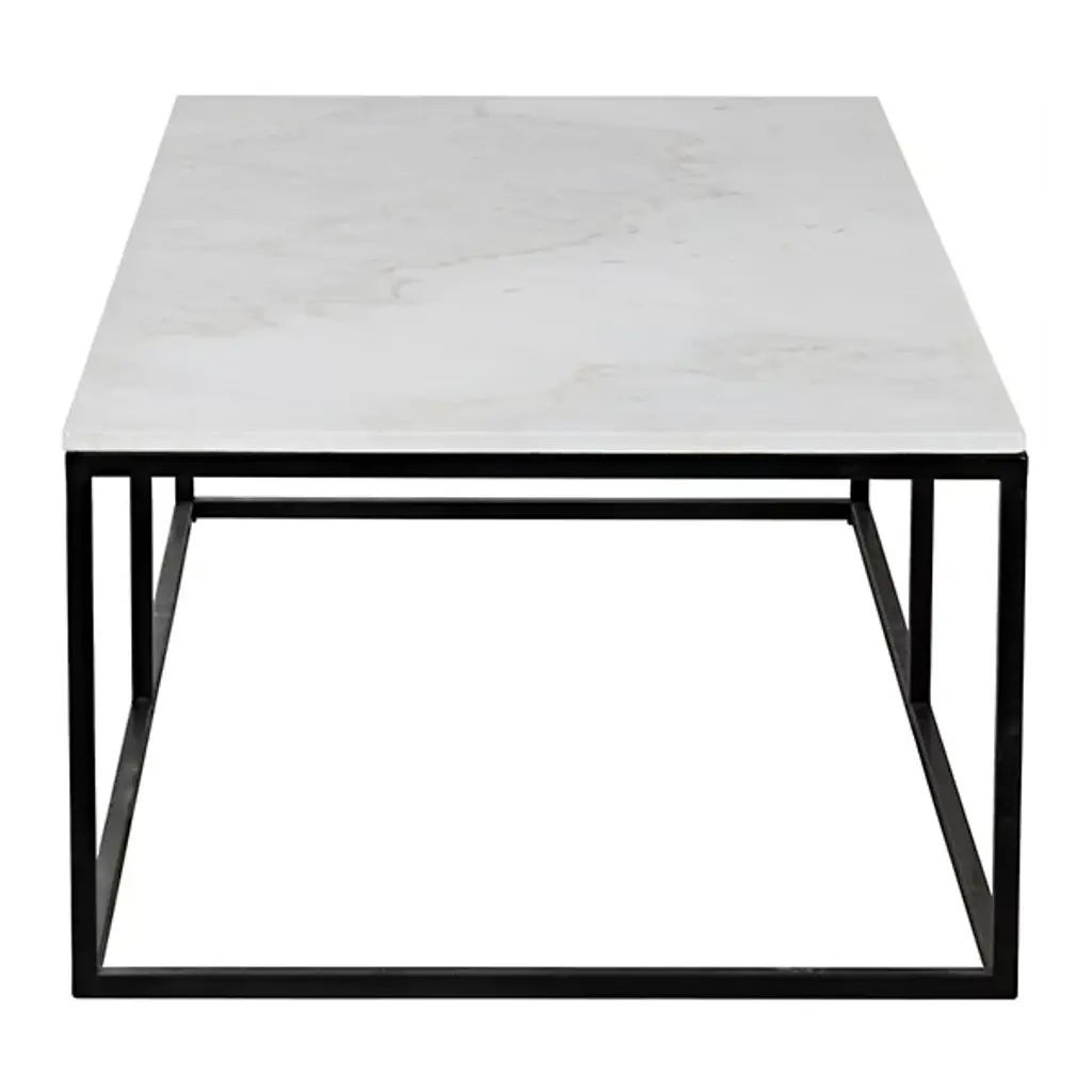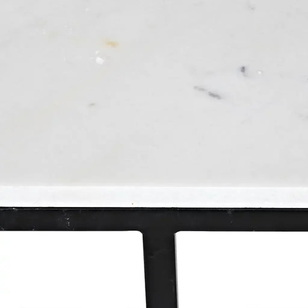Provide an inspired appeal to interiors with the sleek, open lines of the Lois Coffee Table from Noir. An industrial steel frame formed into a rectangular prism offers an open, airy center, contrasted with the plank of Bianco Crown Marble that stretches across it. Each marble slab is distinct from any other, featuring a unique pattern of natural veining and imperfections, polished to an even sheen and adding a touch of luxury to the robust metal below.