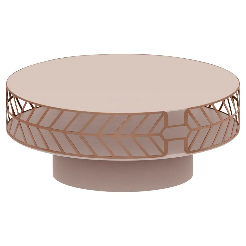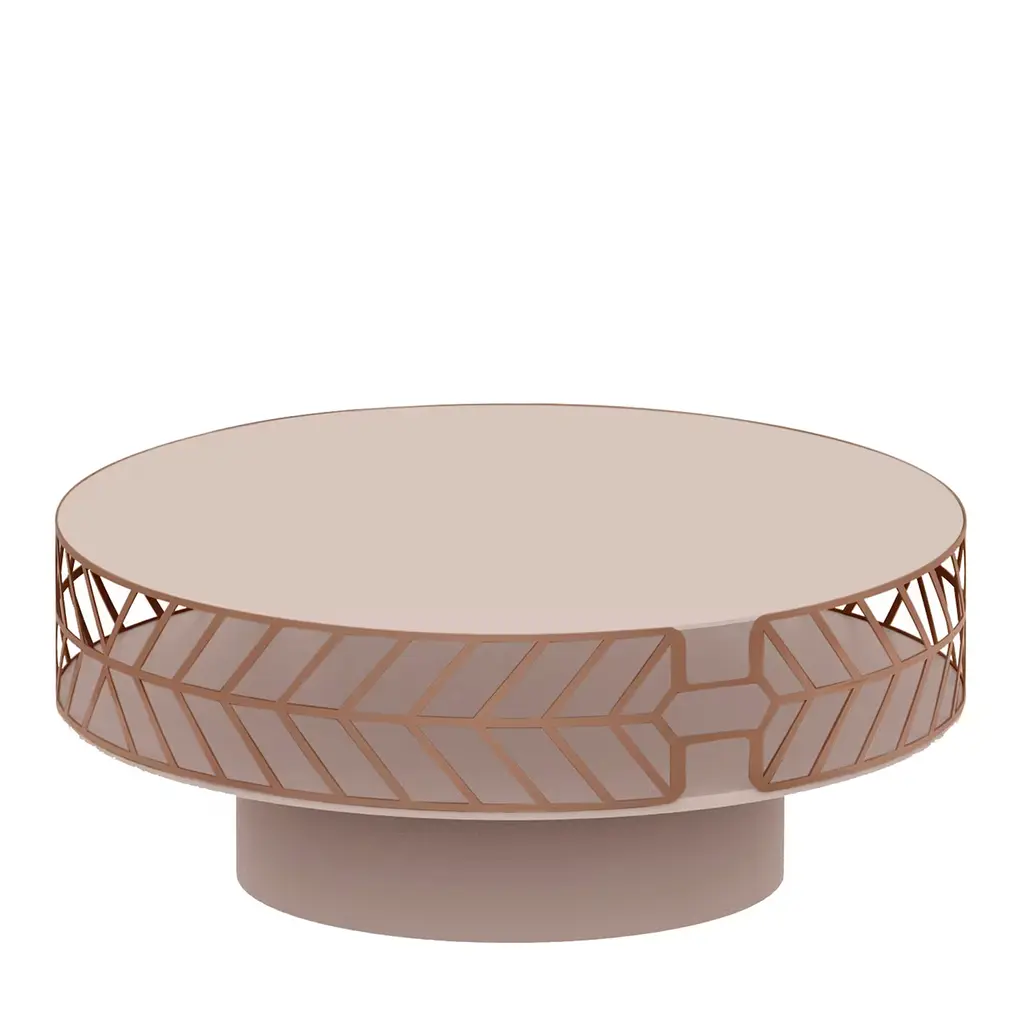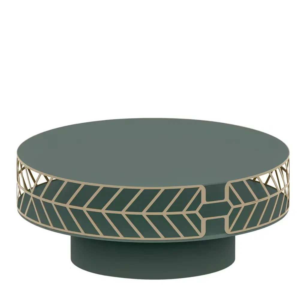 Designed by Elena Salmistraro, this low coffee table features a clean and essential design of natural inspiration. Enclosed in a ring-shaped champagne metal structure that recalls the intricate silhouette of leaves, it features two round shelves resting on a smaller, rounded base. Crafted of matte green-lacquered MDF.