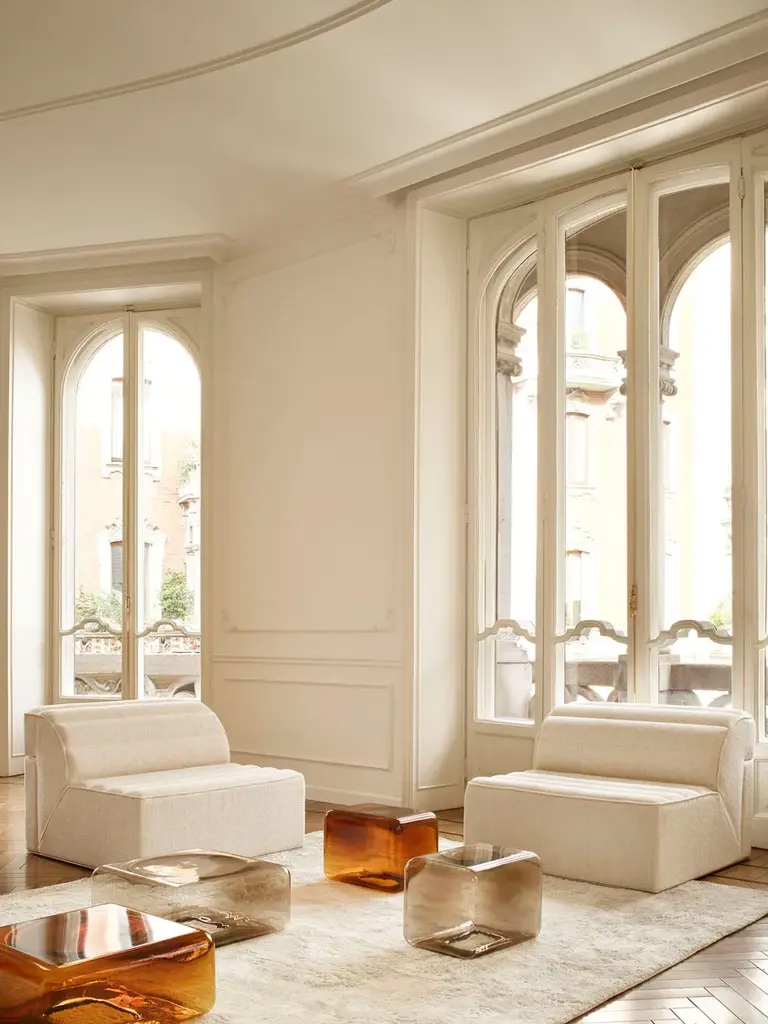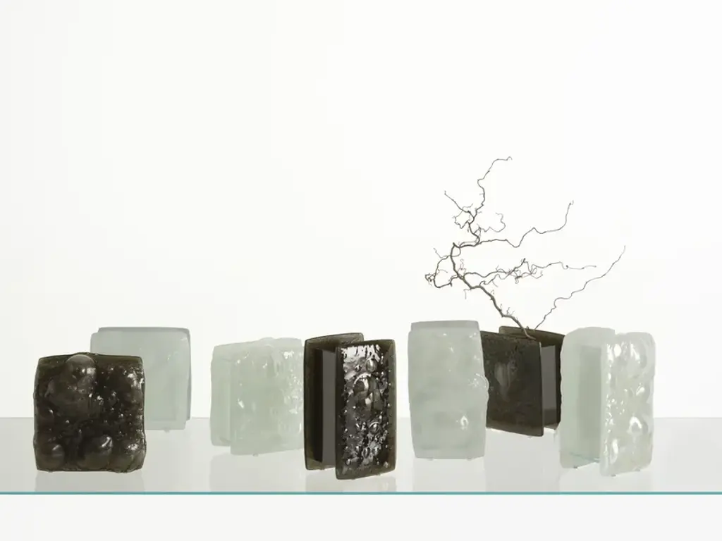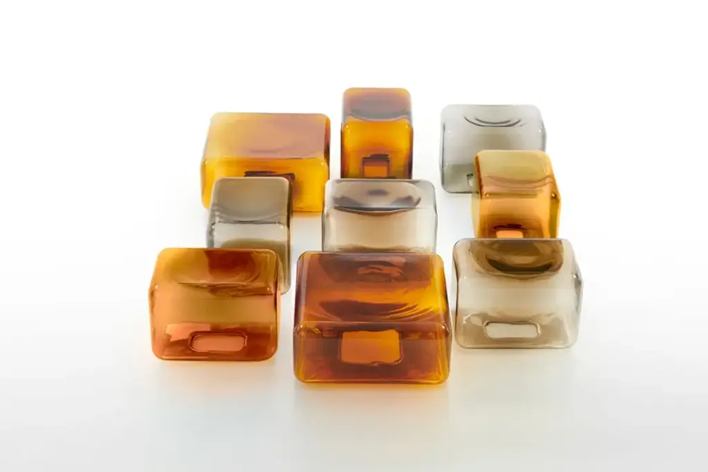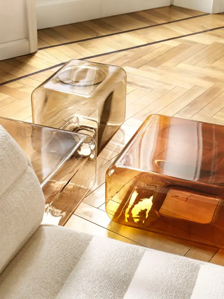 Matter, light and colour come together in an intense interaction of materials.This collection embodies the elegance of pure forms, elevated through the use of hand-blown glass. Sabine Marcelis, known for her poetic and precise use of reflective surfaces and iridescent shades of colour, has designed a collection of ethereal beauty that creates extraordinary plays of light and shadow.Lokum is available in rectangular and square versions in two different shades. Its is very flexible, used either as a single piece or in combination with other elements to create unique and personalized configurations.FinishesMade of blown glass coloured in a crucible. Available colours: smoked grey or amber.
