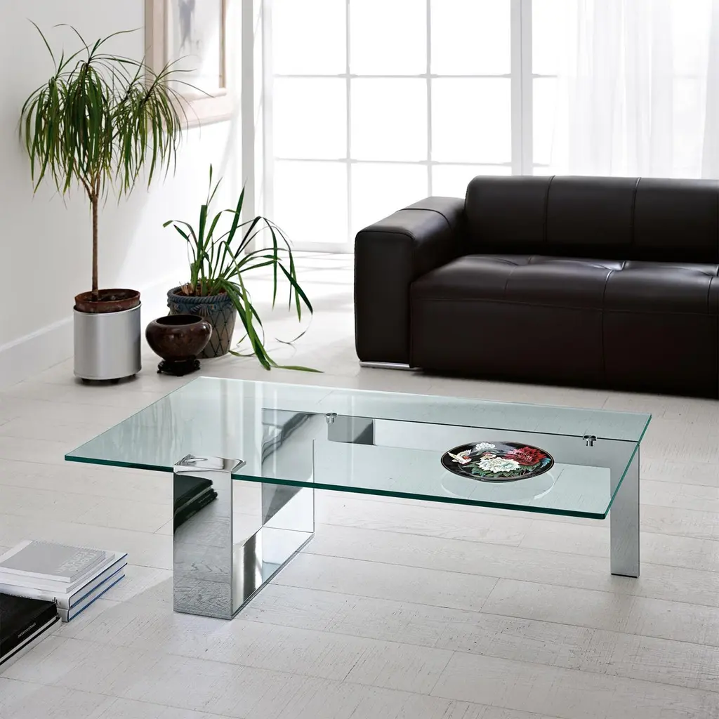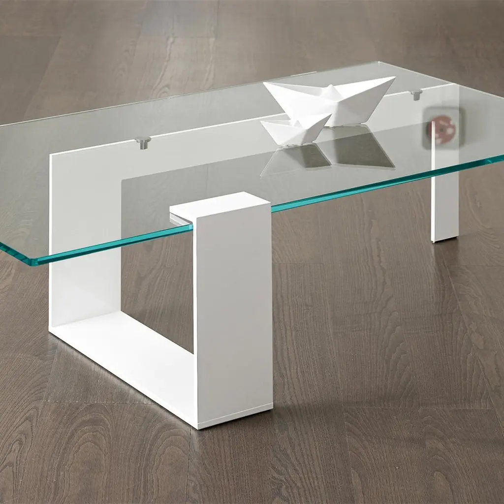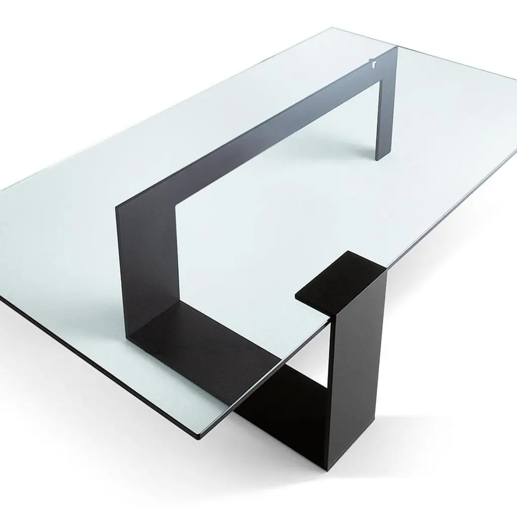 Coffee table longarm with stell base in black lacquered finish and with temperedclear glass top, 12mm thickness.Also available with base in white lacquered or in chrome finish, on request.