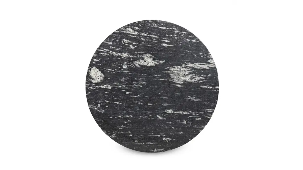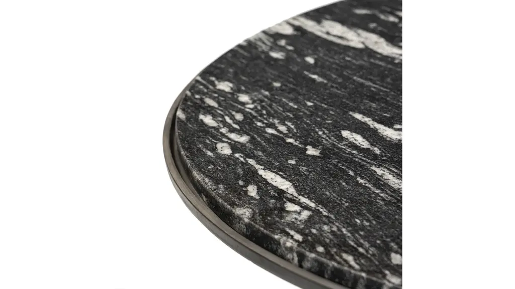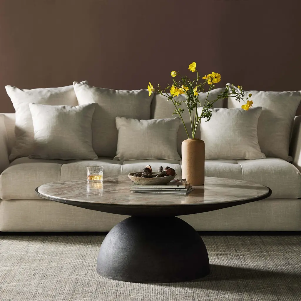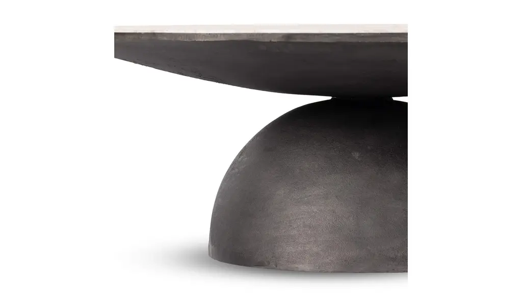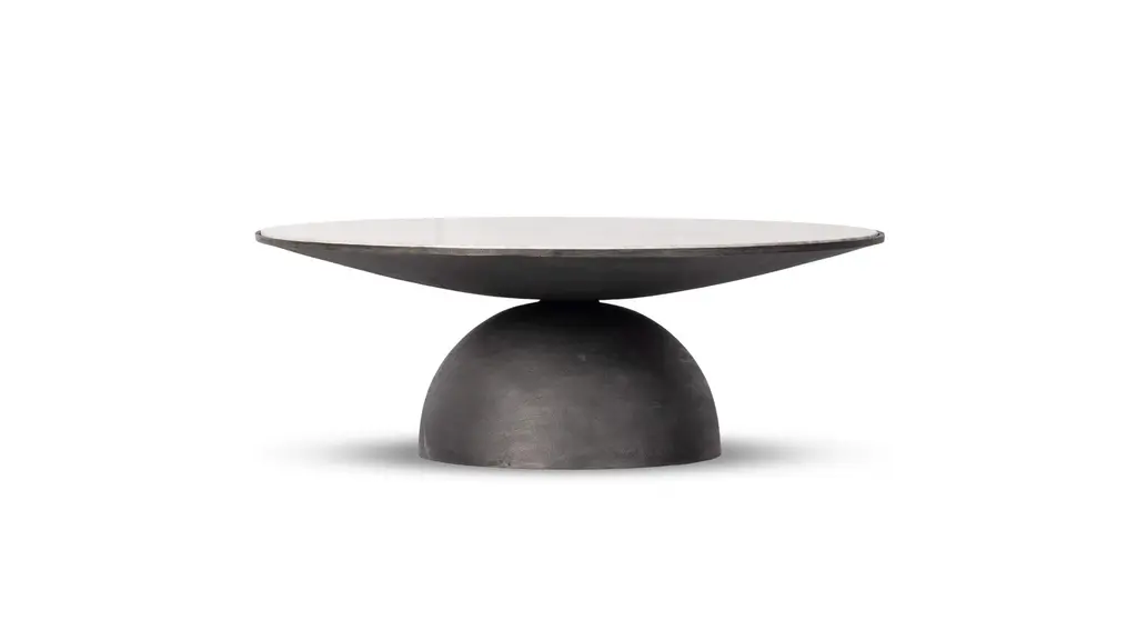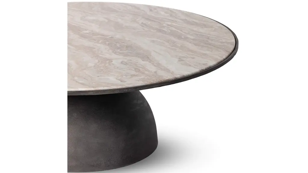 For a sculptural play on shape, a hammered grey aluminum base supports a large, rounded tabletop of creamy taupe solid marble with swirls of natural veining. This item requires some assembly. You can find the instructions here.