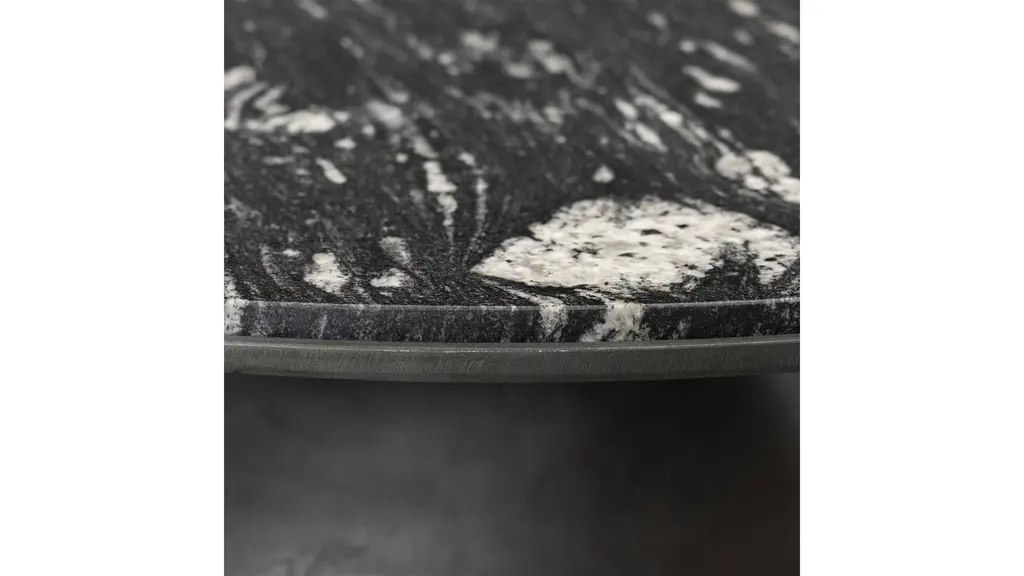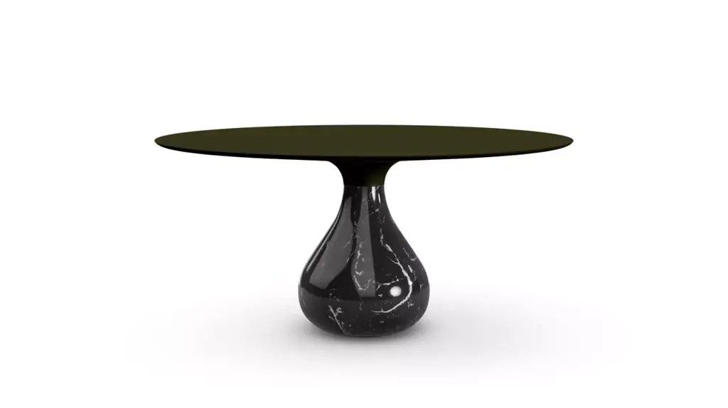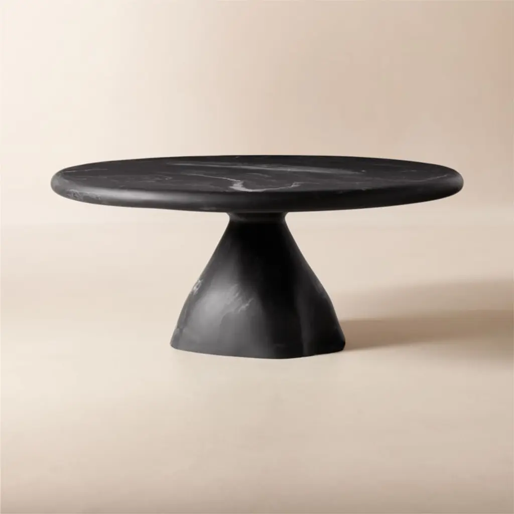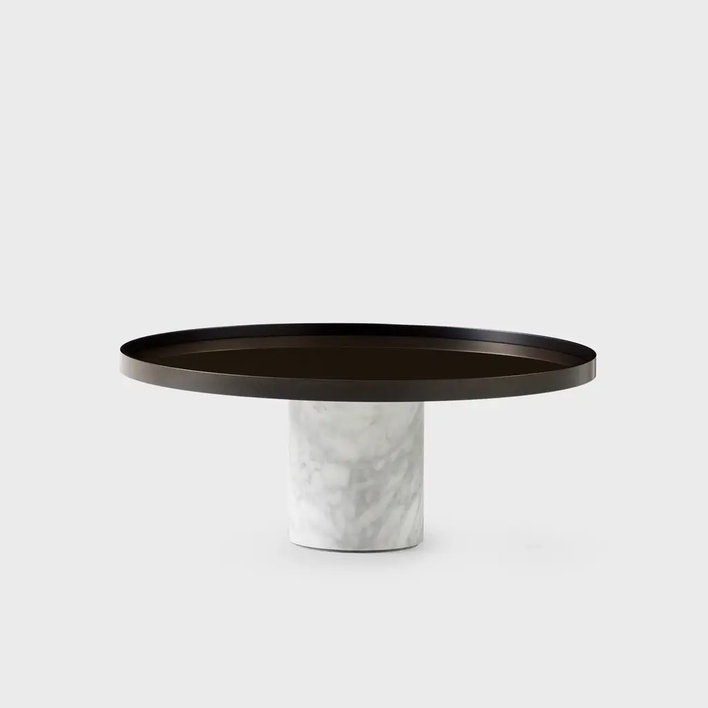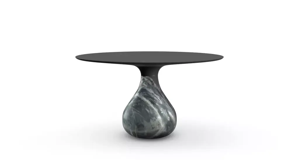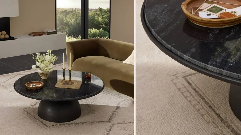 For a sculptural play on shape, a hammered grey aluminum base supports a large, rounded tabletop of creamy taupe solid marble with swirls of natural veining. This item requires some assembly. You can find the instructions here.
