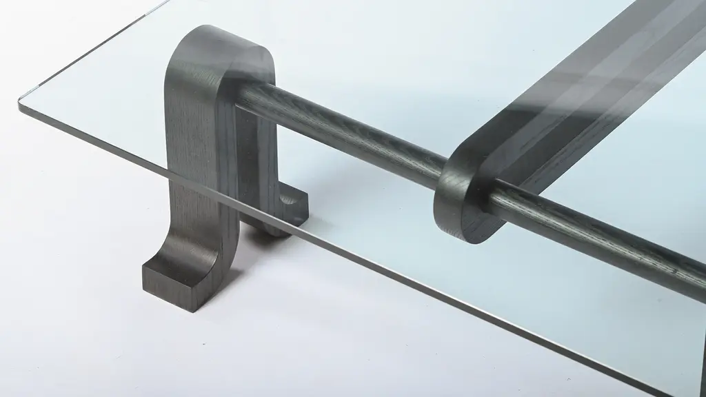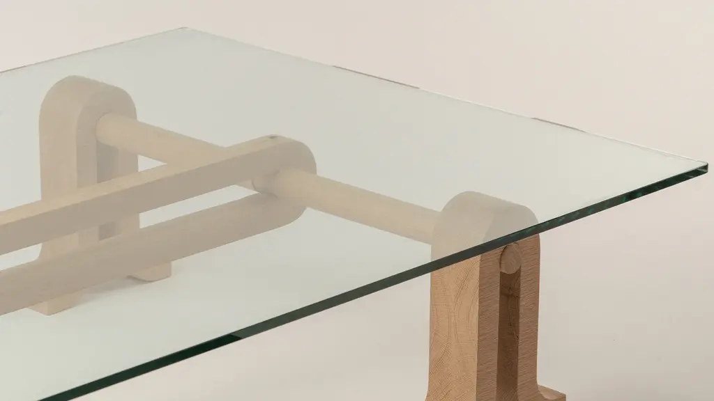 A large hand-built wooden coffee table with glass top.A continuous wooden loop connects these substantial leg supports to create a fluid visual. The glass piece rests on top allowing a clear sightline of the base.
