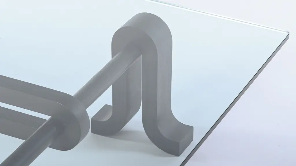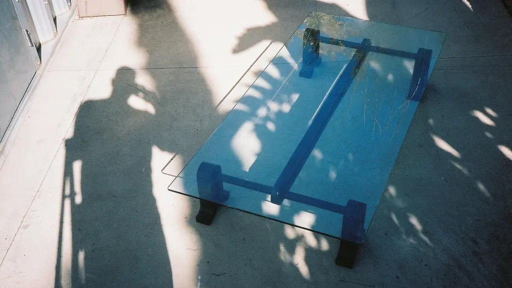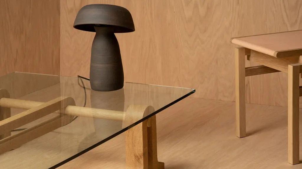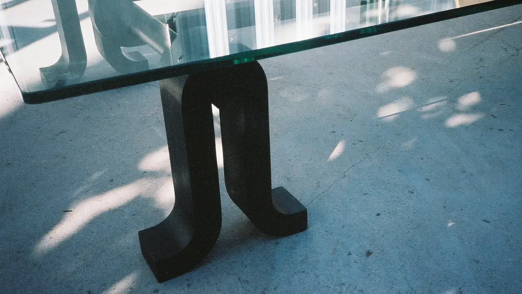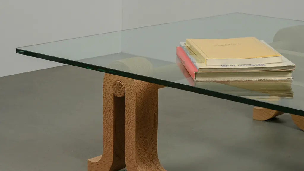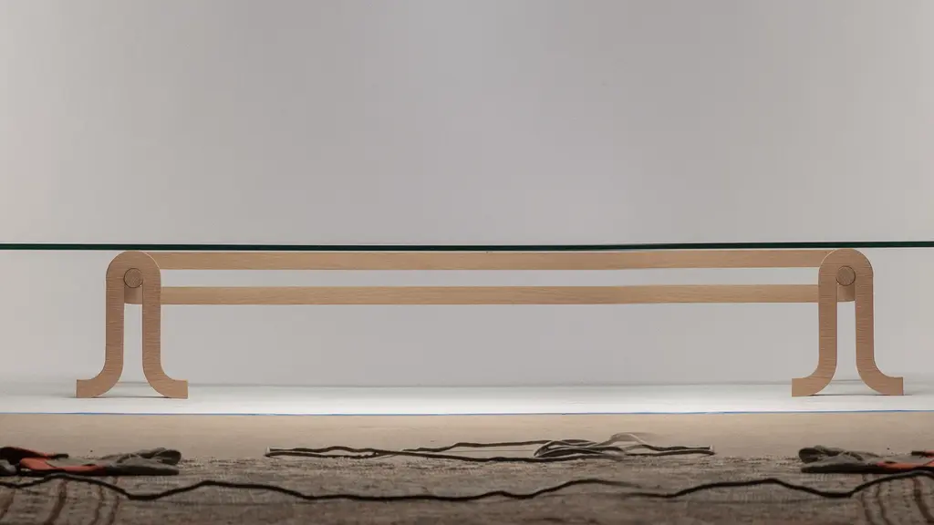 A large hand-built wooden coffee table with glass top.A continuous wooden loop connects these substantial leg supports to create a fluid visual. The glass piece rests on top allowing a clear sightline of the base.