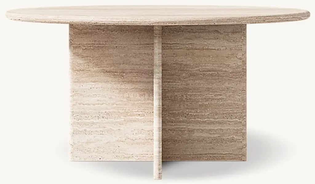 A fabulous, sculptural piece, the statement-making travertine Lorenzo Cocktail Table is a contrast in geometry thanks to its circular top and angular base. Granite and marble are natural materials; variations in coloration, veining and texture are to be expected. Veins, smooth to the touch, are not defects, but rather natural imperfections that add to the uniqueness and charm of each piece.