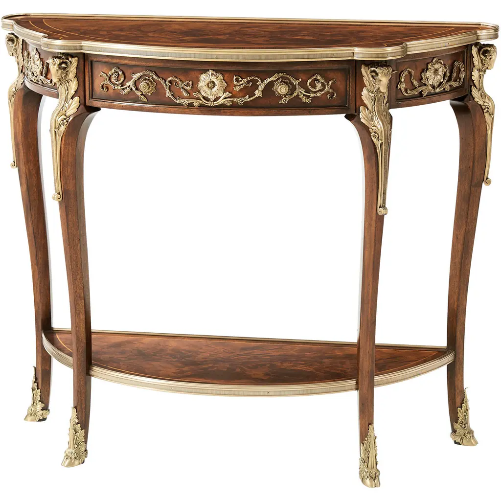 A French Louis XV style mahogany cross-banded banded cocktail table applied with very fine brass mounts, the brass bound circular top with protruding corners, the frieze with two opposing drawers, on ram's head capital cabriole legs joined by an undertier. Dimensions: 38.75" W x 38.75" D x 20.25" H.