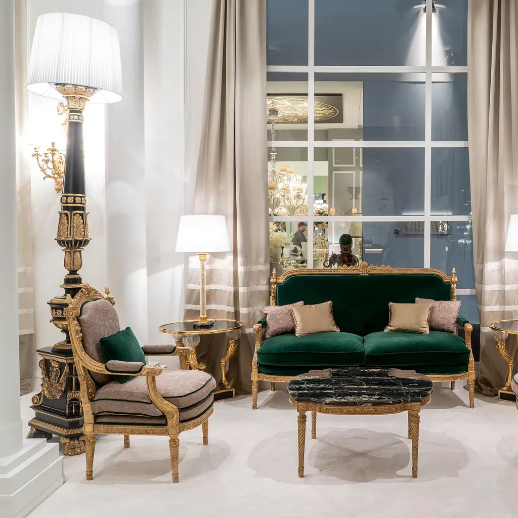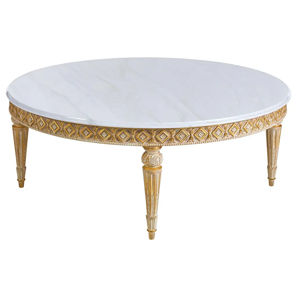 Unrivaled hand-carving mastery and Baroque style collide in this exceptional coffee table. Its solid lime frame, topped by a breath-taking top in black marble marked by a milled perimeter, is meticulously carved bringing out floral motifs on the upper perimeter and a twisted texture for the tapered legs. All of these flattering details are enhanced with brushed gold leaf and finished by applying antiqued patina on red bole. Please inquire with the Concierge for customization inquiries.