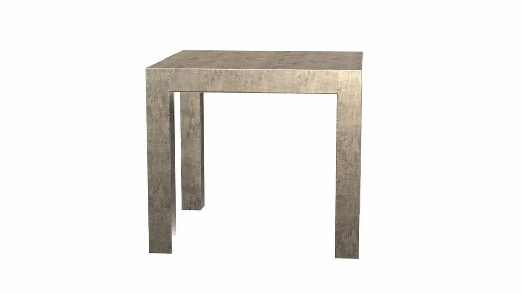 Alison Spear designed this elegant and minimal table for Stephanie Odegard during their trip together to Rajasthan, India. The craftsmen create patterns using different types of hammerings in the metal sheets clad over teak-wood structure.Crafted with utmost care and attention to detail, these Square Drink Table are made to order and are available in twelve metal clad finishes, ensuring that you can choose the perfect one to match your individual style and taste. The use of high-quality materials and expert craftsmanship ensure that each Art Deco Square Drink Table is not only beautiful but also a true piece of art.The Straight legs and side arms of this Art Deco Square Drink Table are hand carved from solid pieces of teak. Pattern makers trace and cut complex forms that will cover the chair in a skin of copper, white bronze, brass or antiqued white bronze The metal finishes will tarnish over time. Regular non-abrasive household metal polishes can be used to restore the original luster.Overall, if you're looking for a piece of furniture that combines luxury, comfort, and style, then the Art Deco Square Drink Table is an excellent choice. With its distinctive curved profile and multiple finish options, this Chair set is sure to elevate the look of any room it is placed in, and be a beloved addition to your home for years to come.The images shown in this listing are shot in different lighting conditions and/or are 3D illustrations. We encourage our customers to please request a sample or a full sample set of 12 finishes so that they can experience the finish first hand. Louise Art Deco Chest of Drawers Square Drink Table Smooth Antique Bronze by Alison Spear for Stephanie OdegardSize- 18"x 18"x 16"HMaterials - Antique Bronze, Metal sheet, Teak, Wood, MetalTechniques: Hand-Crafted, Hand-Carved, Metal Work, Wood Work, Metal Wrapping, PolishedPlease note that moisture in air, sudden change in temperature and natural movement of wood over time causes the metal to wrinkle or bubble up. We use well seasoned, reclaimed teak and high quality marine grade MDF (wherever technically possible) to avoid and delay the mentioned changes. However a perfect stability of metal cannot be guaranteed. Please note that our smooth finish metal clad pieces will have some unavoidable tool marks. This is proof that everything is done by hand. The smooth finish will not come out like a machine made perfect surface and the master artisan will do their best to make it look as good/clean/stable/perfect as he possibly can.The antique white bronze finish is hand done by using an acidic chemical over the white bronze finish to recreate a natural patination. Like with the natural patination of silver, copper, or brass, the final result and color uniformity of the patina cannot be guaranteed. The goal of this finish is to achieve rainbow-like shades with dull, shiny, cloudy, and streaky patches to give an illusion of antiquing. Please note:None of our metal clad pieces are treated with a protective “finish” thus enabling the items to age naturally over time. We will of course polish them well before we pack them. a) Copper oxidizes faster than the other metals. In six to twelve months it will most likely lose its shine and will gradually turn to different shades of brown and/or green/blue. This aging process and its effect is referred to as verdigris. After a year the piece should not change much more. Copper does not rust, but does require periodic cleaning in order to retain its original shine if that the preferred option. ('BRASSO' or any known copper polish can be used to polish copper).b) Brass retains its shine for far longer than others, but will tarnish if not cleaned on occasion. ('BRASSO' is made to polish brass).c) White bronze, has the least tendency to show age or tarnish. If kept in a controlled climate, this metal will hold its shine for years. It can be cleaned with a cleanser and polished with a cloth. d) The antiqued white bronze finish will react with the natural elements the fastest in the beginning but it too will stop reacting and will settle down in a stable state like copper after 6-12 months. Since it is already antiqued and looked like it is tarnished, as described in an earlier message, this fast reaction will not change the over all look. In that way this surface is most forgiving. The images shown in this listing are shot in different lighting conditions and/or are 3D illustrations. We encourage our customers to please request a sample or a full sample set of 12 finishes so that they can experience the finish first hand.