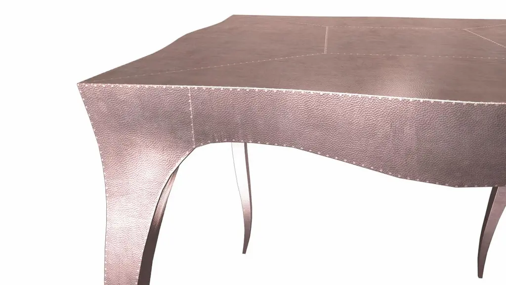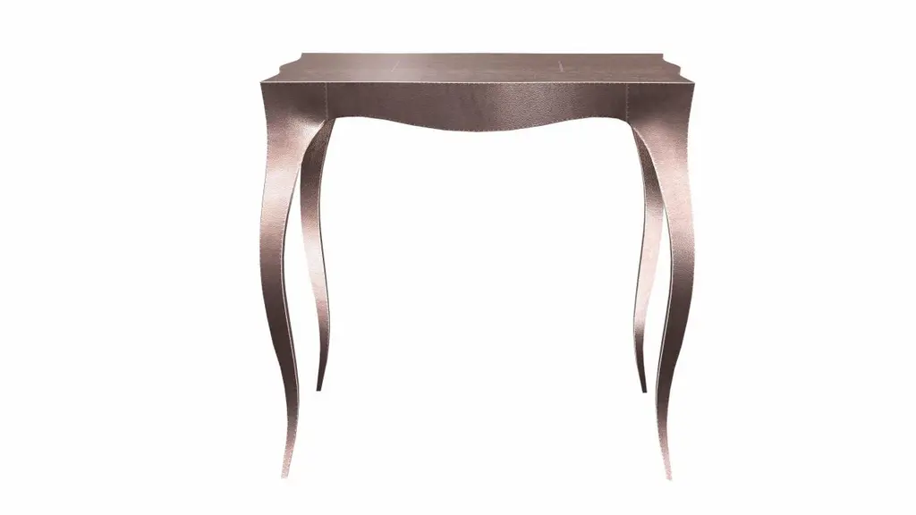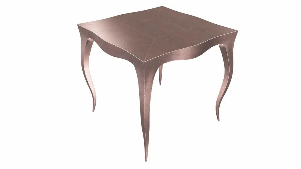 Louis Card Tables from our Louise Collection. The renowned designer Paul Mathieu chose the name “Louise” when he created his more feminine version of Louis XV (1730-1760) furniture. The characteristic cabriole leg, curving outward at the knee and inward towards the foot in an "S" shape was born during this period. It is during the same era that English furniture makers produced the Queen Anne and Chippendale styles.Crafted with utmost care and attention to detail, these Louis Card Tables are made to order and are available in twelve metal clad finishes, ensuring that you can choose the perfect one to match your individual style and taste. The use of high-quality materials and expert craftsmanship ensure that each Art Deco Louis Card Tables is not only beautiful but also a true piece of art.The curved legs and side arms of this Art Deco Louis Card Tables are hand carved from solid pieces of teak. Pattern makers trace and cut complex forms that will cover the chair in a skin of copper, white bronze, brass or antiqued white bronze The metal finishes will tarnish over time. Regular non-abrasive household metal polishes can be used to restore the original luster.Overall, if you're looking for a piece of furniture that combines luxury, comfort, and style, then the Art Deco Card Tables is an excellent choice. With its distinctive curved profile and multiple finish options, this Chair set is sure to elevate the look of any room it is placed in, and be a beloved addition to your home for years to come.The images shown in this listing are shot in different lighting conditions and/or are 3D illustrations. We encourage our customers to please request a sample or a full sample set of 12 finishes so that they can experience the finish first hand. Louise Art Deco Coffee and Cocktail Tables Mid. Hammered Copper by Paul Mathieu for Stephanie OdegardSize- 32"x 32"x 30"HMaterials - White Bronze, Metal sheet, Teak, Wood, MetalTechniques: Hand-Crafted, Hand-Carved, Metal Work, Wood Work, Metal Wrapping, PolishedPlease note that moisture in air, sudden change in temperature and natural movement of wood over time causes the metal to wrinkle or bubble up. We use well seasoned, reclaimed teak and high quality marine grade MDF (wherever technically possible) to avoid and delay the mentioned changes. However a perfect stability of metal cannot be guaranteed. Please note that our smooth finish metal clad pieces will have some unavoidable tool marks. This is proof that everything is done by hand. The smooth finish will not come out like a machine made perfect surface and the master artisan will do their best to make it look as good/clean/stable/perfect as he possibly can.The antique white bronze finish is hand done by using an acidic chemical over the white bronze finish to recreate a natural patination. Like with the natural patination of silver, copper, or brass, the final result and color uniformity of the patina cannot be guaranteed. The goal of this finish is to achieve rainbow-like shades with dull, shiny, cloudy, and streaky patches to give an illusion of antiquing. Please note:None of our metal clad pieces are treated with a protective “finish” thus enabling the items to age naturally over time. We will of course polish them well before we pack them. a) Copper oxidizes faster than the other metals. In six to twelve months it will most likely lose its shine and will gradually turn to different shades of brown and/or green/blue. This aging process and its effect is referred to as verdigris. After a year the piece should not change much more. Copper does not rust, but does require periodic cleaning in order to retain its original shine if that the preferred option. ('BRASSO' or any known copper polish can be used to polish copper).b) Brass retains its shine for far longer than others, but will tarnish if not cleaned on occasion. ('BRASSO' is made to polish brass).c) White bronze, has the least tendency to show age or tarnish. If kept in a controlled climate, this metal will hold its shine for years. It can be cleaned with a cleanser and polished with a cloth. d) The antiqued white bronze finish will react with the natural elements the fastest in the beginning but it too will stop reacting and will settle down in a stable state like copper after 6-12 months. Since it is already antiqued and looked like it is tarnished, as described in an earlier message, this fast reaction will not change the over all look. In that way this surface is most forgiving. The images shown in this listing are shot in different lighting conditions and/or are 3D illustrations. We encourage our customers to please request a sample or a full sample set of 12 finishes so that they can experience the finish first hand.