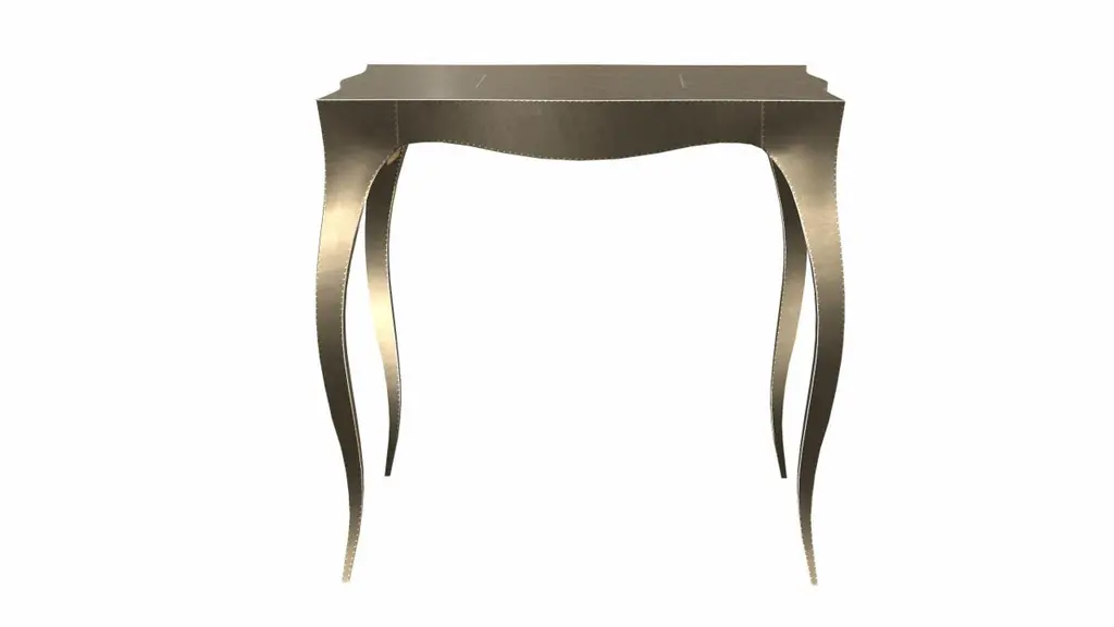 Louis Card Tables from our Louise Collection. The renowned designer Paul Mathieu chose the name “Louise” when he created his more feminine version of Louis XV (1730-1760) furniture. The characteristic cabriole leg, curving outward at the knee and inward towards the foot in an "S" shape was born during this period. It is during the same era that English furniture makers produced the Queen Anne and Chippendale styles.Crafted with utmost care and attention to detail, these Louis Card Tables are made to order and are available in twelve metal clad finishes, ensuring that you can choose the perfect one to match your individual style and taste. The use of high-quality materials and expert craftsmanship ensure that each Art Deco Louis Card Tables is not only beautiful but also a true piece of art.The curved legs and side arms of this Art Deco Louis Card Tables are hand carved from solid pieces of teak. Pattern makers trace and cut complex forms that will cover the chair in a skin of copper, white bronze, brass or antiqued white bronze The metal finishes will tarnish over time. Regular non-abrasive household metal polishes can be used to restore the original luster.Overall, if you're looking for a piece of furniture that combines luxury, comfort, and style, then the Art Deco Card Tables is an excellent choice. With its distinctive curved profile and multiple finish options, this Chair set is sure to elevate the look of any room it is placed in, and be a beloved addition to your home for years to come.The images shown in this listing are shot in different lighting conditions and/or are 3D illustrations. We encourage our customers to please request a sample or a full sample set of 12 finishes so that they can experience the finish first hand. Louise Art Deco Coffee and Cocktail Tables Smooth Brass by Paul Mathieu for Stephanie OdegardSize- 32"x 32"x 30"HMaterials - White Bronze, Metal sheet, Teak, Wood, MetalTechniques: Hand-Crafted, Hand-Carved, Metal Work, Wood Work, Metal Wrapping, PolishedPlease note that moisture in air, sudden change in temperature and natural movement of wood over time causes the metal to wrinkle or bubble up. We use well seasoned, reclaimed teak and high quality marine grade MDF (wherever technically possible) to avoid and delay the mentioned changes. However a perfect stability of metal cannot be guaranteed. Please note that our smooth finish metal clad pieces will have some unavoidable tool marks. This is proof that everything is done by hand. The smooth finish will not come out like a machine made perfect surface and the master artisan will do their best to make it look as good/clean/stable/perfect as he possibly can.The antique white bronze finish is hand done by using an acidic chemical over the white bronze finish to recreate a natural patination. Like with the natural patination of silver, copper, or brass, the final result and color uniformity of the patina cannot be guaranteed. The goal of this finish is to achieve rainbow-like shades with dull, shiny, cloudy, and streaky patches to give an illusion of antiquing. Please note:None of our metal clad pieces are treated with a protective “finish” thus enabling the items to age naturally over time. We will of course polish them well before we pack them. a) Copper oxidizes faster than the other metals. In six to twelve months it will most likely lose its shine and will gradually turn to different shades of brown and/or green/blue. This aging process and its effect is referred to as verdigris. After a year the piece should not change much more. Copper does not rust, but does require periodic cleaning in order to retain its original shine if that the preferred option. ('BRASSO' or any known copper polish can be used to polish copper).b) Brass retains its shine for far longer than others, but will tarnish if not cleaned on occasion. ('BRASSO' is made to polish brass).c) White bronze, has the least tendency to show age or tarnish. If kept in a controlled climate, this metal will hold its shine for years. It can be cleaned with a cleanser and polished with a cloth. d) The antiqued white bronze finish will react with the natural elements the fastest in the beginning but it too will stop reacting and will settle down in a stable state like copper after 6-12 months. Since it is already antiqued and looked like it is tarnished, as described in an earlier message, this fast reaction will not change the over all look. In that way this surface is most forgiving. The images shown in this listing are shot in different lighting conditions and/or are 3D illustrations. We encourage our customers to please request a sample or a full sample set of 12 finishes so that they can experience the finish first hand.