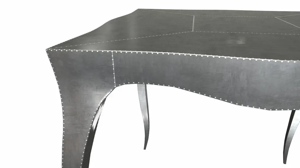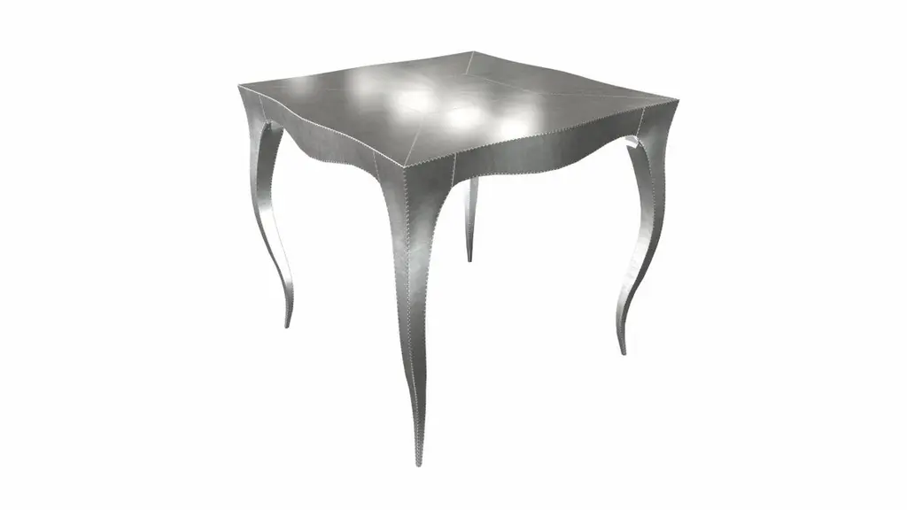 Louis Card Tables from our Louise Collection. The renowned designer Paul Mathieu chose the name “Louise” when he created his more feminine version of Louis XV (1730-1760) furniture. The characteristic cabriole leg, curving outward at the knee and inward towards the foot in an "S" shape was born during this period. It is during the same era that English furniture makers produced the Queen Anne and Chippendale styles.Crafted with utmost care and attention to detail, these Louis Card Tables are made to order and are available in twelve metal clad finishes, ensuring that you can choose the perfect one to match your individual style and taste. The use of high-quality materials and expert craftsmanship ensure that each Art Deco Louis Card Tables is not only beautiful but also a true piece of art.The curved legs and side arms of this Art Deco Louis Card Tables are hand carved from solid pieces of teak. Pattern makers trace and cut complex forms that will cover the chair in a skin of copper, white bronze, brass or antiqued white bronze The metal finishes will tarnish over time. Regular non-abrasive household metal polishes can be used to restore the original luster.Overall, if you're looking for a piece of furniture that combines luxury, comfort, and style, then the Art Deco Card Tables is an excellent choice. With its distinctive curved profile and multiple finish options, this Chair set is sure to elevate the look of any room it is placed in, and be a beloved addition to your home for years to come.The images shown in this listing are shot in different lighting conditions and/or are 3D illustrations. We encourage our customers to please request a sample or a full sample set of 12 finishes so that they can experience the finish first hand. Louise Art Deco Coffee and Cocktail Tables Smooth White Bronze by Paul Mathieu for Stephanie OdegardSize- 32"x 32"x 30"HMaterials - White Bronze, Metal sheet, Teak, Wood, MetalTechniques: Hand-Crafted, Hand-Carved, Metal Work, Wood Work, Metal Wrapping, PolishedPlease note that moisture in air, sudden change in temperature and natural movement of wood over time causes the metal to wrinkle or bubble up. We use well seasoned, reclaimed teak and high quality marine grade MDF (wherever technically possible) to avoid and delay the mentioned changes. However a perfect stability of metal cannot be guaranteed. Please note that our smooth finish metal clad pieces will have some unavoidable tool marks. This is proof that everything is done by hand. The smooth finish will not come out like a machine made perfect surface and the master artisan will do their best to make it look as good/clean/stable/perfect as he possibly can.The antique white bronze finish is hand done by using an acidic chemical over the white bronze finish to recreate a natural patination. Like with the natural patination of silver, copper, or brass, the final result and color uniformity of the patina cannot be guaranteed. The goal of this finish is to achieve rainbow-like shades with dull, shiny, cloudy, and streaky patches to give an illusion of antiquing. Please note:None of our metal clad pieces are treated with a protective “finish” thus enabling the items to age naturally over time. We will of course polish them well before we pack them. a) Copper oxidizes faster than the other metals. In six to twelve months it will most likely lose its shine and will gradually turn to different shades of brown and/or green/blue. This aging process and its effect is referred to as verdigris. After a year the piece should not change much more. Copper does not rust, but does require periodic cleaning in order to retain its original shine if that the preferred option. ('BRASSO' or any known copper polish can be used to polish copper).b) Brass retains its shine for far longer than others, but will tarnish if not cleaned on occasion. ('BRASSO' is made to polish brass).c) White bronze, has the least tendency to show age or tarnish. If kept in a controlled climate, this metal will hold its shine for years. It can be cleaned with a cleanser and polished with a cloth. d) The antiqued white bronze finish will react with the natural elements the fastest in the beginning but it too will stop reacting and will settle down in a stable state like copper after 6-12 months. Since it is already antiqued and looked like it is tarnished, as described in an earlier message, this fast reaction will not change the over all look. In that way this surface is most forgiving. The images shown in this listing are shot in different lighting conditions and/or are 3D illustrations. We encourage our customers to please request a sample or a full sample set of 12 finishes so that they can experience the finish first hand.