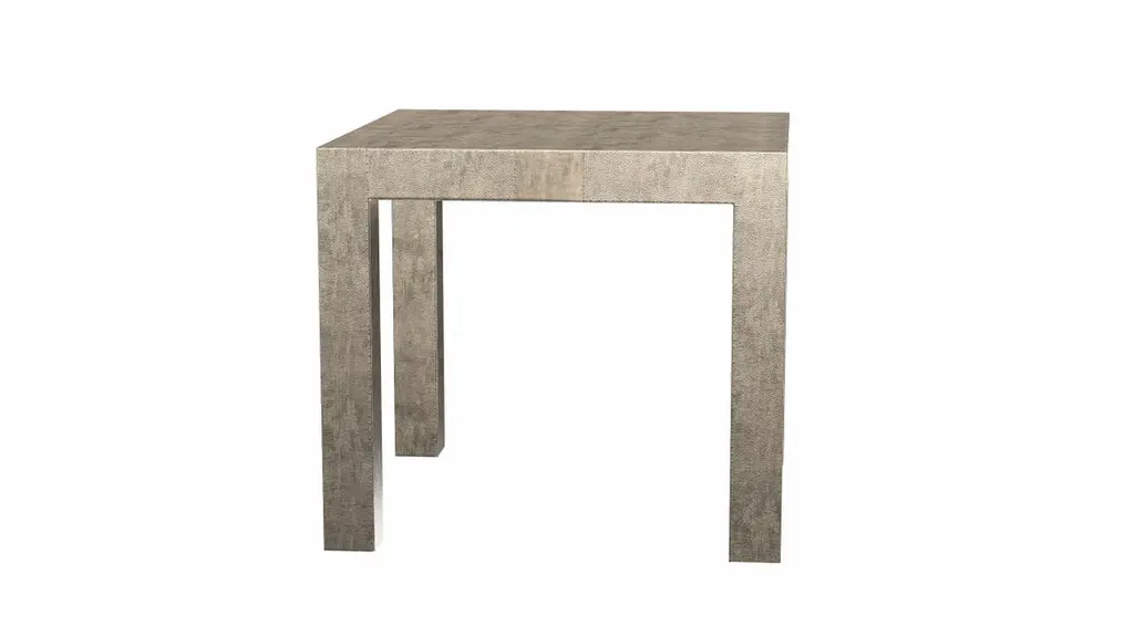 Alison Spear designed this elegant and minimal table for Stephanie Odegard during their trip together to Rajasthan, India. The craftsmen create patterns using different types of hammerings in the metal sheets clad over teak-wood structure.Crafted with utmost care and attention to detail, these Square Drink Table are made to order and are available in twelve metal clad finishes, ensuring that you can choose the perfect one to match your individual style and taste. The use of high-quality materials and expert craftsmanship ensure that each Art Deco Square Drink Table is not only beautiful but also a true piece of art.The Straight legs and side arms of this Art Deco Square Drink Table are hand carved from solid pieces of teak. Pattern makers trace and cut complex forms that will cover the chair in a skin of copper, white bronze, brass or antiqued white bronze The metal finishes will tarnish over time. Regular non-abrasive household metal polishes can be used to restore the original luster.Overall, if you're looking for a piece of furniture that combines luxury, comfort, and style, then the Art Deco Square Drink Table is an excellent choice. With its distinctive curved profile and multiple finish options, this Chair set is sure to elevate the look of any room it is placed in, and be a beloved addition to your home for years to come.The images shown in this listing are shot in different lighting conditions and/or are 3D illustrations. We encourage our customers to please request a sample or a full sample set of 12 finishes so that they can experience the finish first hand. Louise Art Deco Coffee and Cocktail Tables Square Drink Table Fine Hammered Antique Bronze by Alison Spear for Stephanie OdegardSize- 18"x 18"x 16"HMaterials - Antique Bronze, Metal sheet, Teak, Wood, MetalTechniques: Hand-Crafted, Hand-Carved, Metal Work, Wood Work, Metal Wrapping, PolishedPlease note that moisture in air, sudden change in temperature and natural movement of wood over time causes the metal to wrinkle or bubble up. We use well seasoned, reclaimed teak and high quality marine grade MDF (wherever technically possible) to avoid and delay the mentioned changes. However a perfect stability of metal cannot be guaranteed. Please note that our smooth finish metal clad pieces will have some unavoidable tool marks. This is proof that everything is done by hand. The smooth finish will not come out like a machine made perfect surface and the master artisan will do their best to make it look as good/clean/stable/perfect as he possibly can.The antique white bronze finish is hand done by using an acidic chemical over the white bronze finish to recreate a natural patination. Like with the natural patination of silver, copper, or brass, the final result and color uniformity of the patina cannot be guaranteed. The goal of this finish is to achieve rainbow-like shades with dull, shiny, cloudy, and streaky patches to give an illusion of antiquing. Please note:None of our metal clad pieces are treated with a protective “finish” thus enabling the items to age naturally over time. We will of course polish them well before we pack them. a) Copper oxidizes faster than the other metals. In six to twelve months it will most likely lose its shine and will gradually turn to different shades of brown and/or green/blue. This aging process and its effect is referred to as verdigris. After a year the piece should not change much more. Copper does not rust, but does require periodic cleaning in order to retain its original shine if that the preferred option. ('BRASSO' or any known copper polish can be used to polish copper).b) Brass retains its shine for far longer than others, but will tarnish if not cleaned on occasion. ('BRASSO' is made to polish brass).c) White bronze, has the least tendency to show age or tarnish. If kept in a controlled climate, this metal will hold its shine for years. It can be cleaned with a cleanser and polished with a cloth. d) The antiqued white bronze finish will react with the natural elements the fastest in the beginning but it too will stop reacting and will settle down in a stable state like copper after 6-12 months. Since it is already antiqued and looked like it is tarnished, as described in an earlier message, this fast reaction will not change the over all look. In that way this surface is most forgiving. The images shown in this listing are shot in different lighting conditions and/or are 3D illustrations. We encourage our customers to please request a sample or a full sample set of 12 finishes so that they can experience the finish first hand.