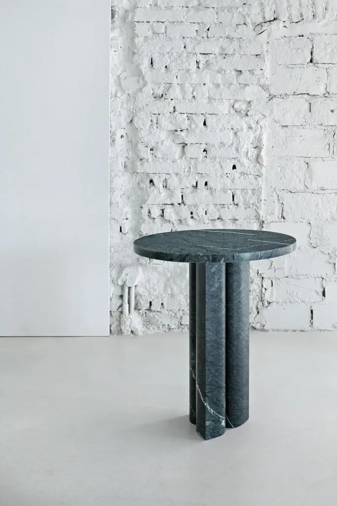 Material: Verdi Alpi marble.The stone is the star of the show in these tables which were designed by Michael Anastassiades with the specific intention of highlighting the opulence of the marbles chosen for his collection ‘Love Me, Love Me Not’.The simplicity of each table is misleading. For example, if we take the legs, those of the rectangular tables look like a conventional four-cornered leg but if you look closely you will see that they are, in fact, curved. This not only creates a sense of the leg drawing back, but also has the effect of lightening the table itself.For the round tables Michael placed the three legs just far enough to ensure stability, drawn together at the centre to create a three-part column.