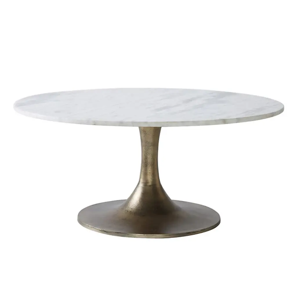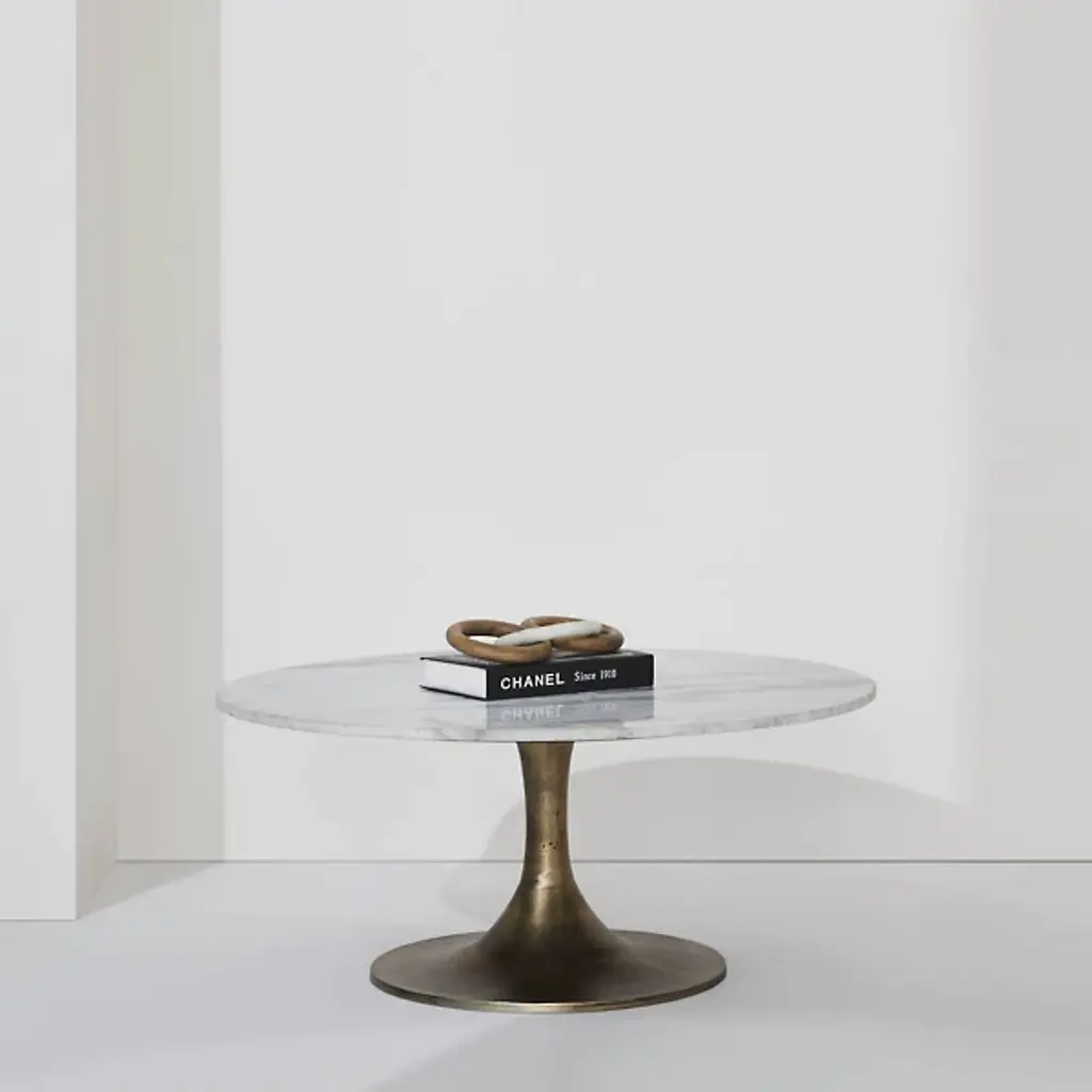 Make your living space luxurious with the Loveada Coffee Table by Renwil. A cast aluminum body elegantly tapers, ascending from a durable base. Your coffee table is crowned with an ornate tabletop of marble which takes on a streamlined, circular shape. The tabletop’s flat surface effortlessly supports your contained beverages and plates. Place this furnishment in an environment in need of stylistic revitalization. The Loveada Coffee Table will keep you invigorated.