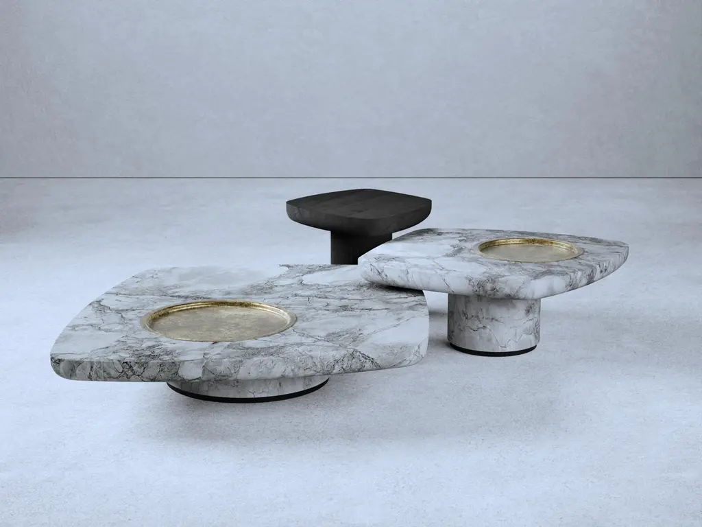 Low Blackbird Marble Coffee Table by Gio PaganiDimensions: D 120 x W 127 x H 26 cm.Materials: Superwhite marble and raw brass metal tray.In a fluid society capable of mixing infinite social and cultural varieties, the nostalgic search for reworked aesthetics that unite distant places, the desire for accents and refined materials, are the ingredients to create unique and timeless atmosphere.Gio Pagani is a multiple experience with a transversal and contaminated taste, which mixes designs rooted in memory, intercepting the new spirit of the times.“Being modern today means not having style barriers, being able to express eclectic languages and aesthetics, freely interpreting what affects you. As a designer, I immerse myself in a narrative experience, crafting objects that tell intimate stories. Drawing inspiration from diverse cultures and materials, i create an eclectic, romantic aesthetic that weaves together the past and the present.In this fluid society, nostalgia meets reimagined beauty, blending distant influences with soulful shapes and exquisite materials. Each piece I create is a harmonious symphony of proportions and a tribute to the memories that inspire me. From here I collect, rework, transform. It is an intimate journey where romance intertwines with rawness, luxury with simplicity, and tradition with daring, revealing a timeless beauty that transcends conventions.My philosophy is based on the charm of “disciplined excesses”. It is an elegance that is tinged with the barbaric, the luxury of not worrying.”