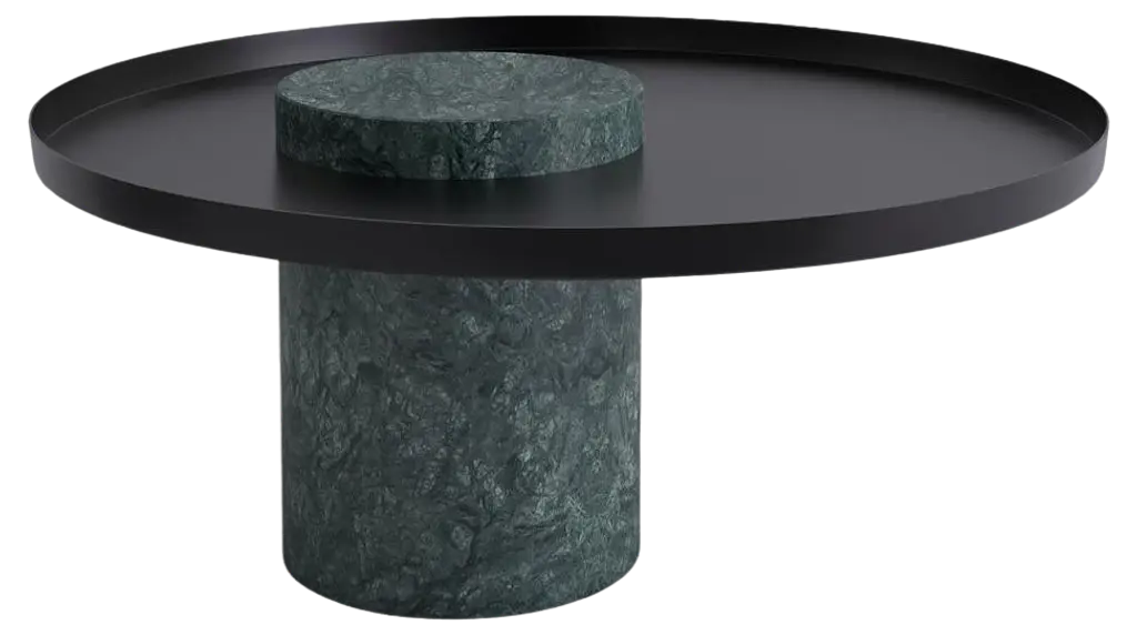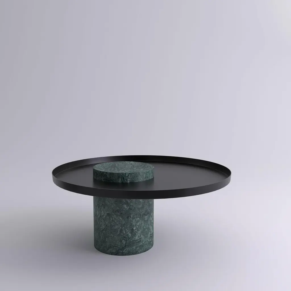 Low indian green marble contemporary guéridon, Sebastian HerknerDimensions: D 70 x H 33 cmMaterials: Indian Green marble, black metal trayThe salute table exists in 3 sizes, 4 different marble stones for the column and 5 different finishes for the tray for a virtually endless number of configurations. In addition, salute can be made bespoke with special colors materials and stones.Salute is a family of tables mixing marble and metal for a high visual impact. As an occasional table, Salute is the perfect companion to your iconic armchair or next to a comfy sofa, with its clean lines and yet strong personality and impact. As a combination of tables, it is a sculptural coffee table that you can customize and adapt both in dimensions and colors.Salute is a family of guéridon tables.Each element can be used alone or combined together to play with different heights and formats as well as combinations of materials. The strong presence of the marble columnis lightened by the suspended shape of the metal tray.Sebastian Herkner is the rising star of German design. He collaborates extensively with the best Italian and German brands (Moroso, ClassiCon,..) with product that share an tasteful and rigorous simplicity, with a focus on materials and textures.