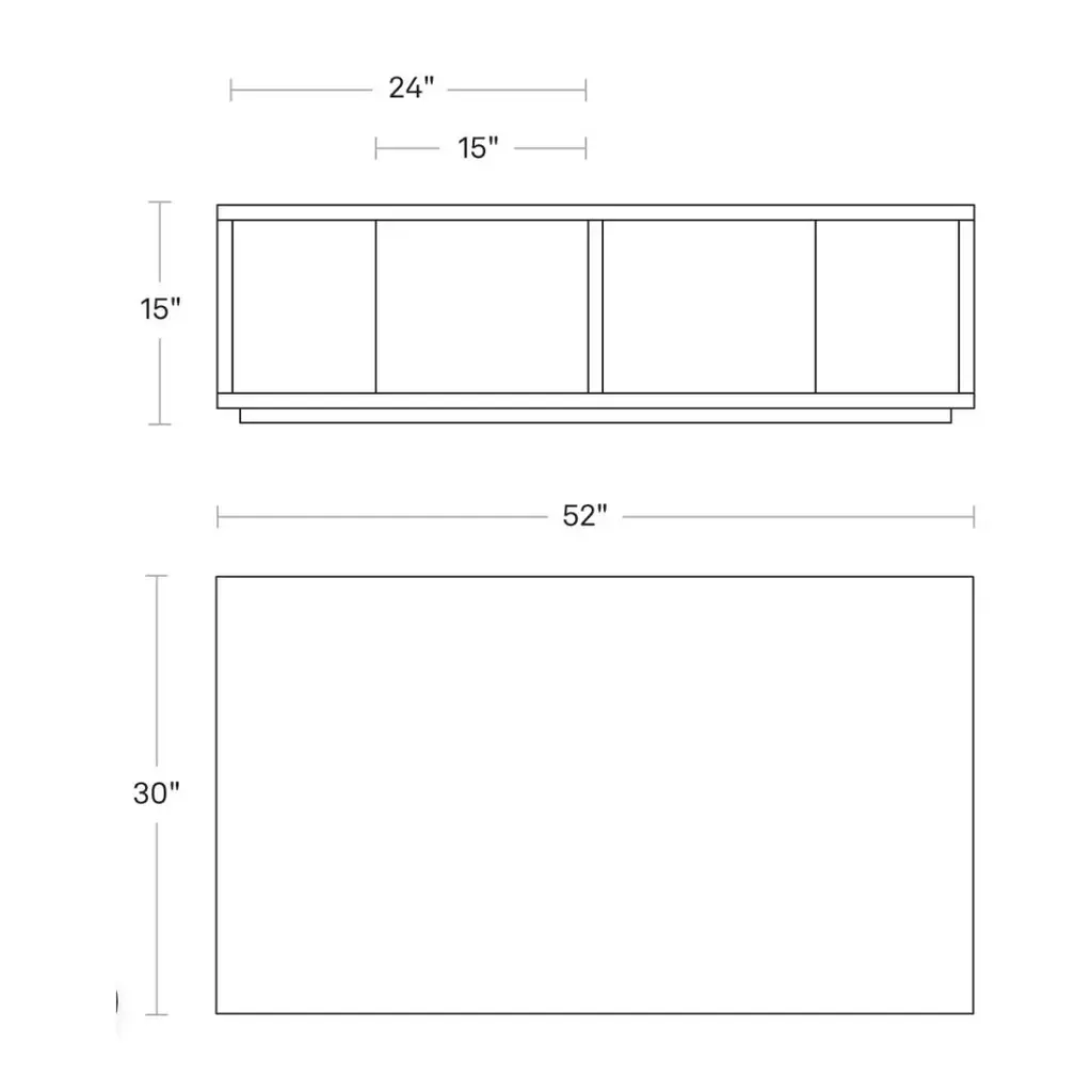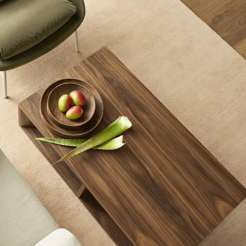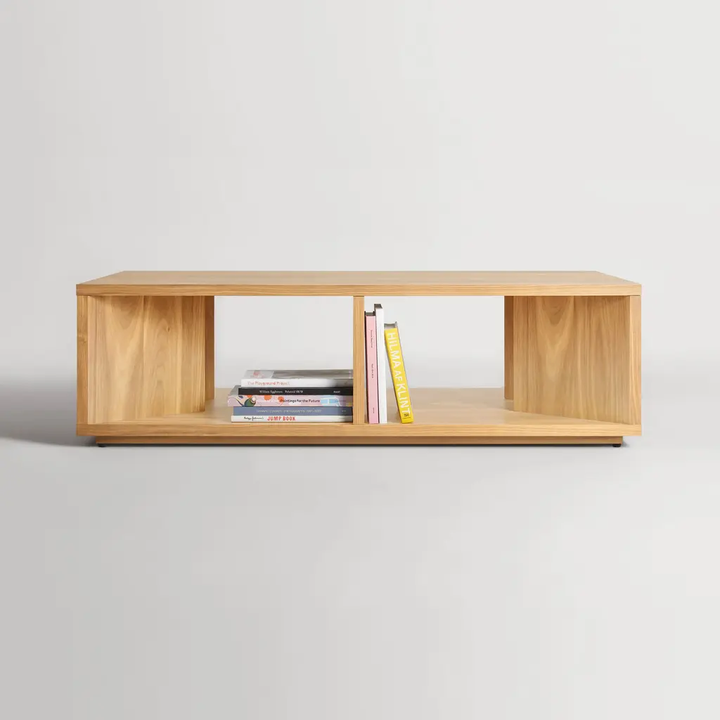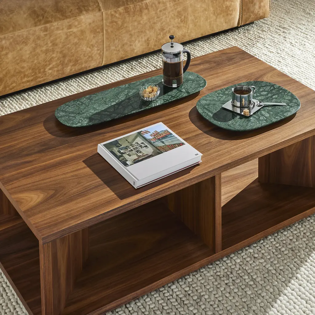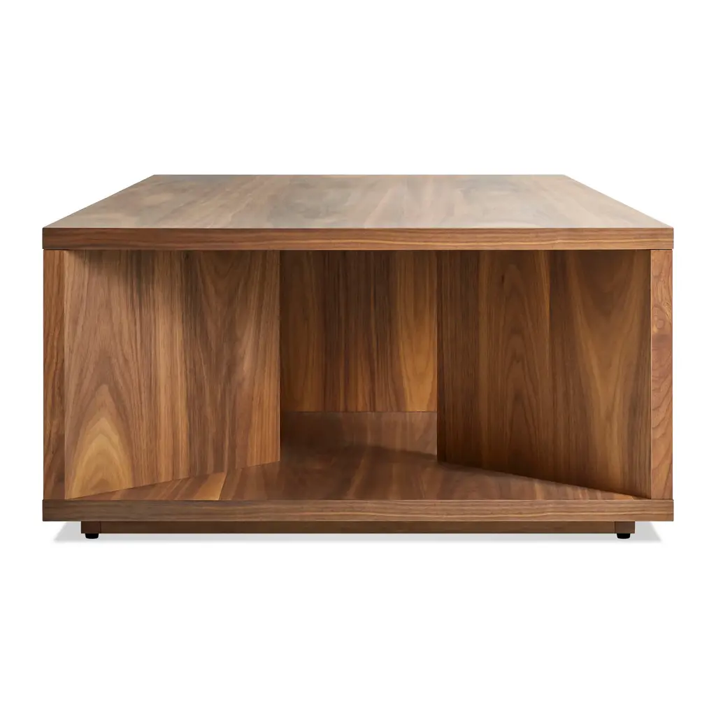 It's what's inside that counts. Elegant wood creates an expansive tabletop surface and alluring corridors below. Wood partitions provide an airy feel and casual entertainment from every angle. Admire it empty or jam-packed with your finest coffee table. Features