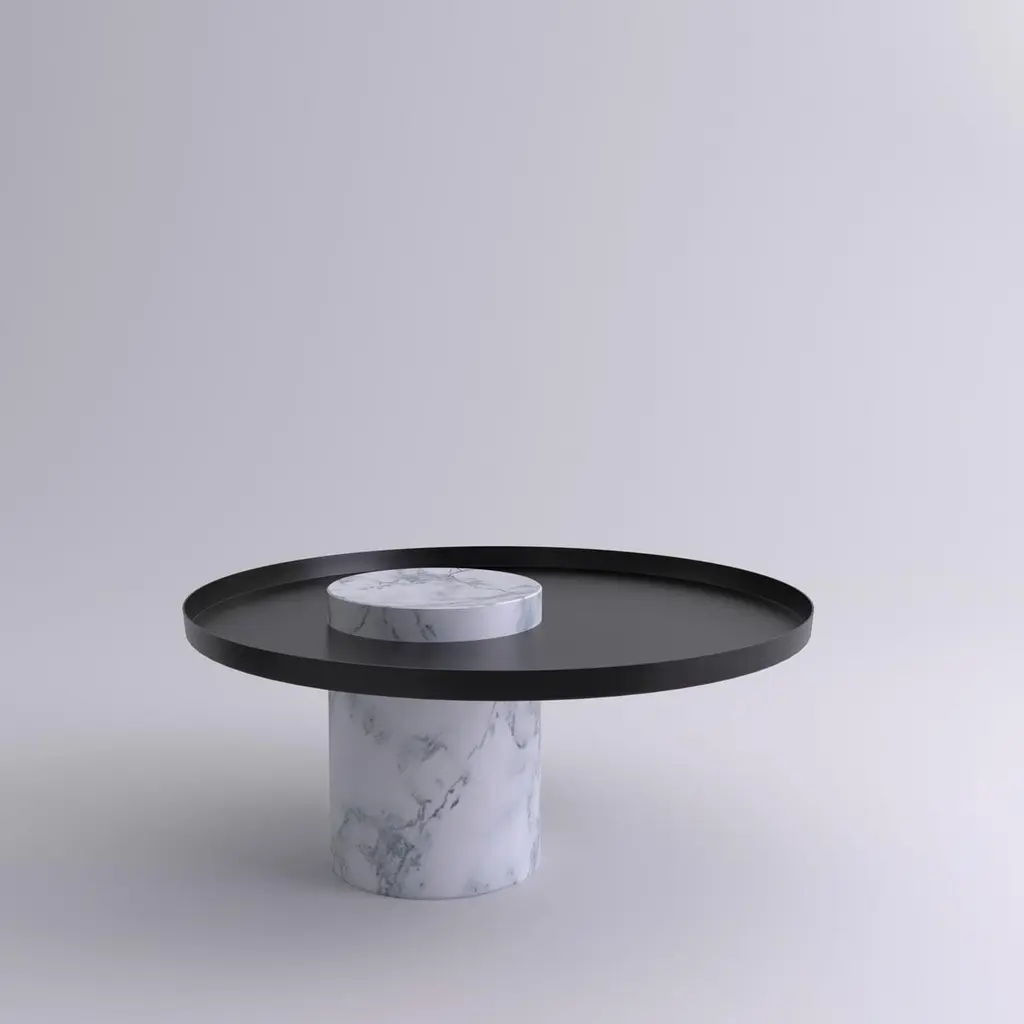 Low white marble contemporary guéridon, Sebastian HerknerDimensions: D 70 x H 33 cmMaterials: Pele de Tigre marble, black metal trayThe salute table exists in 3 sizes, 4 different marble stones for the column and 5 different finishes for the tray for a virtually endless number of configurations. In addition, salute can be made bespoke with special colors materials and stones.Salute is a family of tables mixing marble and metal for a high visual impact. As an occasional table, Salute is the perfect companion to your iconic armchair or next to a comfy sofa, with its clean lines and yet strong personality and impact. As a combination of tables, it is a sculptural coffee table that you can customize and adapt both in dimensions and colors.Salute is a family of guéridon tables.Each element can be used alone or combined together to play with different heights and formats as well as combinations of materials. The strong presence of the marble columnis lightened by the suspended shape of the metal tray.Sebastian Herkner is the rising star of German design. He collaborates extensively with the best Italian and German brands (Moroso, ClassiCon,..) with product that share an tasteful and rigorous simplicity, with a focus on materials and textures.