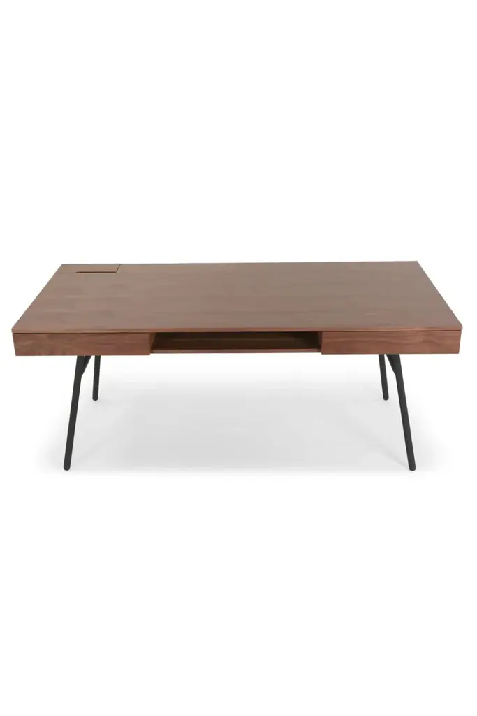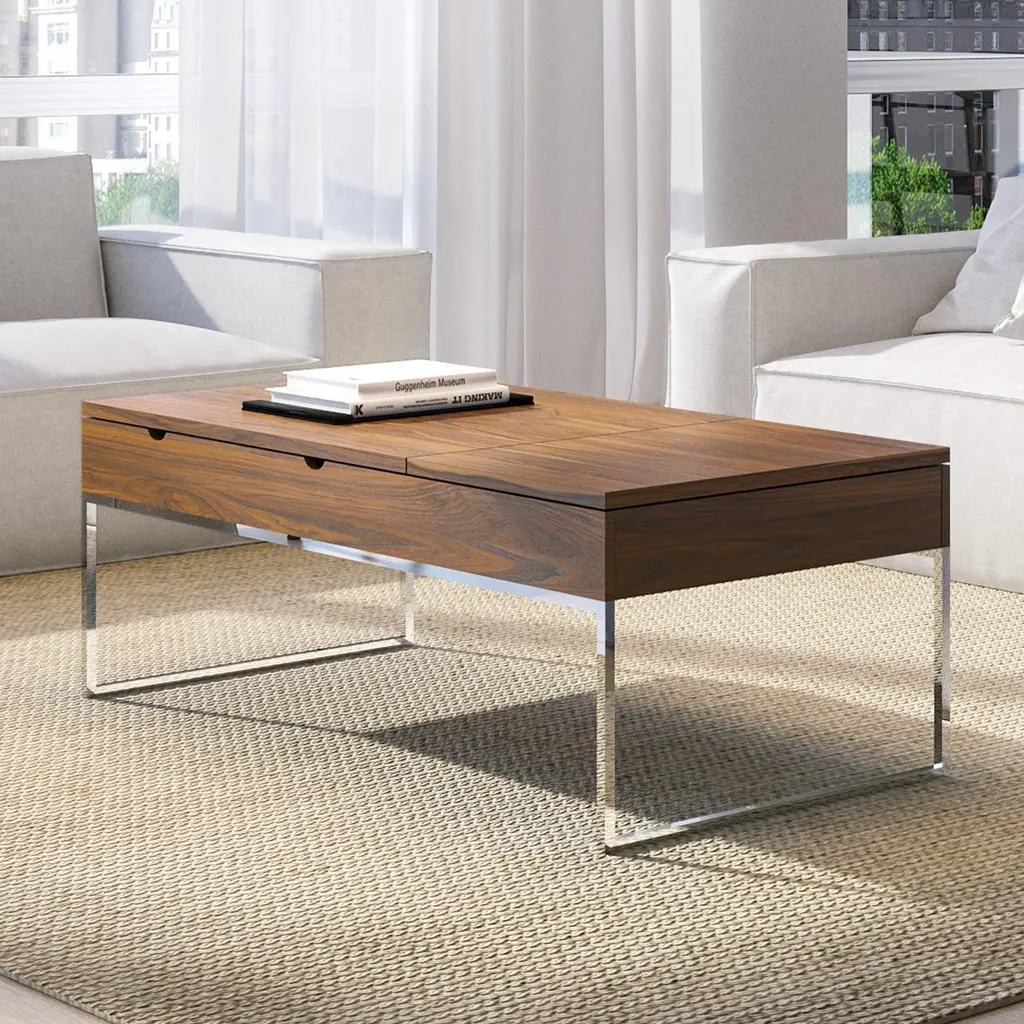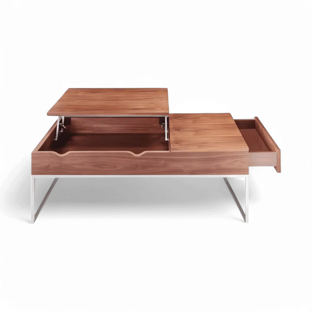 With a rectangular profile the Lubeck Contemporary Coffee Table Walnut combines simple modern design, with classic sophistication.Decorating a small space doesn't have to mean sacrificing on style.This modern table offers functional storage space for the living room in an attractive modern style.With one sliding drawer, and another fully functional lifting mechanism, storing items have never been easier.Clean minimal lines and a walnut wood finish make up this stunning table.Elegant, Zen and simple, this piece of furniture is sure to attract attention. *Natural Wood Grain Color Variation. No item will have the same grain color, finish, or wood knots due to natural factors.Wood, Stainless Steel Legs, 2 Drawers