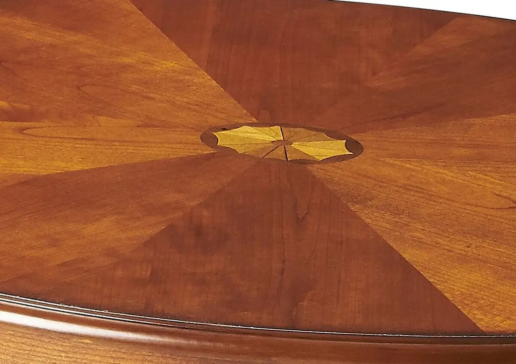 Timeless in its allure, this elegant table captivates with its delicate veneer inlay as a focal point and exquisitely tapered legs. Meticulously crafted from poplar hardwood solids and wood products, it embodies sophistication and grace, making it a perfect centerpiece for any refined living space.