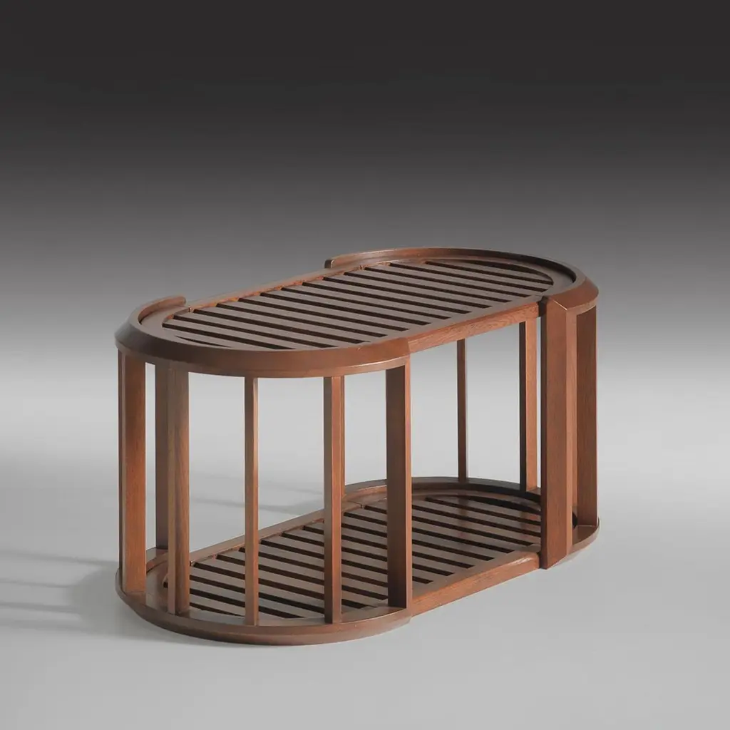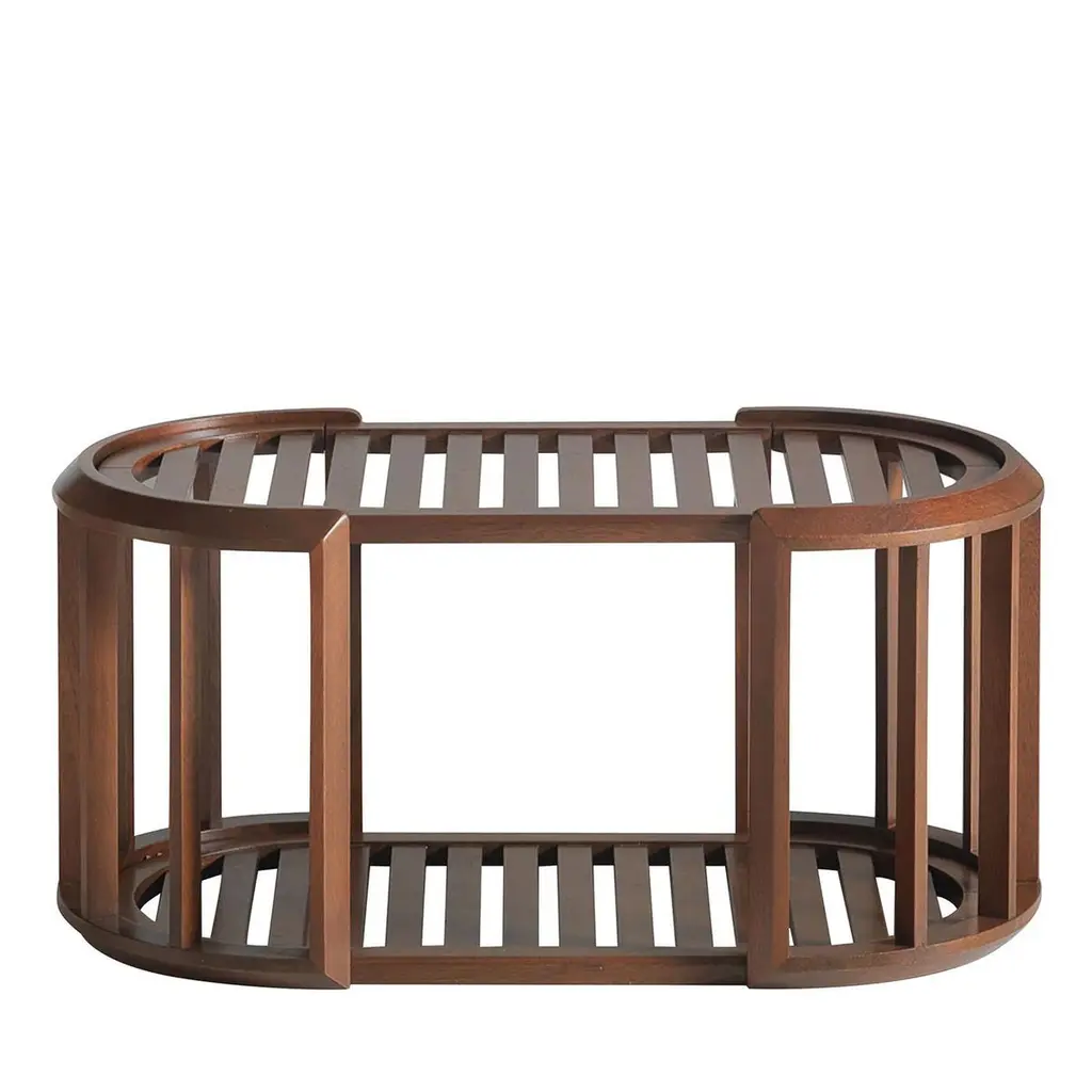 The Lucio coffee table crafted in iroko and designed for outdoor use, features a slatted top and bottom shelf that provide practical storage and display space. The structure is characterized by smooth rounded edges and vertical supports that emphasize its contemporary silhouette while ensuring stability. Also available in a darker finish, it offers a functional and stylish addition to exterior living areas. Contact the Concierge for more details.