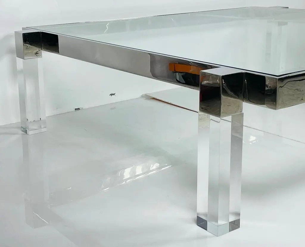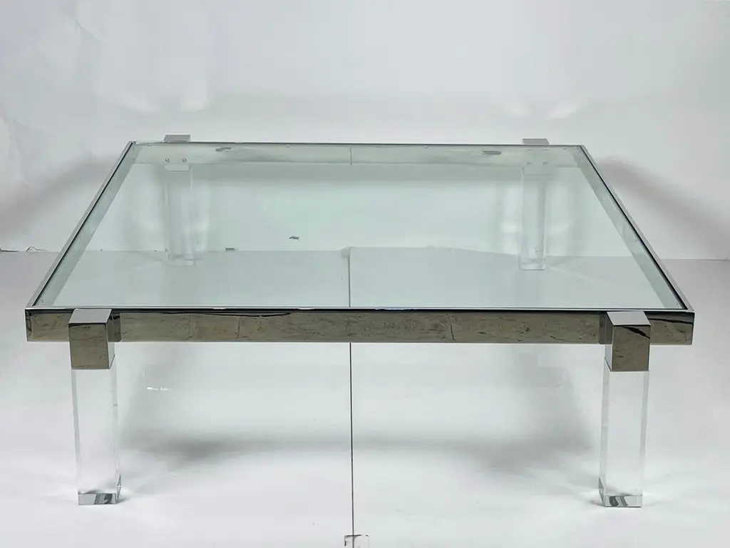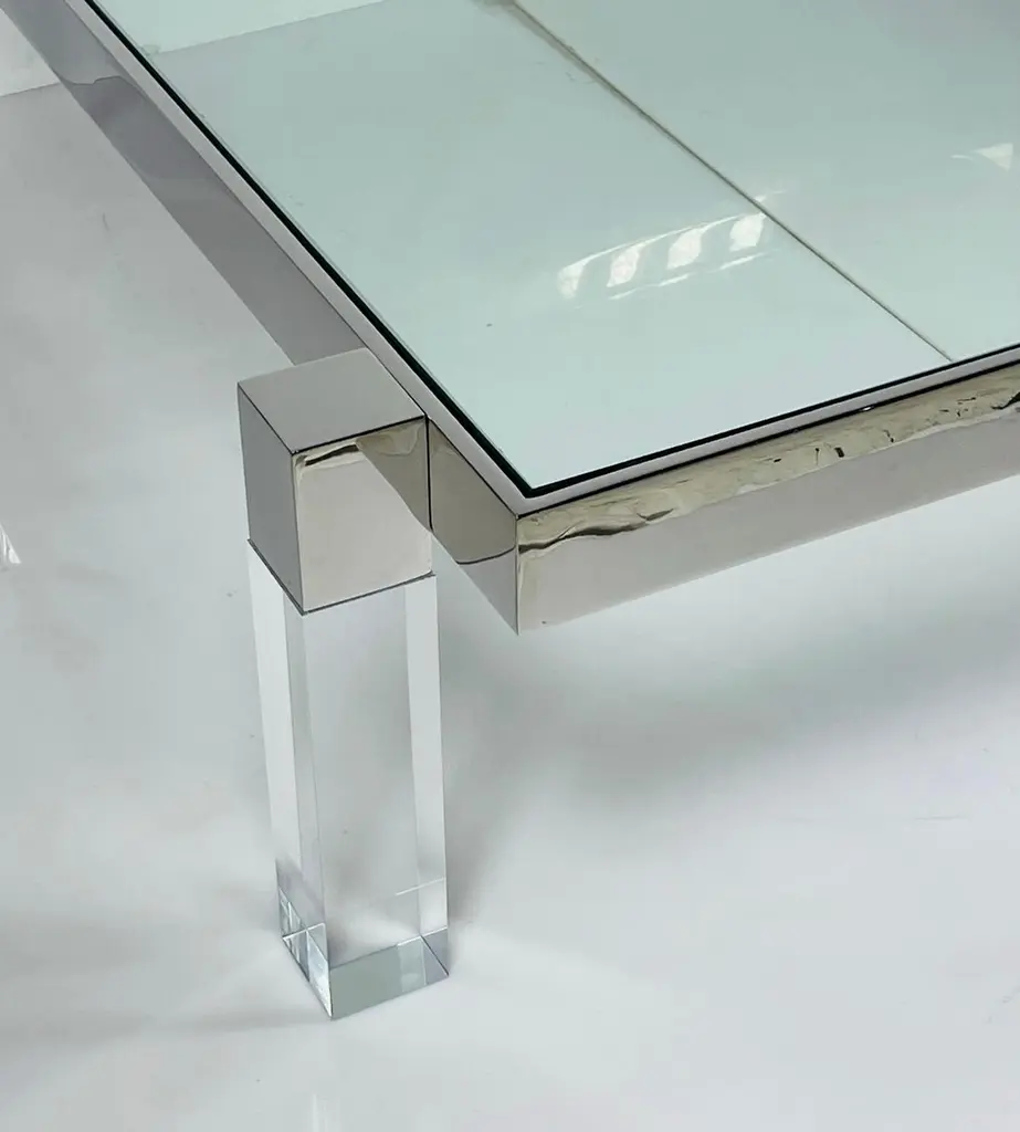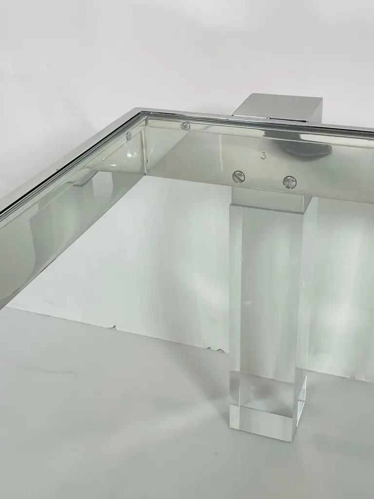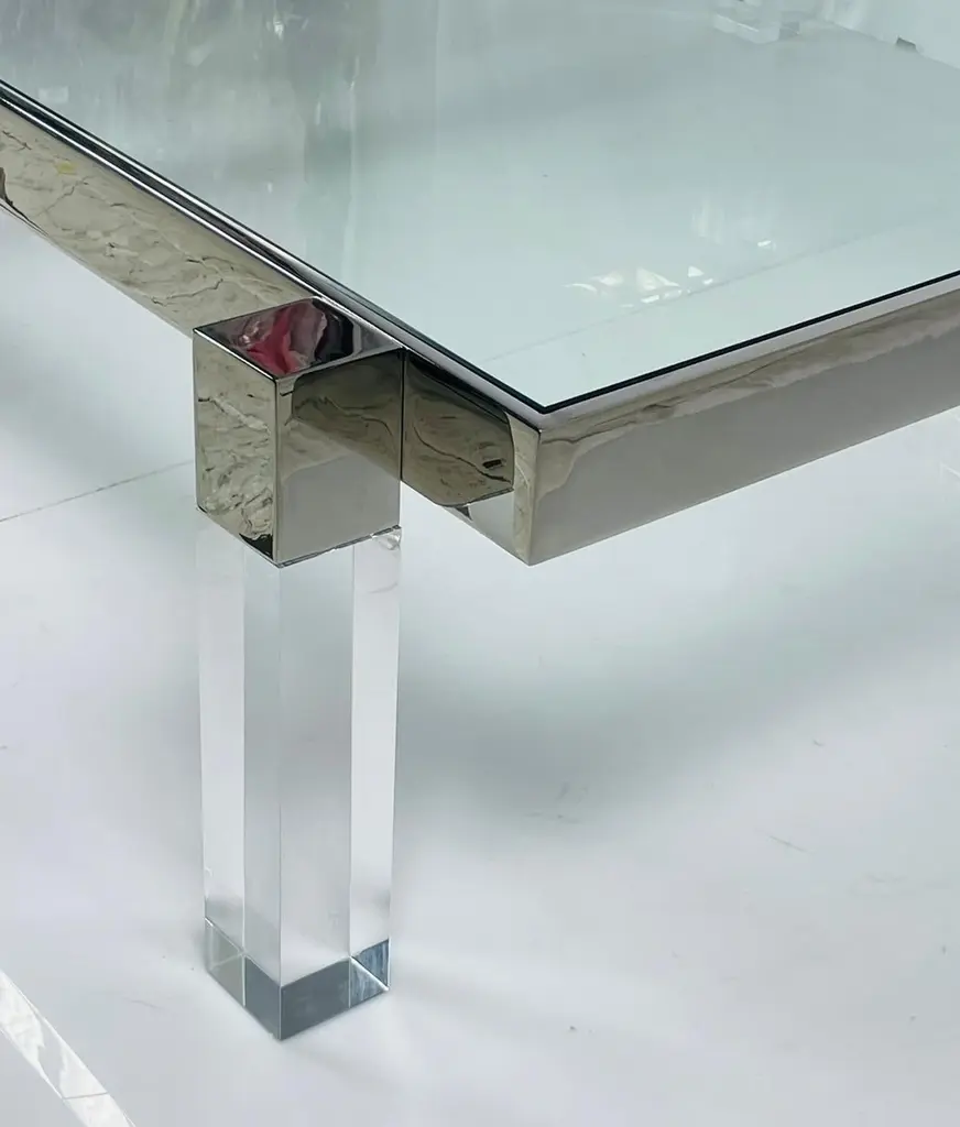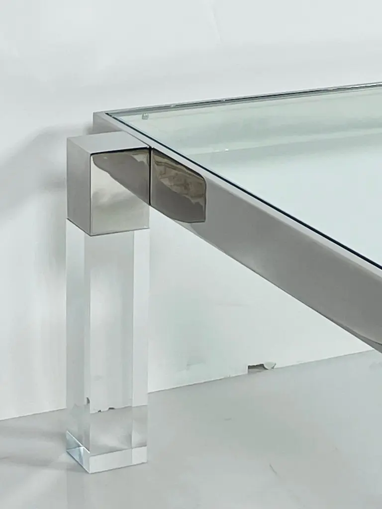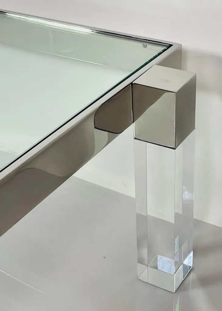 Stunning coffee table designed and manufactured by Amparo Calderon Tapia.The piece is hand crafted in Los Angeles, the frame is solid Stainless steel which is then highly polished close to a mirror finish.The legs are 3 inch square solid Lucite fitted into the stainless steel caps.The top is polished edge glass.The table is signed and dated by the artist.Measurements:60 inches wide (legs side) x 54 inches deep x 16 inches high.The top is 54" square if you don't include the legs.14These tables can be customized and made in other metals, sizes and materials, please contact us directly if you have an inquiry to a particular size or material.