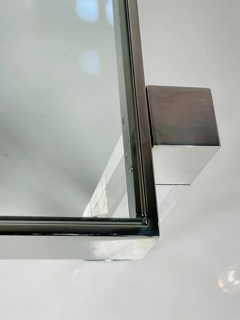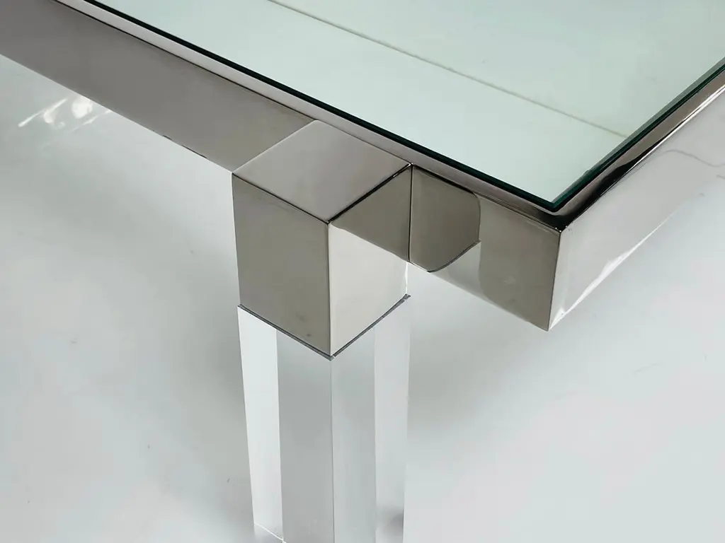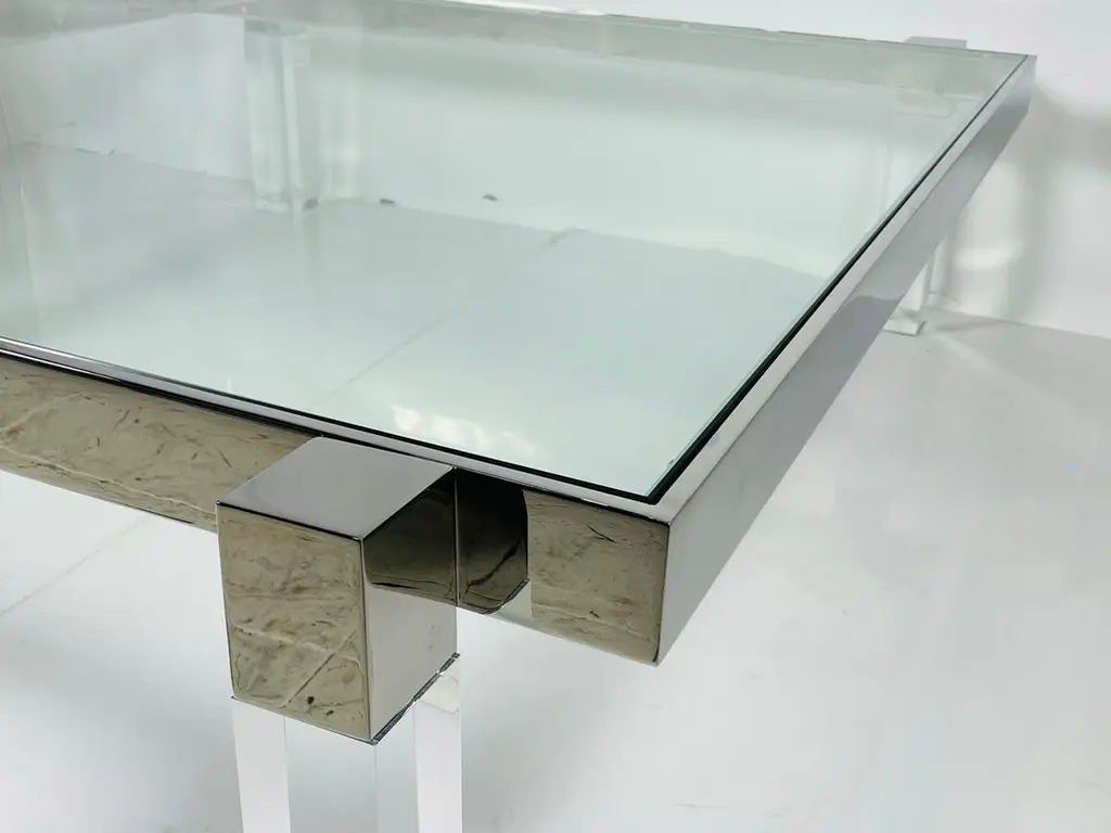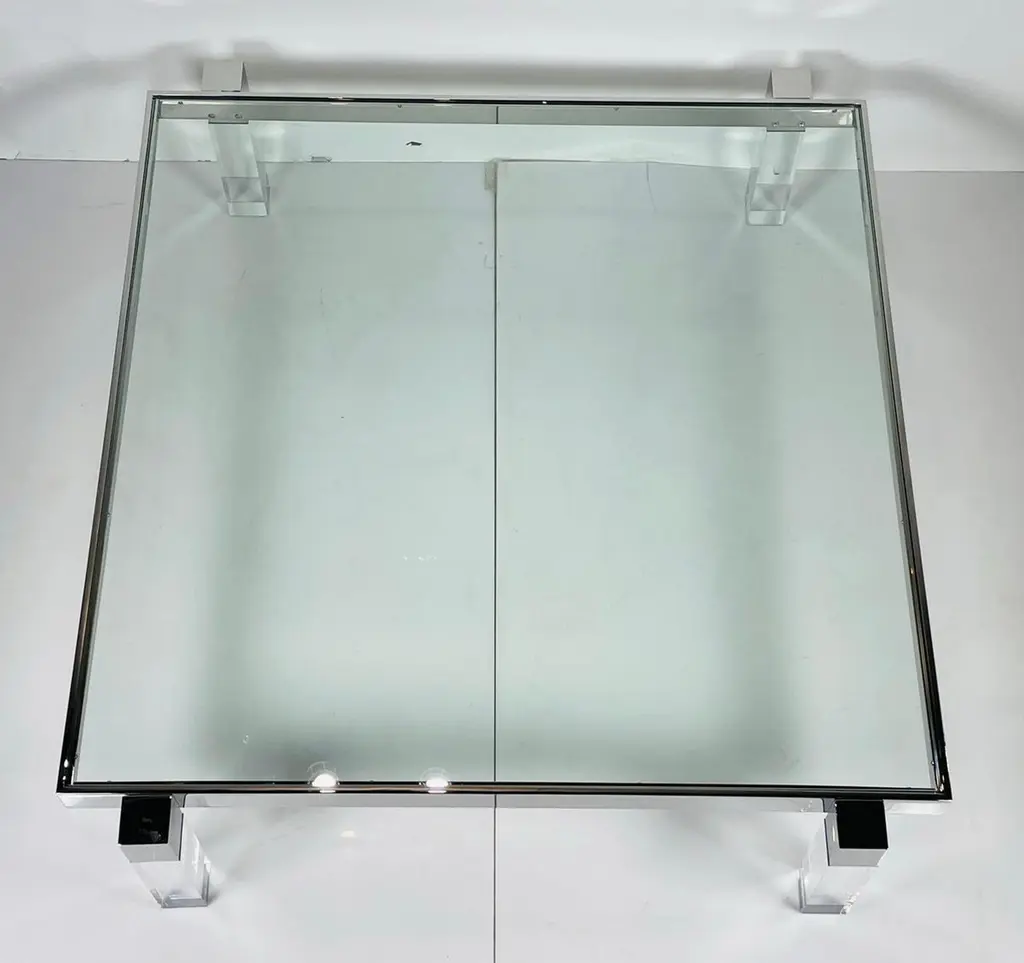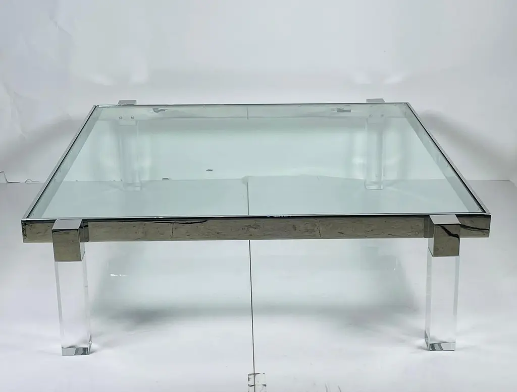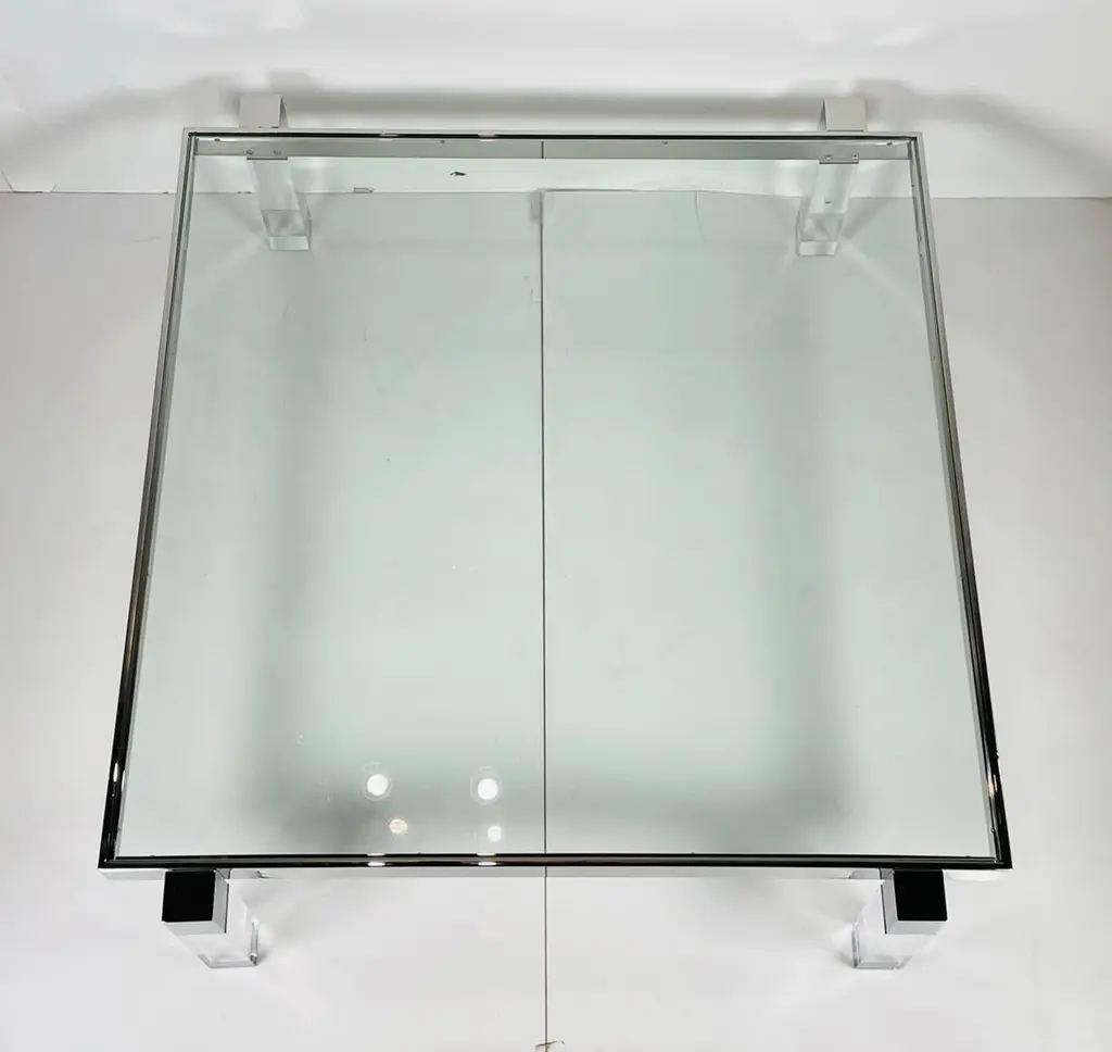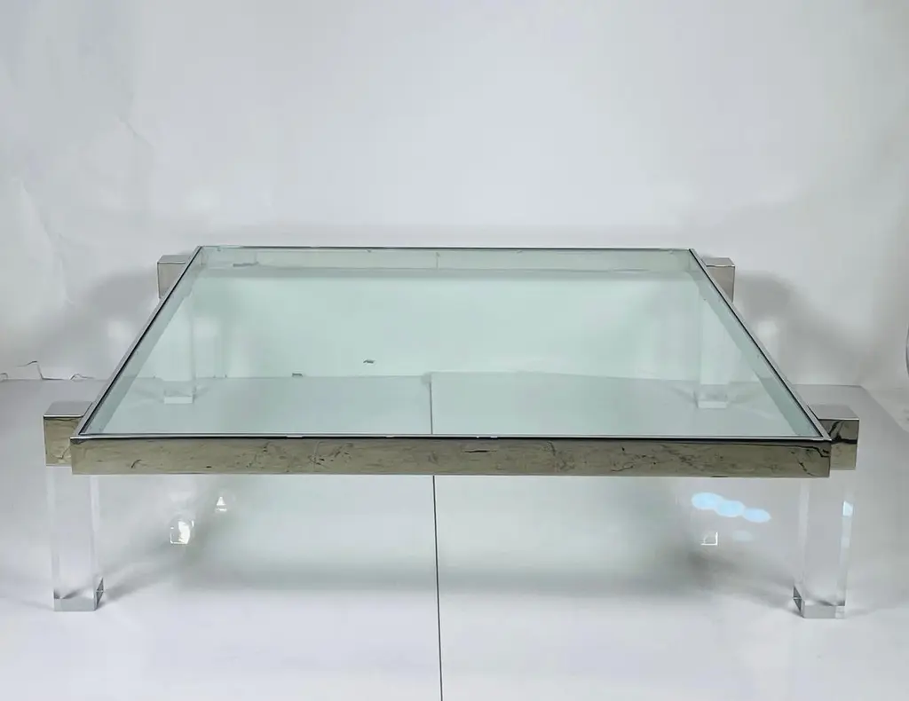 Stunning coffee table designed and manufactured by Amparo Calderon Tapia.The piece is hand crafted in Los Angeles, the frame is solid Stainless steel which is then highly polished close to a mirror finish.The legs are 3 inch square solid Lucite fitted into the stainless steel caps.The top is polished edge glass.The table is signed and dated by the artist.Measurements:60 inches wide (legs side) x 54 inches deep x 16 inches high.The top is 54" square if you don't include the legs.14These tables can be customized and made in other metals, sizes and materials, please contact us directly if you have an inquiry to a particular size or material.