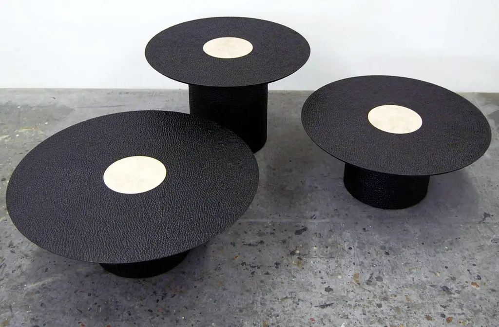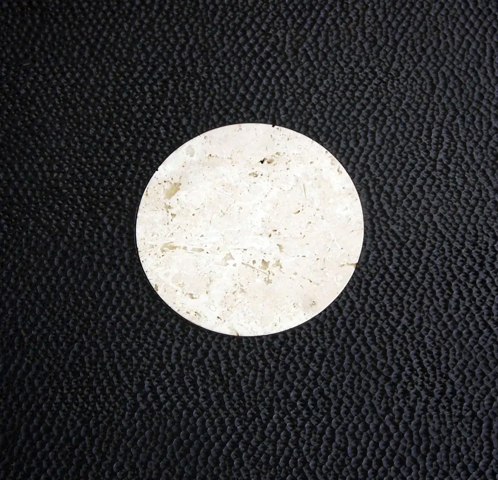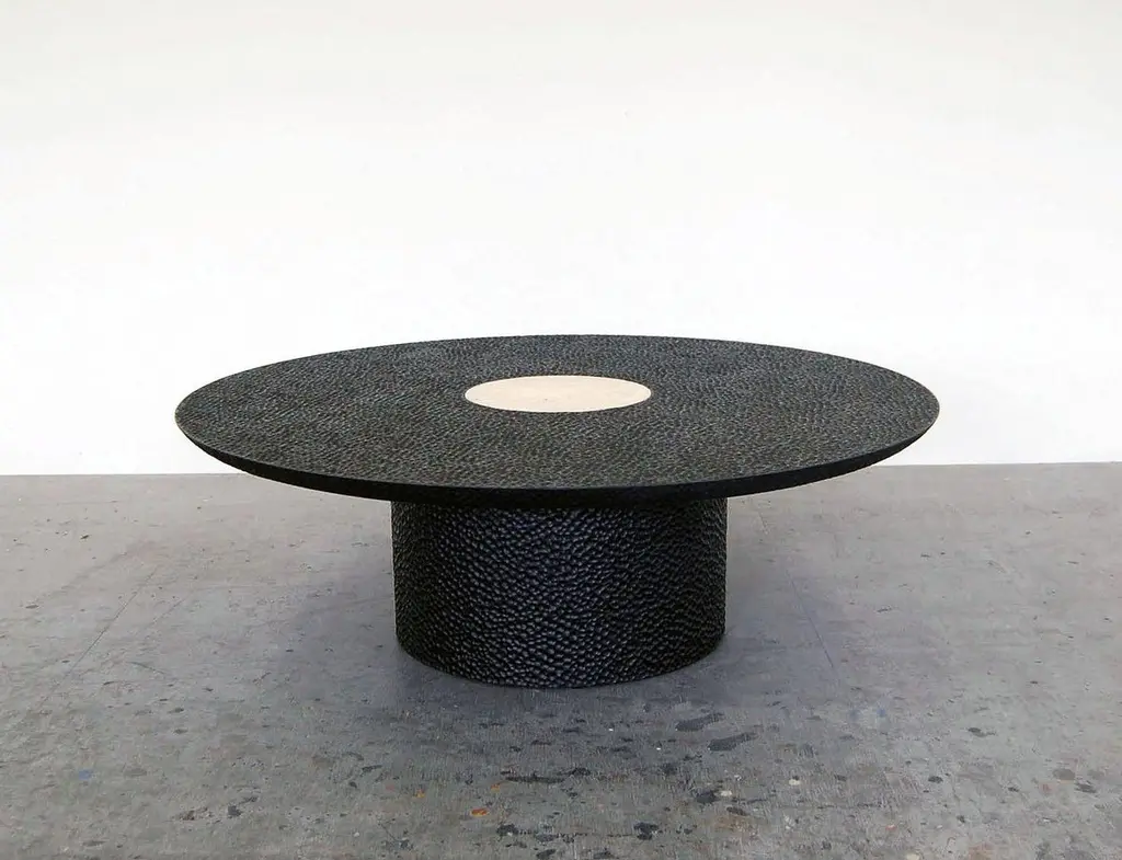 Luna coffee table sculpted by John Eric Byers.Dimensions: 40.6 x diameter 122 cm.Materials: carved blackened maple, travertine.All works are individually handmade to order.John Eric Byers creates geometrically inspired pieces that are minimal, emotional, and modernly refined.John's individually handmade work is guided by purity in form, surface texture, structure, and respect for use of materials. Heralded as a leading American artist working in wood, permanent collections include the Smithsonian American Art Museum, the Philadelphia Museum of Art and the Museum of Arts and Design in NYC. Numerous awards include a Louis Comfort Tiffany Foundation Award, New York Foundation of the Arts Awards, and inclusion in the Smithsonian's Oral Archives of American Arts.