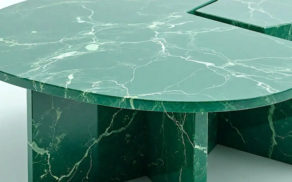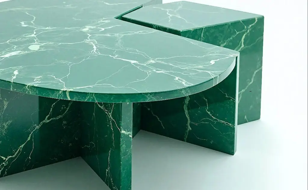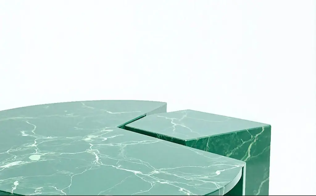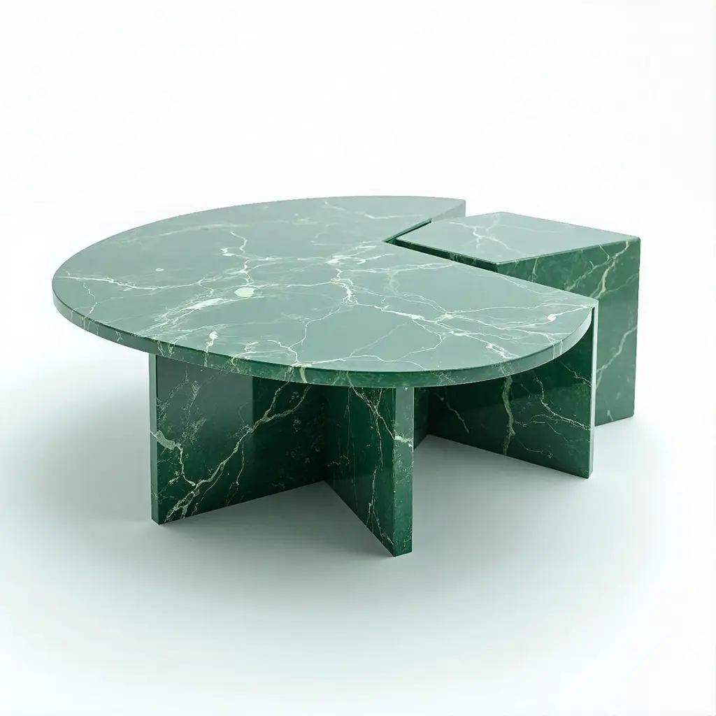 The Luna Coffee Table is a bold expression of sculptural elegance, crafted from veined Indian green marble. This mid-century inspired coffee table is defined by its abstract geometric composition, where a semi-circular top interlocks with a removable quarter-piece and architectural cross-panel base.Hand-finished to a high polish, the marble surface reflects natural light while showcasing the intricate white veining unique to each slab. The innovative form not only delivers visual intrigue but also offers versatile styling opportunities—ideal for both contemporary minimalist interiors and statement-driven living rooms.Luna seamlessly fuses sleek modern design with the timeless weight and sophistication of natural stone, making it a true collector's piece for those who value design, craftsmanship, and material authenticity.Dimensions:Overall Diameter: 42 inchesHeight: 16 inchesMaterial Thickness: ~1 inchMaterials: Indian Green MarbleFinish: High-polish natural stoneDesign Style: Mid-Century Modern, Contemporary, SculpturalCustomization: Available upon request (size, material)Origin: India