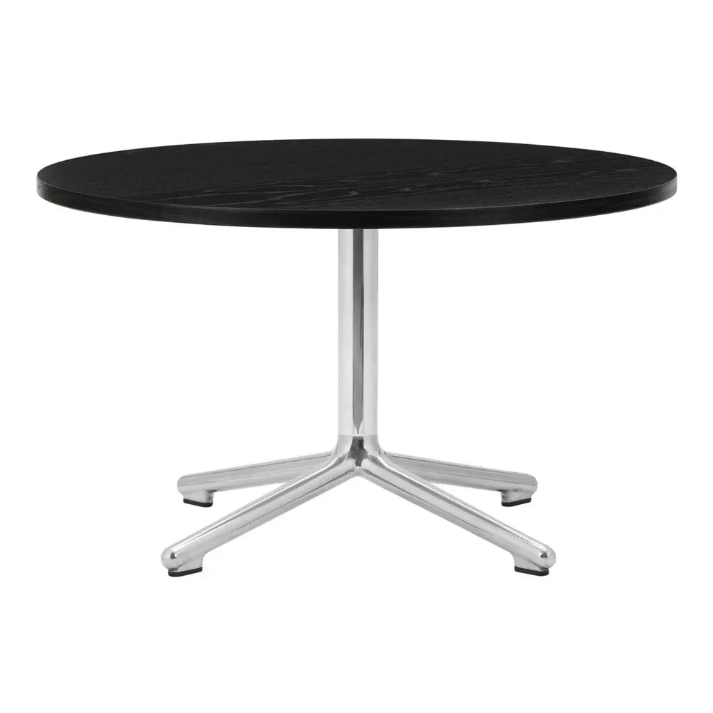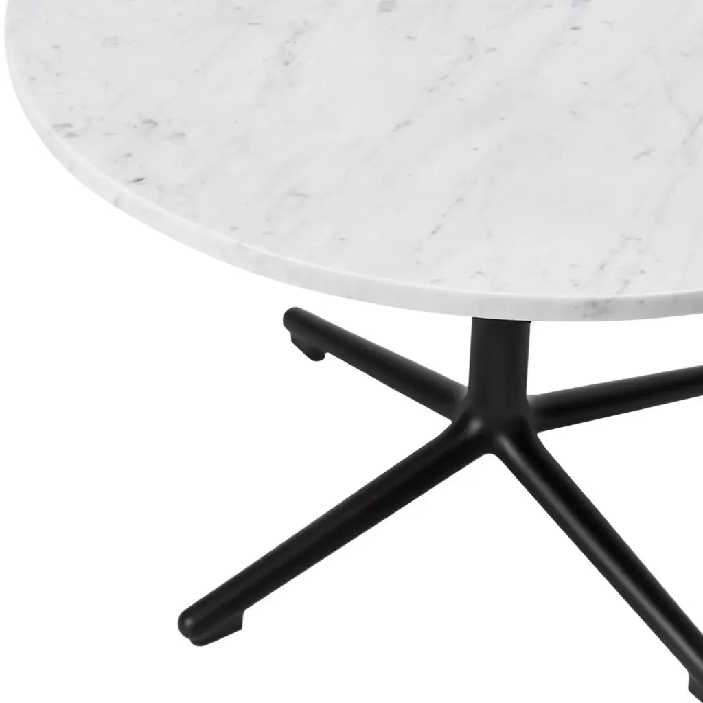 Lunar table consist of a casted aluminum center-base with four legs available in polished aluminum or powder coated black aluminum. The tabletop comes in marble or oak veneer. Lunar table is available in two heights. The marble tabletops are treated with a surface treatment that penetrates into the material and thereby provides a long-term protection. The surface should not be exposed to acidic foods or beverages, which can leave stains on the surface.