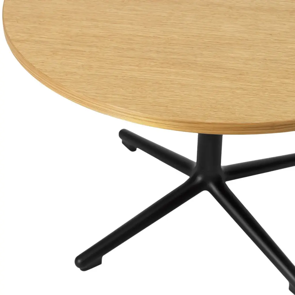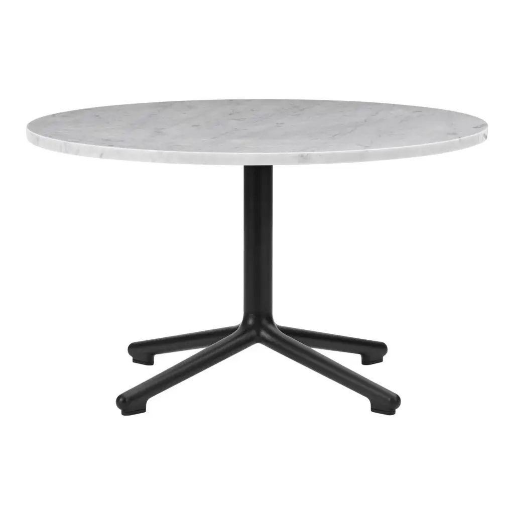 Lunar table consist of a casted aluminum center-base with four legs available in polished aluminum or powder coated black aluminum. The tabletop comes in marble or oak veneer. Lunar table is available in two heights. The marble tabletops are treated with a surface treatment that penetrates into the material and thereby provides a long-term protection. The surface should not be exposed to acidic foods or beverages, which can leave stains on the surface.