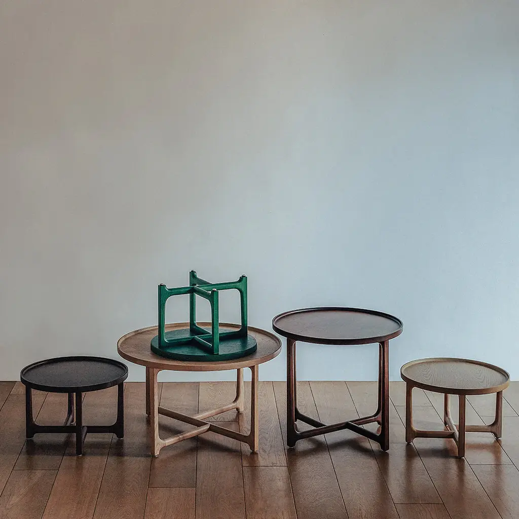 The Lyrical collection is an homage to the artistry of woodcraft. At first glance the round side tables are deceptively simple, a solid wood top with a wooden structure support. Details such as the subtle curvature of the edge profile, the foot that slightly elevates the frame, the asymmetrical offset of the secondary legs, the lip on the edge of the table top - these reveal a certain level of craftsmanship and bring a touch of sophistication. Along with a selection of color finishes and sizes, the minimal yet refined design makes the lyrical coffee table an everyday table for many settings: commercial or domestic, casual or luxe, playful or neutral.