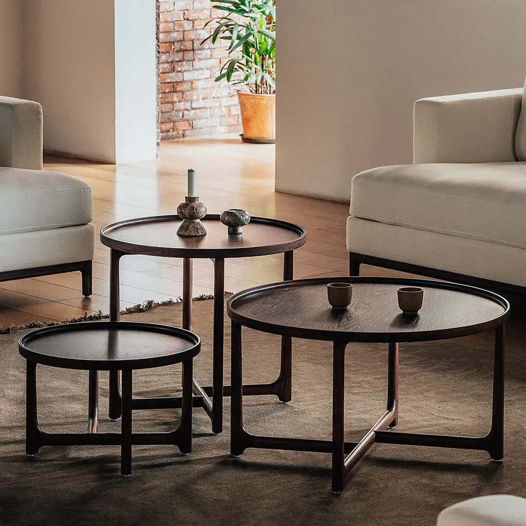 The Lyrical collection is an homage to the artistry of woodcraft. At first glance the round side tables are deceptively simple, a solid wood top with a wooden structure support. Details such as the subtle curvature of the edge profile, the foot that slightly elevates the frame, the asymmetrical offset of the secondary legs, the lip on the edge of the table top - these reveal a certain level of craftsmanship and bring a touch of sophistication. Along with a selection of color finishes and sizes, the minimal yet refined design makes the lyrical coffee table an everyday table for many settings: commercial or domestic, casual or luxe, playful or neutral.