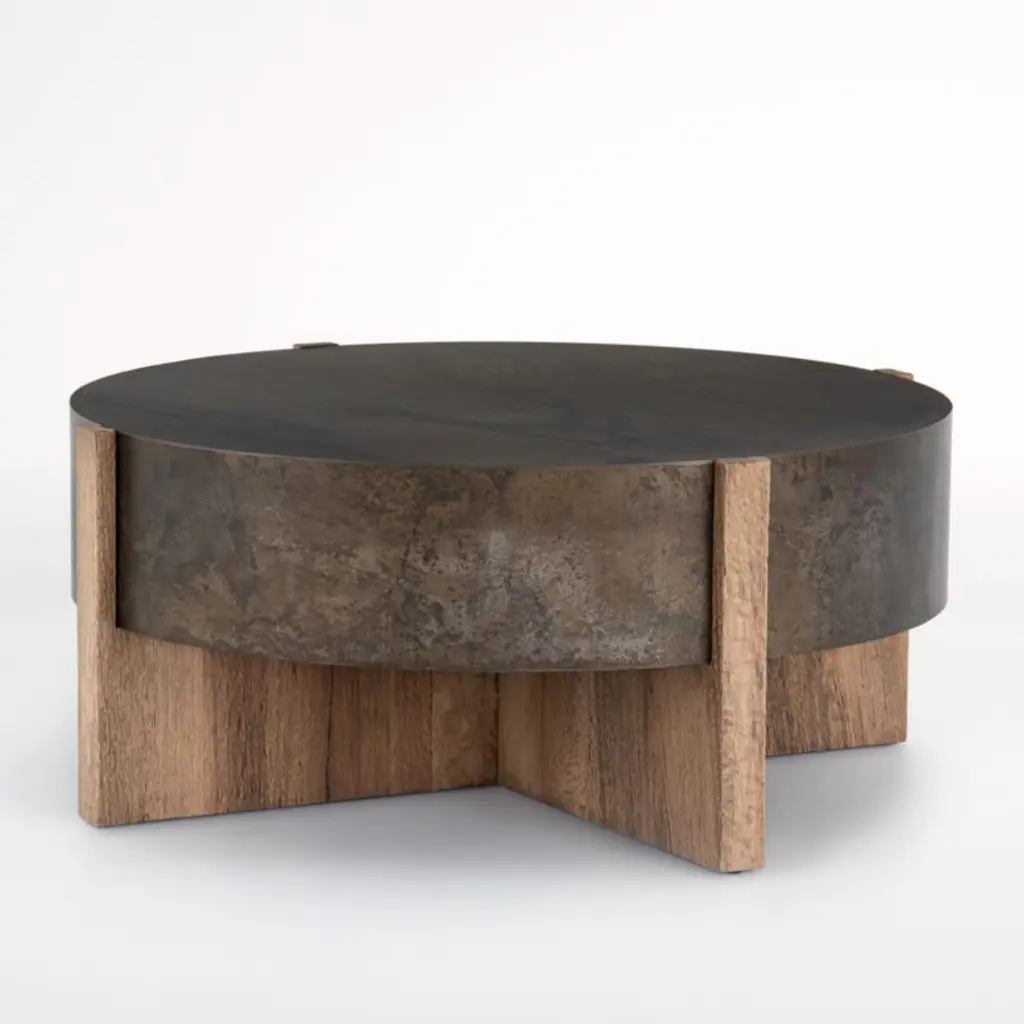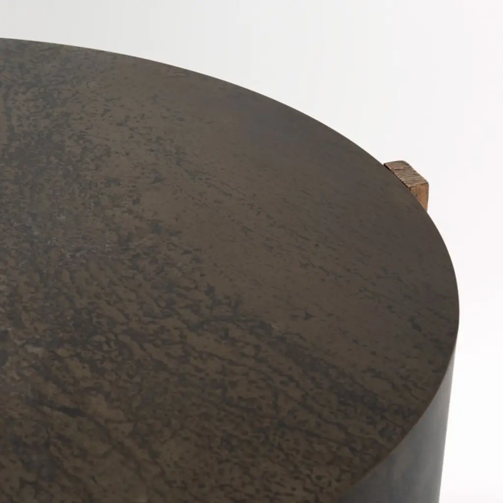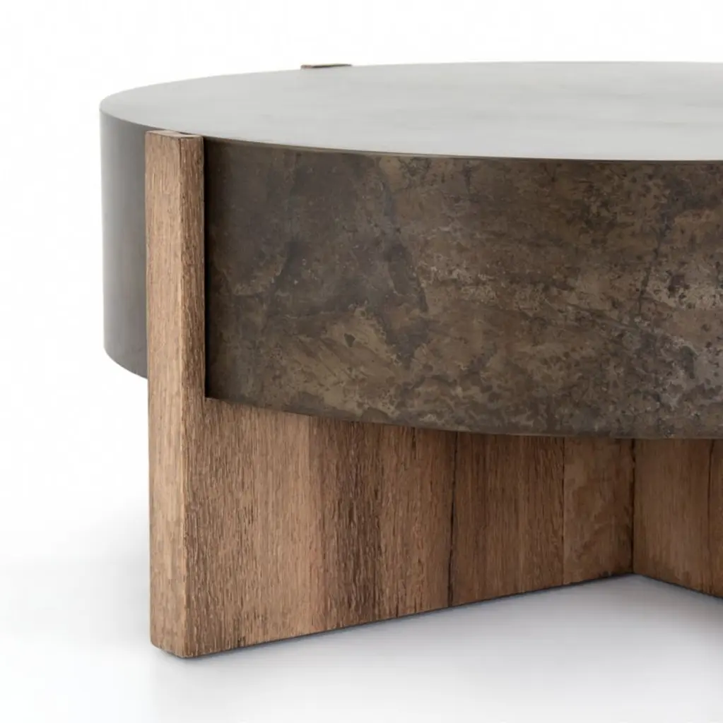 Set like a gem in a ring, Mackinley's round tabletop of distressed iron is cradled by a rustic, character-rich oak base. This coffee table mixes materials in a sculptural design that's organic in spirit. Exuding industrial character, the thick, disk-like top displays the unique patina created by the distressing process that perfectly complements the rustic feel of the richly grained wood.