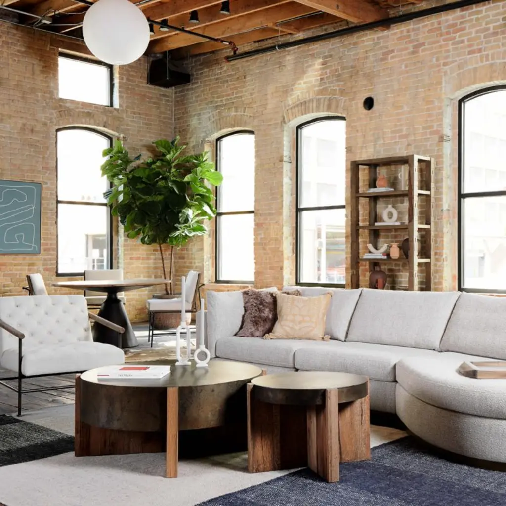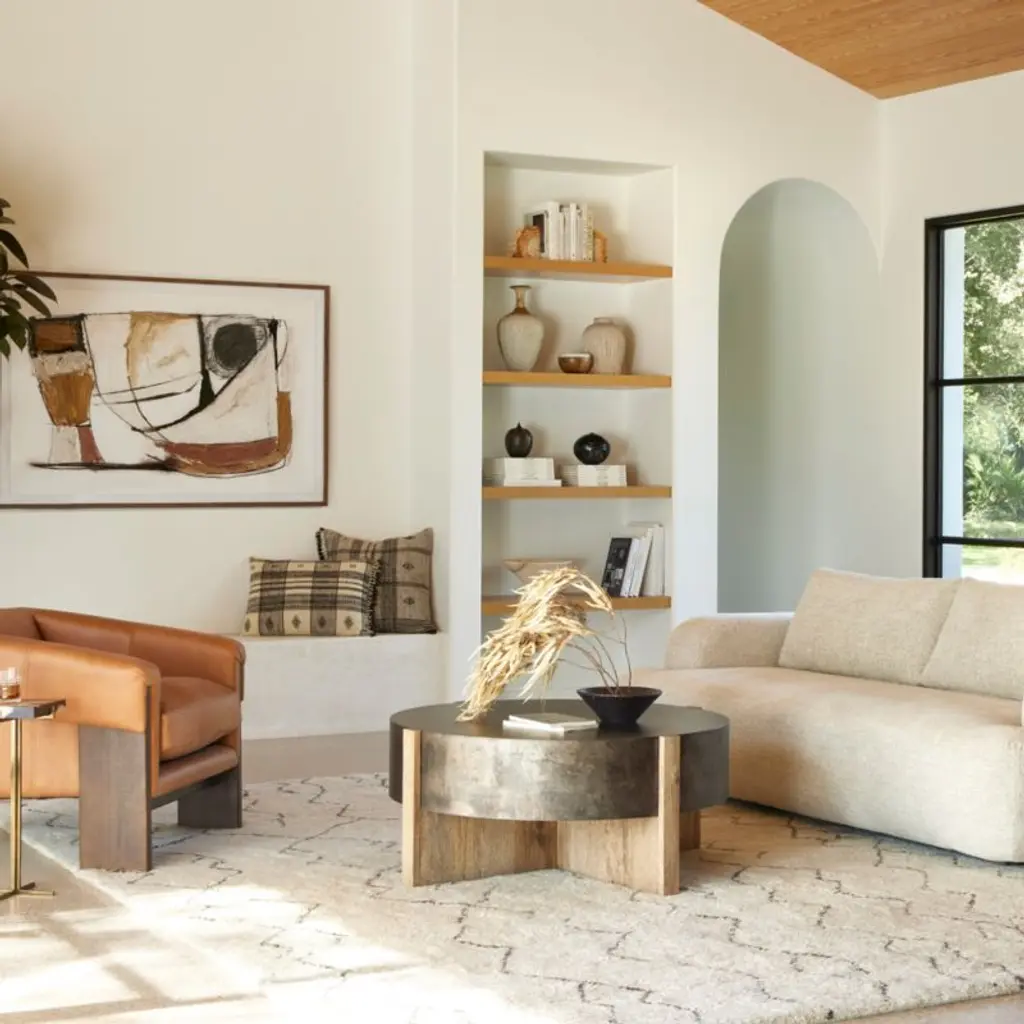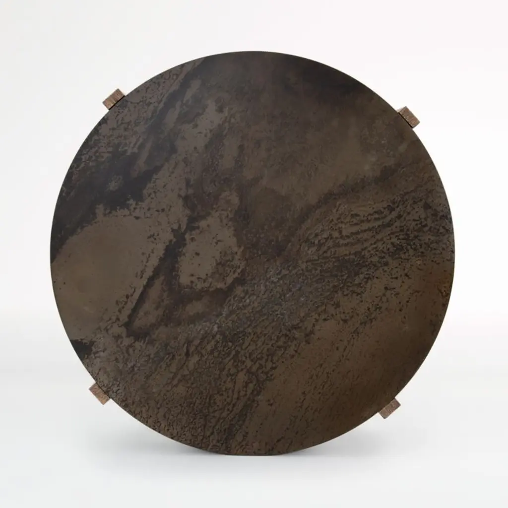 Set like a gem in a ring, Mackinley's round tabletop of distressed iron is cradled by a rustic, character-rich oak base. This coffee table mixes materials in a sculptural design that's organic in spirit. Exuding industrial character, the thick, disk-like top displays the unique patina created by the distressing process that perfectly complements the rustic feel of the richly grained wood.