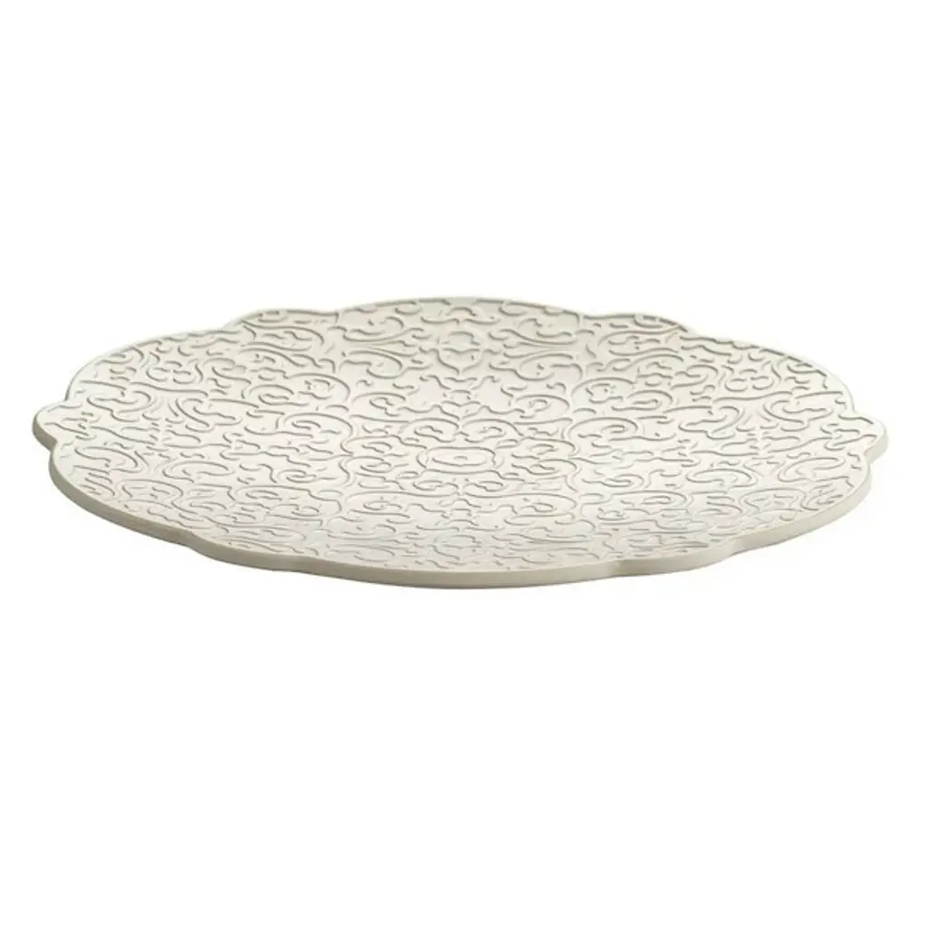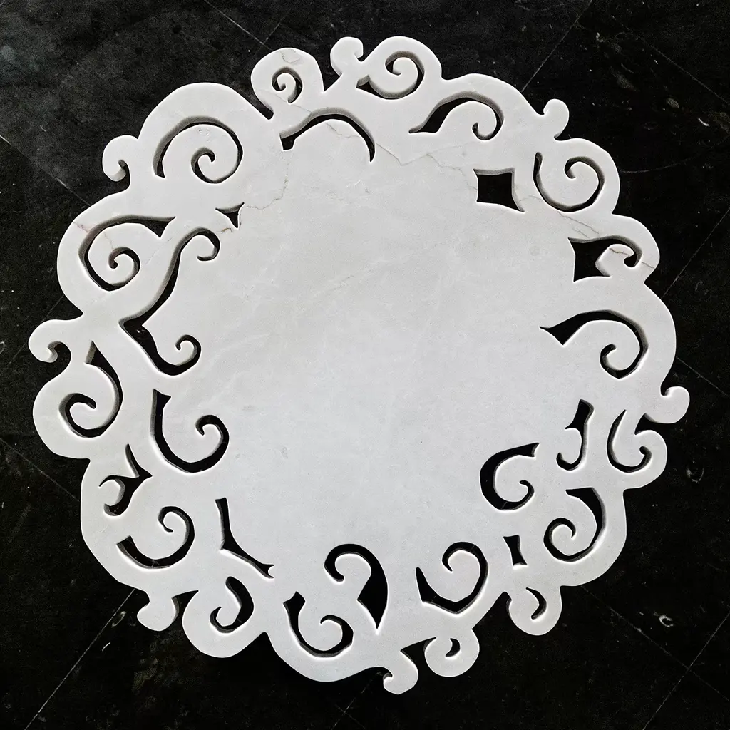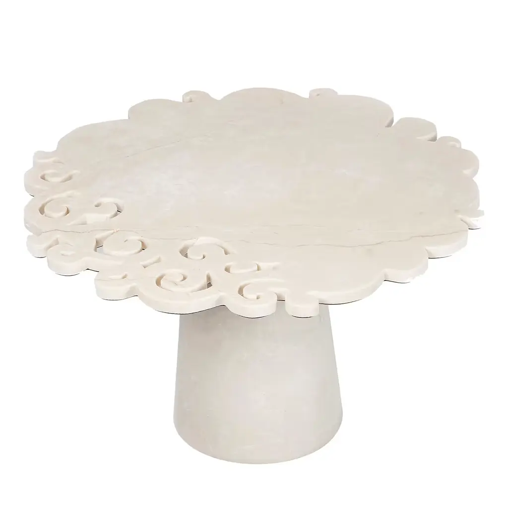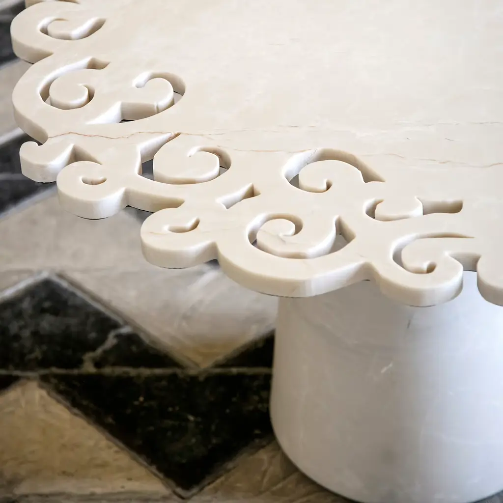 A tribute to the Baroque decorative style typical of the Sicilian region, this extraordinary 2021 design by Roberto Semprini will make an elegant statement in a modern interior as well as in a traditional decor style. Entirely handcrafted of white marble, its dynamic and sinuous allure is rooted in the marvelous macramé-style top, lending it a lavish and plush flair.