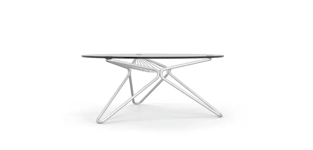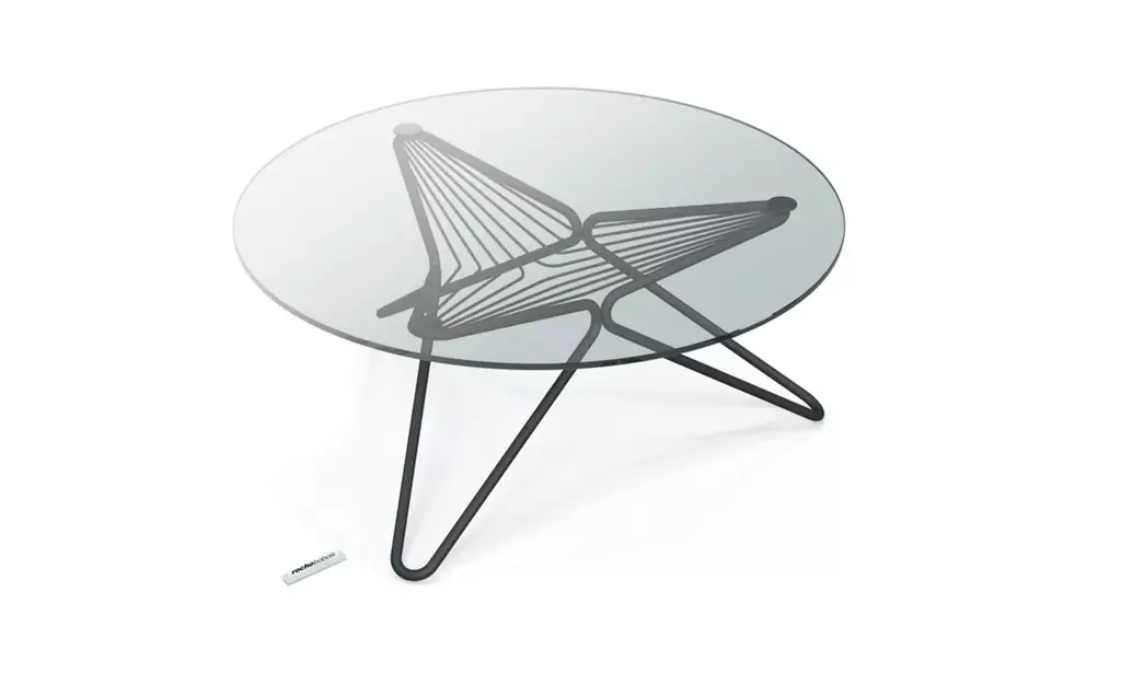 Tube structure in steel, epoxy lacquer finish (different colours available), with top in 12 mm-thick natural glass.