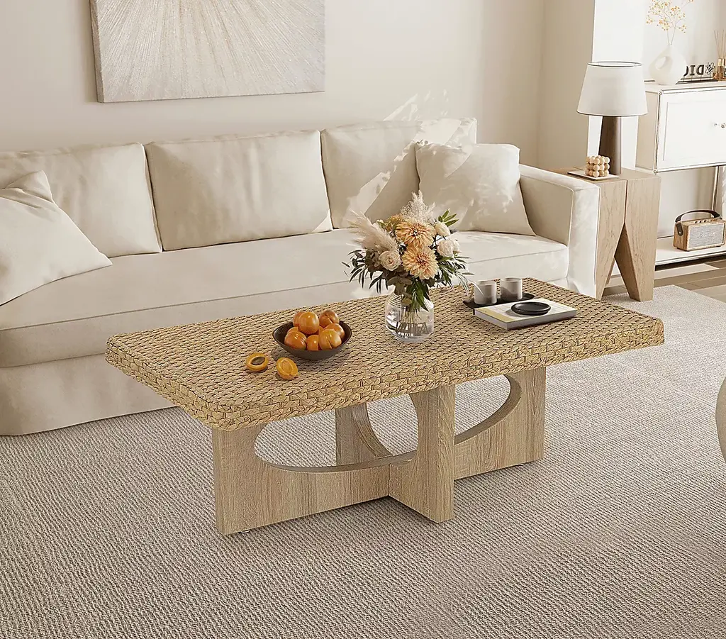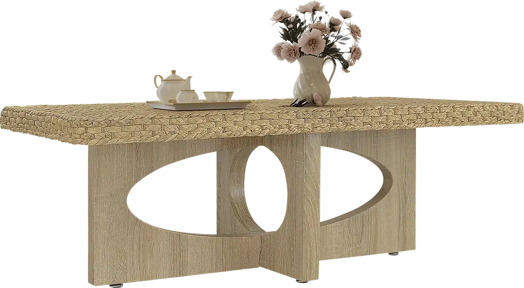 Expertly crafted and thoughtfully designed, the Madue Coffee Table brings together the natural warmth of wood and the textured beauty of woven fiber. The uniquely shaped base, made from natural finish wood veneer, adds sculptural appeal and sturdy support. A spacious rectangular top, braided with water hyacinth in a rich natural hue, perfectly complements the base for a cohesive, organic look. Blending contemporary and transitional styles, this table is a standout centerpiece-ideal for your living room, great room, den, or library. Customer assembly is required.