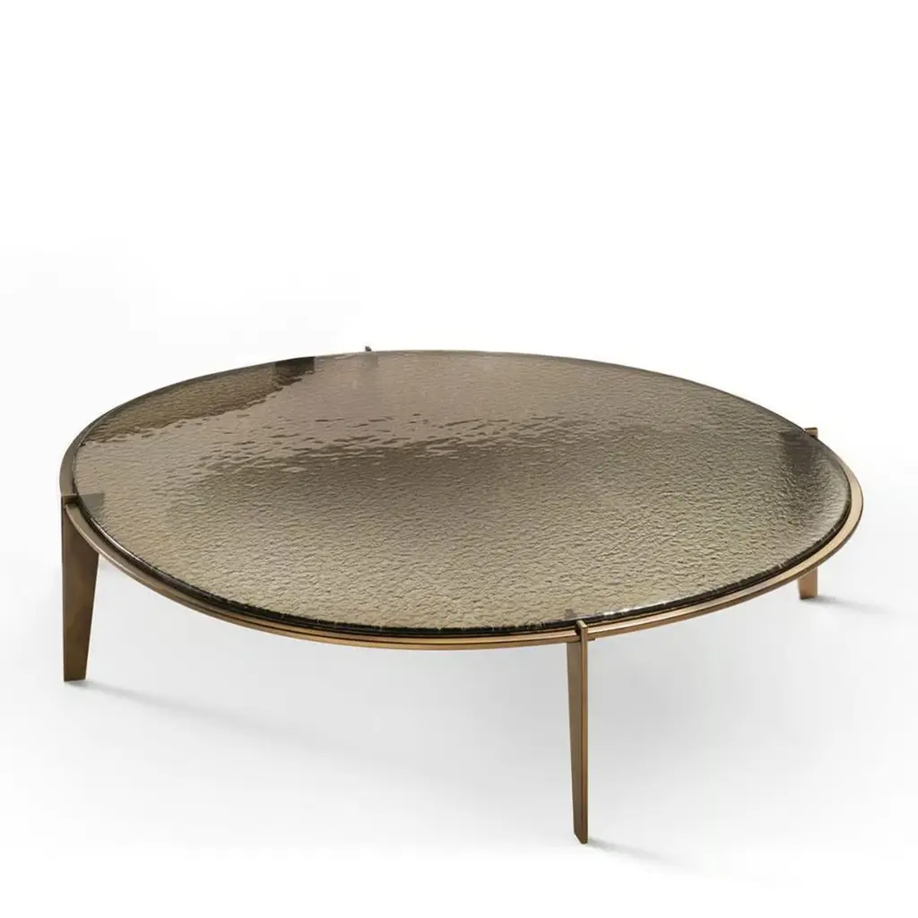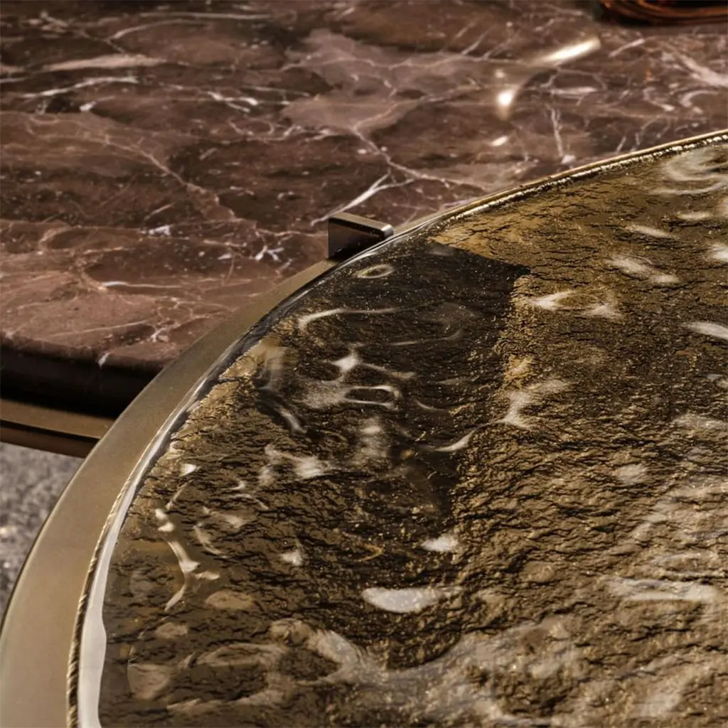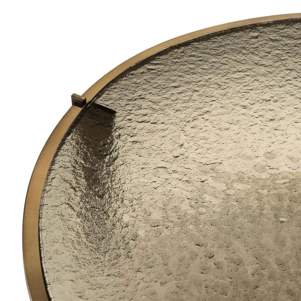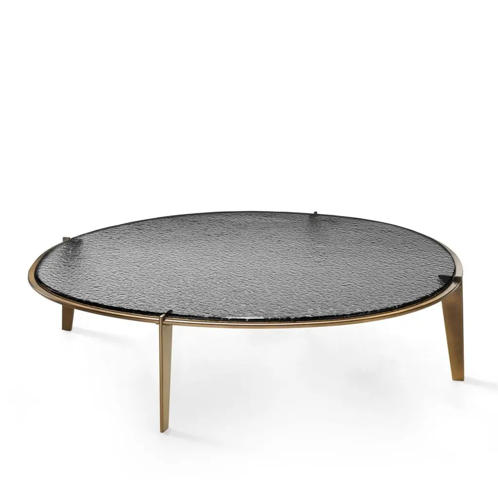 Coffee Table Maelia with metal structure in burnished brass finish.With fused glass top in bronzed finish.Also available on request fused glass top in smocked finish.Also available on request with marble top in Grigio Carnica, Manhattan, Mystic Brown or Calacatta Royal including up-charges. Coffee table also available on request in L95xD94xH40cm,price on request.