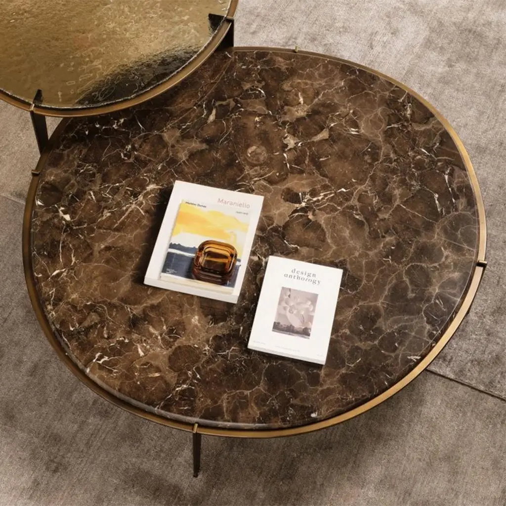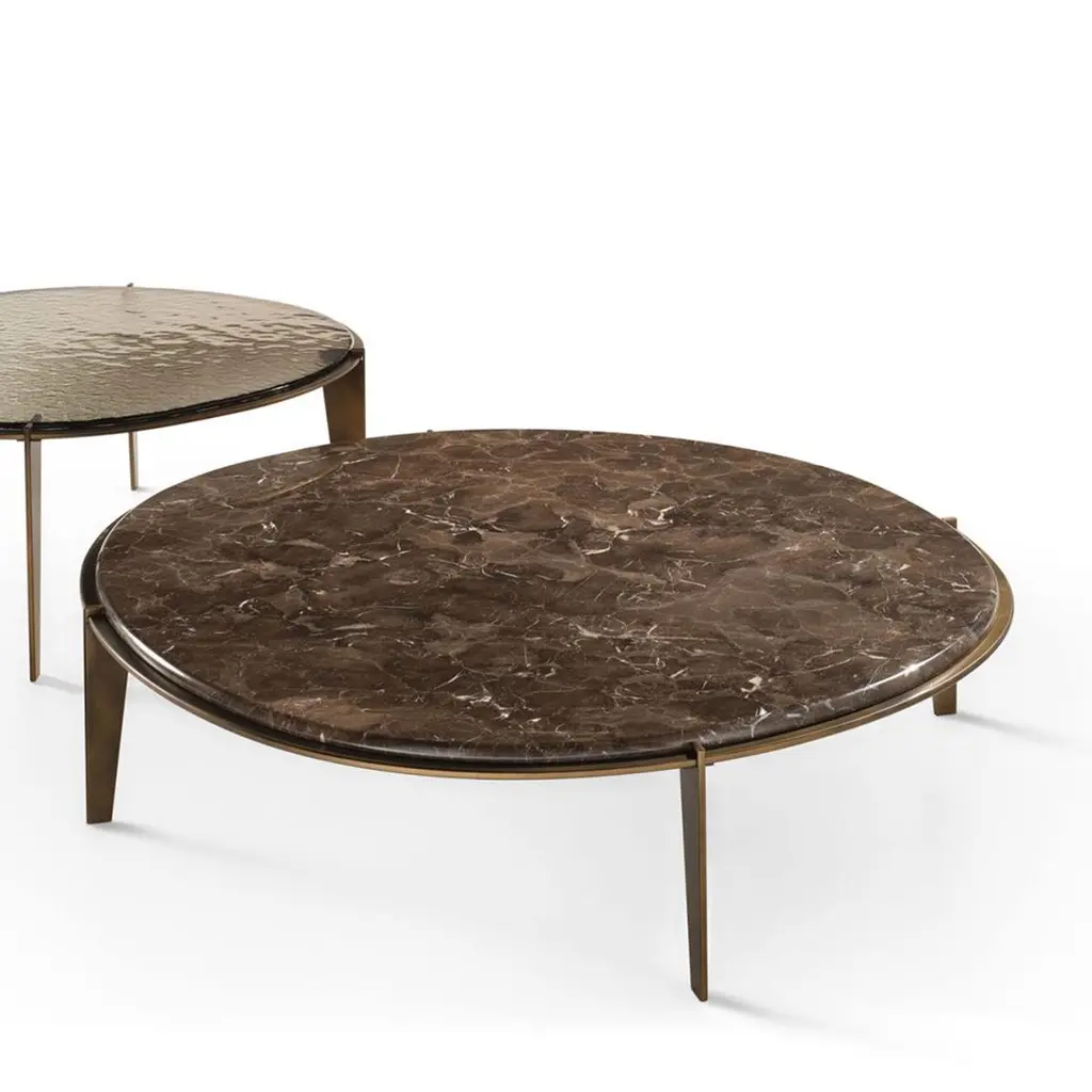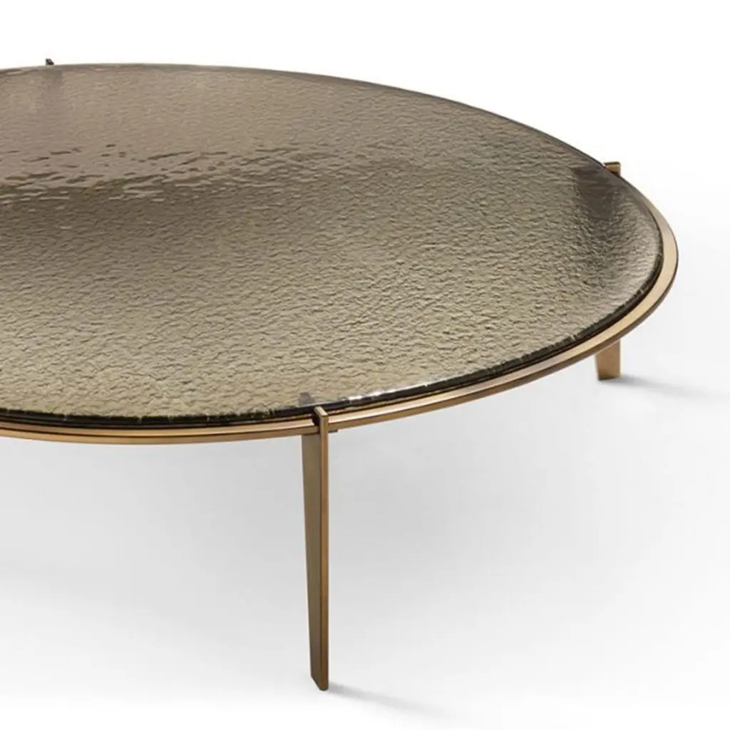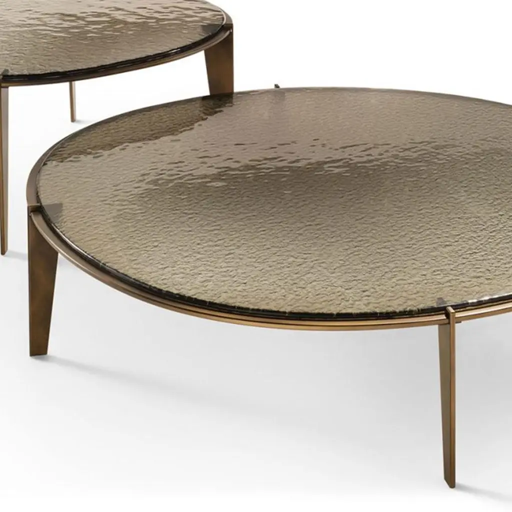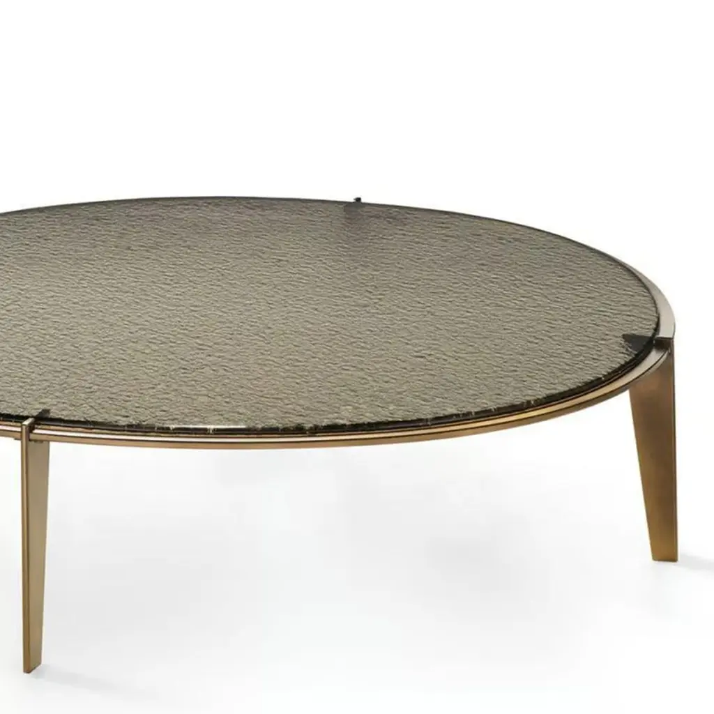 Coffee Table Maelia with metal structure in burnished brass finish.With fused glass top in bronzed finish.Also available on request fused glass top in smocked finish.Also available on request with marble top in Grigio Carnica, Manhattan, Mystic Brown or Calacatta Royal including up-charges. Coffee table also available on request in L95xD94xH40cm,price on request.