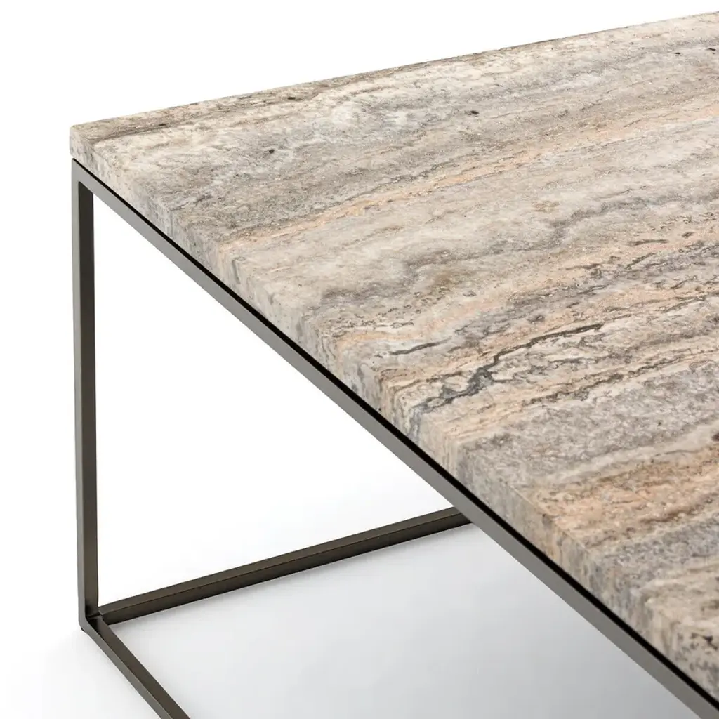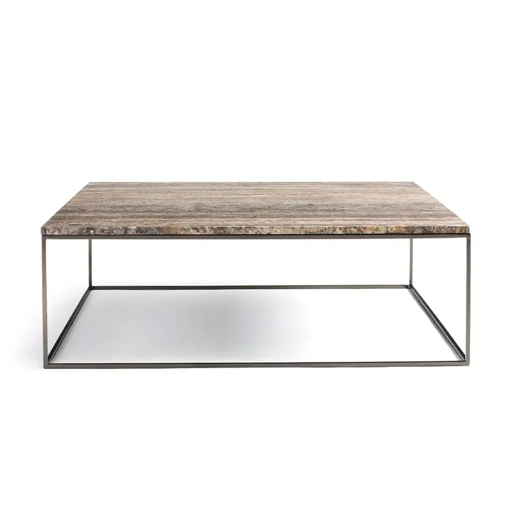The Mahaut coffee table combines elegance and simplicity with the combination of a grey travertine top and a very fine metal frame.Metal frame in blackened nickel finishGrey travertine topEach piece is unique