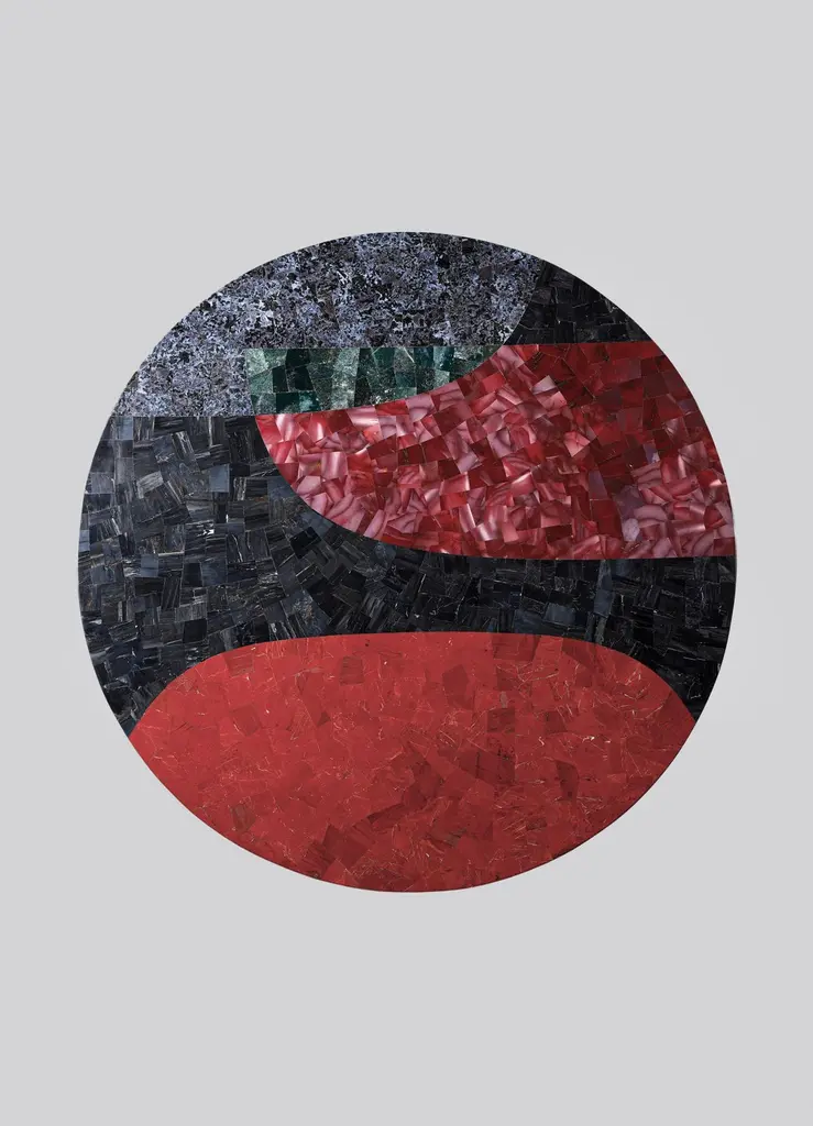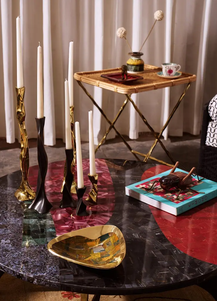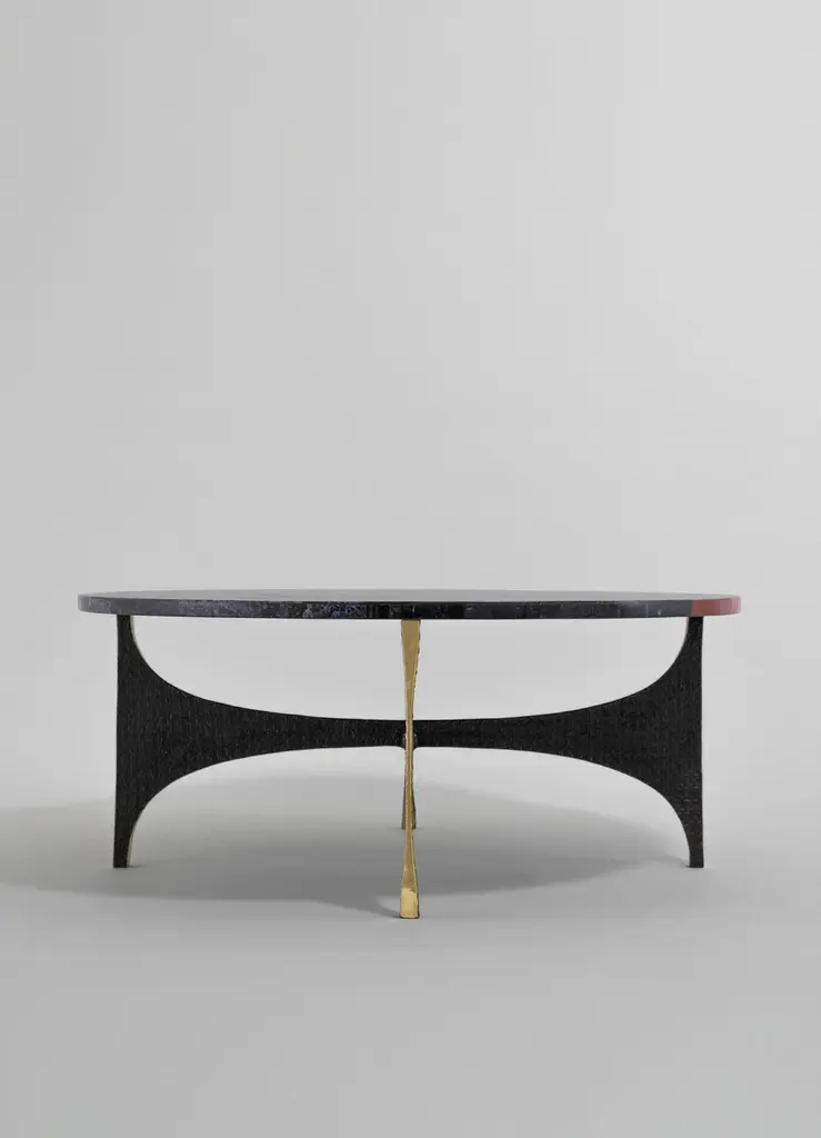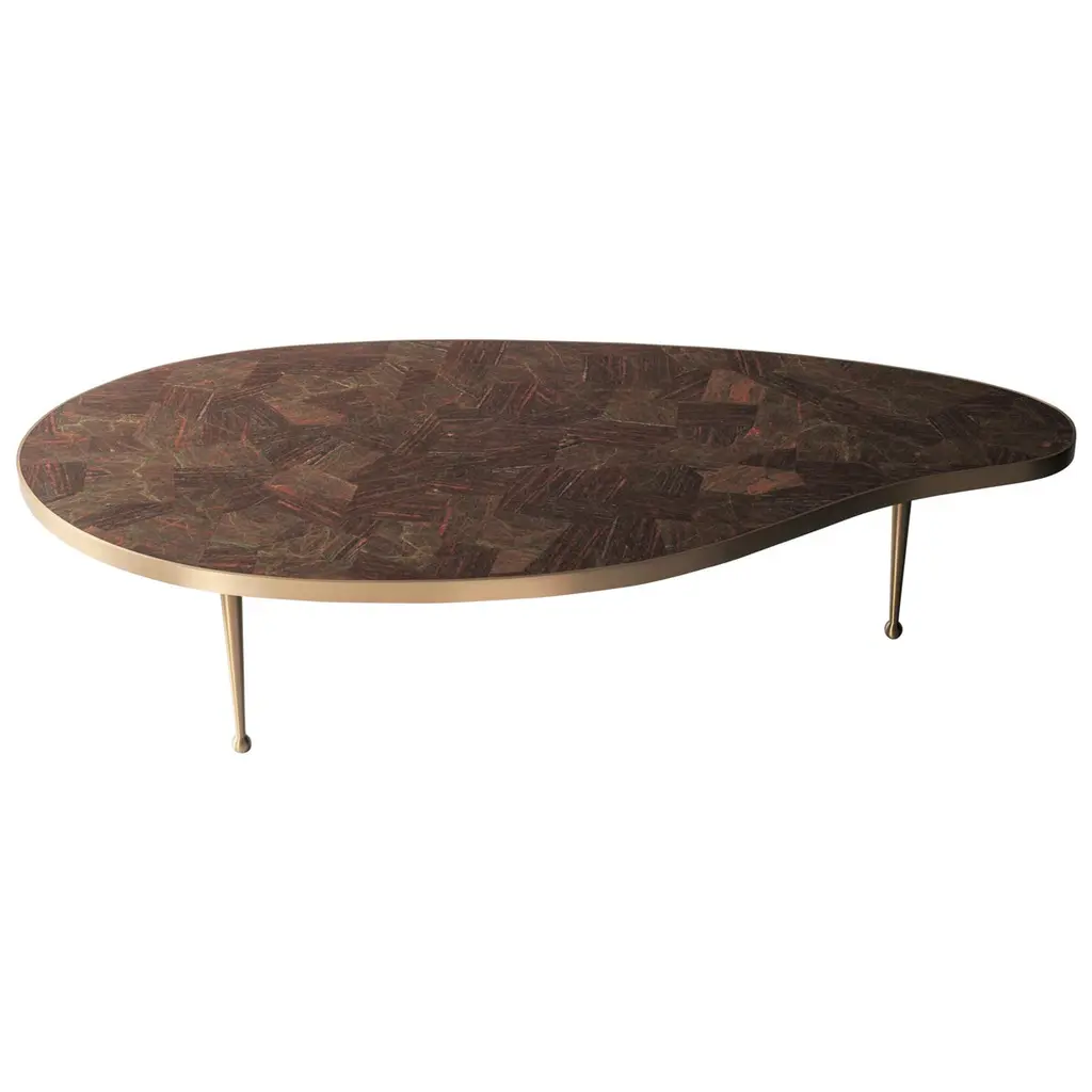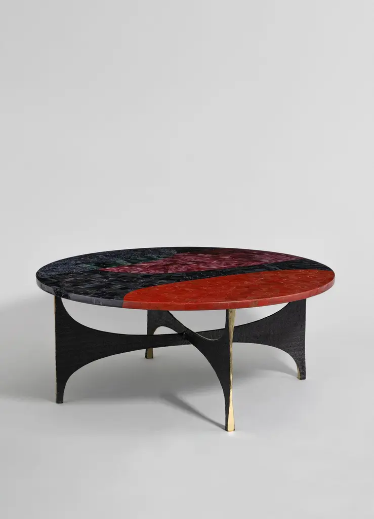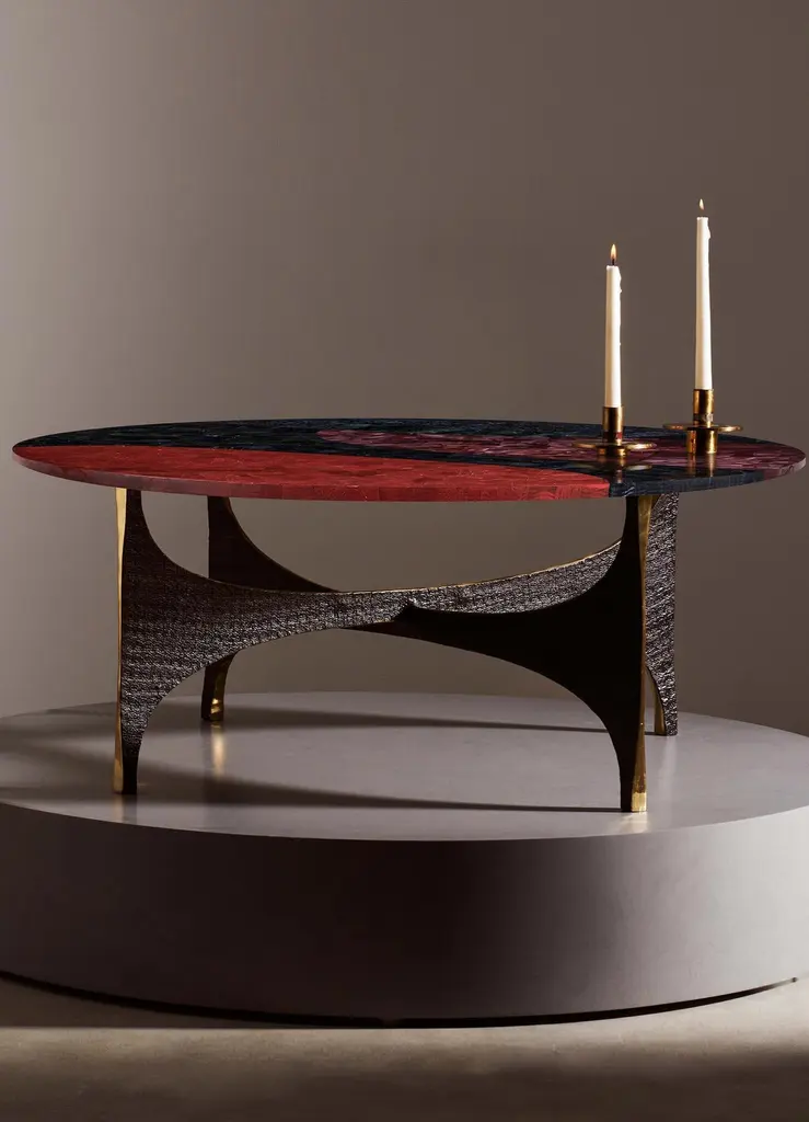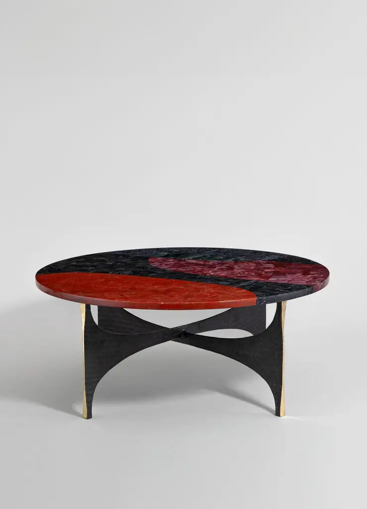 Maheshwar Coffee Table in Semi Precious Overlay Top, Viya by Vikram GoyalUnfurling ceaselessly, India discovers its eternal muse in the realm of textiles. From the liquid silks of the South to the intricate brocades of the North, handwoven fabrics are artistically rendered in the timeless medium of metal, unveiling a tapestry of irregular textures and patterns that echoes the exquisite diversity of the land.Coffee Table in brass with semi precious overlay top. Handmade in India.Product DetailsMaterial: BrassOverlay Top: Red Mookaite Jasper, Black Portoro, Red Jasper, Moss Agate, Graphic PurpleSize: 39"DIA x 16"H 99.1 DIA x 40.6 H cmWeight: 27.2 kg 59.84 lbsNumber of Pieces: 1 Coffee TableSKU: VCT151This product has been handcrafted by local artisans. As such, slight variations are a testament to the unique character of a piece made by hand.