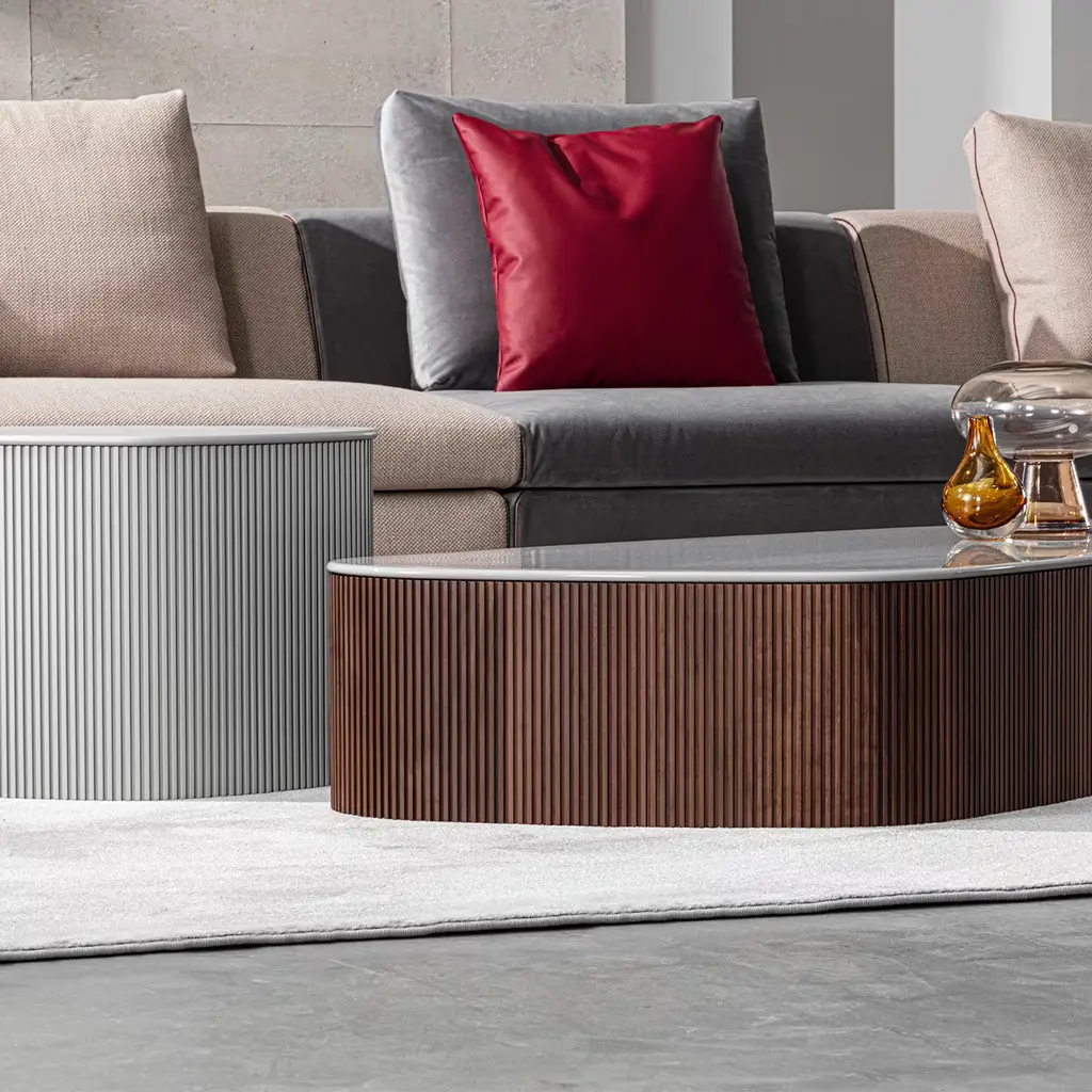 The Maiori tables offer a blend of elegance and modernity. Available in three shapes and sizes, they feature a striped, single-piece wooden base paired with a flush top. In this collection, soft, sinuous lines come together to give life to infinite compositions.