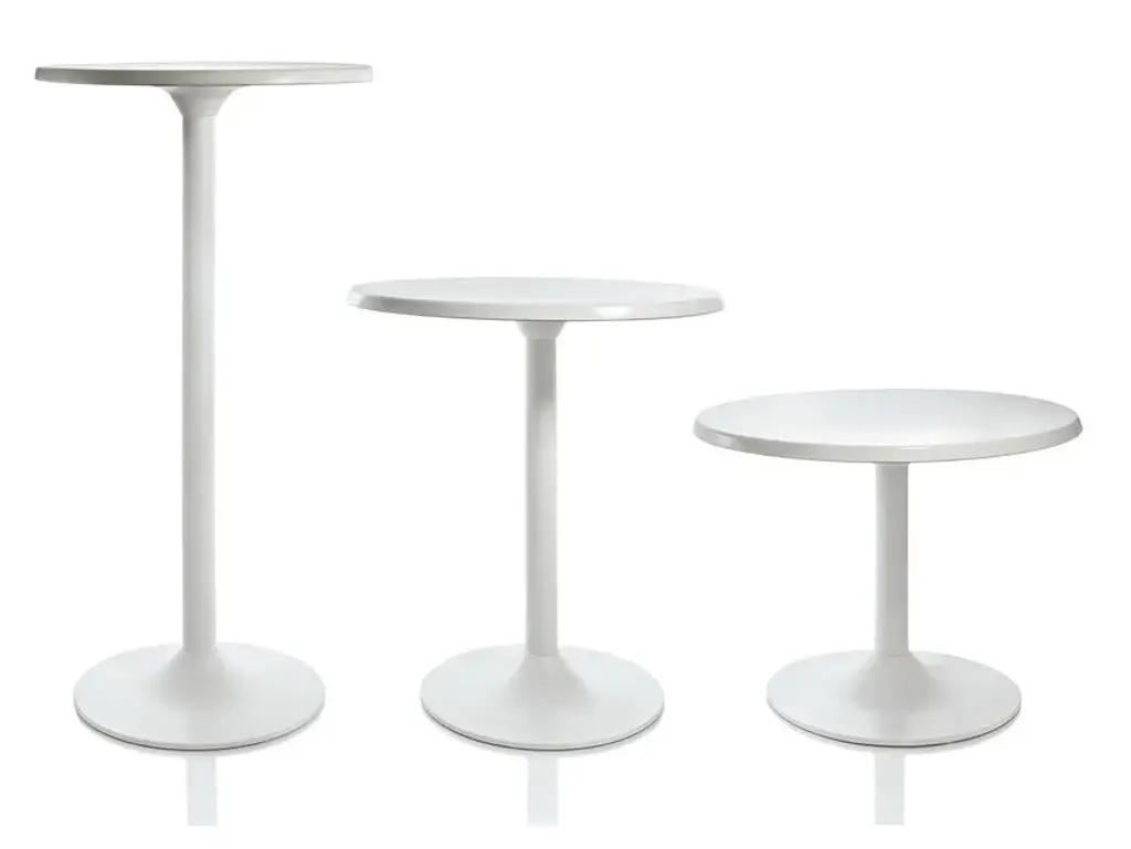 Malèna is a coffee table in lacquered steel, glossy or matte finish. Turned round base available in three different sizes. Laminated top with 45° profile and shaped corners in various sizes.