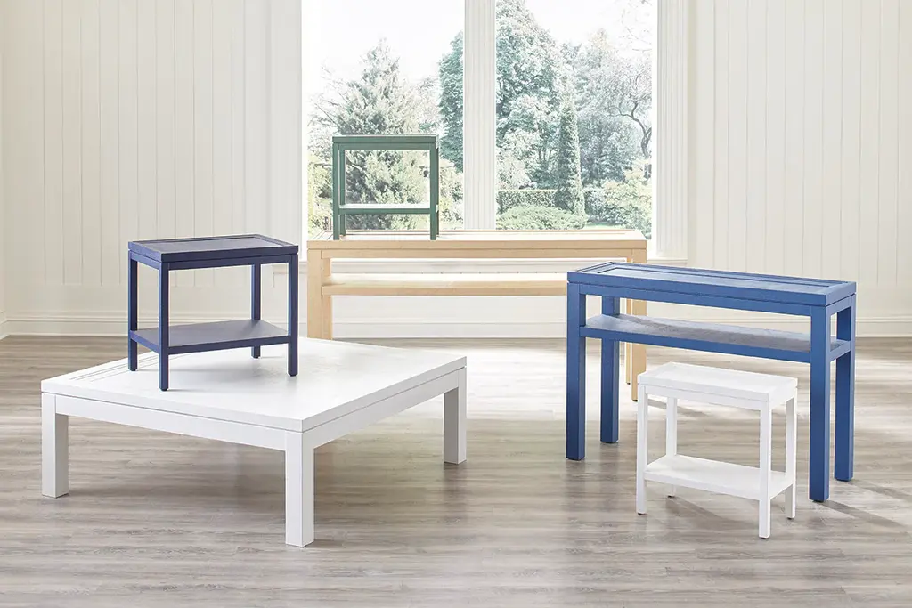 Dimensions: 52 x 30 x 19 Something different from oomph! If lacquer isn't your look, this coffee table is for you! We've wrapped our Malibu Coffee Table in 23 shades of chic faux Raffia for a durable, organic, and totally cool table. This table is sure to stand up to all the home's activity and excitement. Available in all 22 Colors and Natural. Made in America.