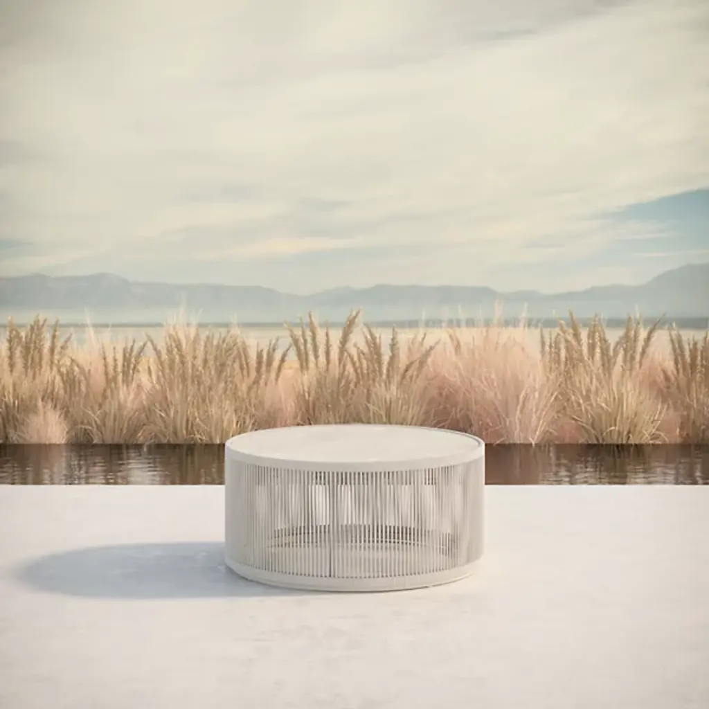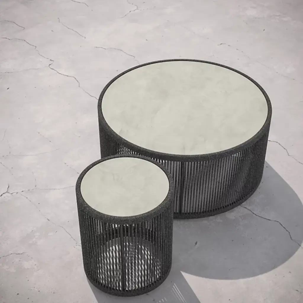 The Malta Round Outdoor Coffee Table from Azzurro Living showcases a drum-like silhouette where vertical rope patterns create rhythmic texture around its cylindrical base. All-weather textelene weaves around a fully welded, powder-coated aluminum frame, while colorfast materials resist fading, sagging, and cracking. The durable Dekton tabletop provides comprehensive weather resistance while maintaining its appearance throughout the seasons. The high-strength polyester core enhances the table's structural integrity, and its refined detailing demonstrates careful attention to both material quality and construction techniques, delivering reliable performance in outdoor environments.