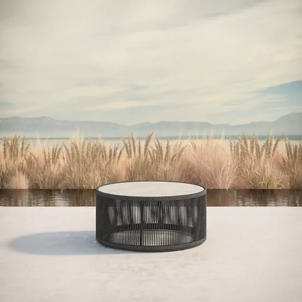 The Malta Round Outdoor Coffee Table from Azzurro Living showcases a drum-like silhouette where vertical rope patterns create rhythmic texture around its cylindrical base. All-weather textelene weaves around a fully welded, powder-coated aluminum frame, while colorfast materials resist fading, sagging, and cracking. The durable Dekton tabletop provides comprehensive weather resistance while maintaining its appearance throughout the seasons. The high-strength polyester core enhances the table's structural integrity, and its refined detailing demonstrates careful attention to both material quality and construction techniques, delivering reliable performance in outdoor environments.