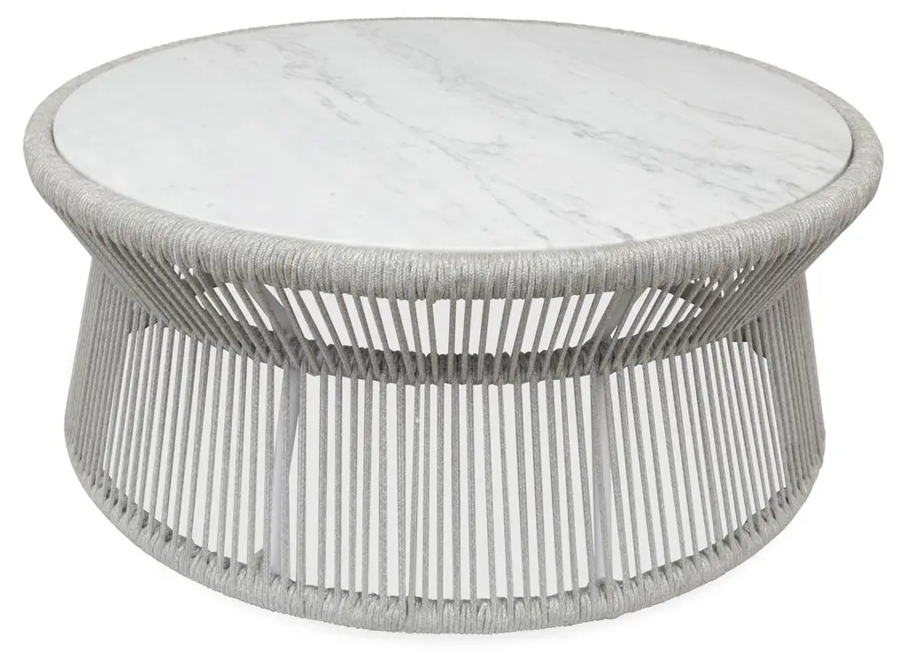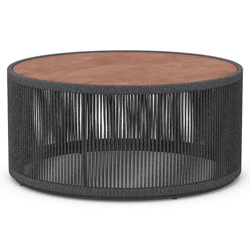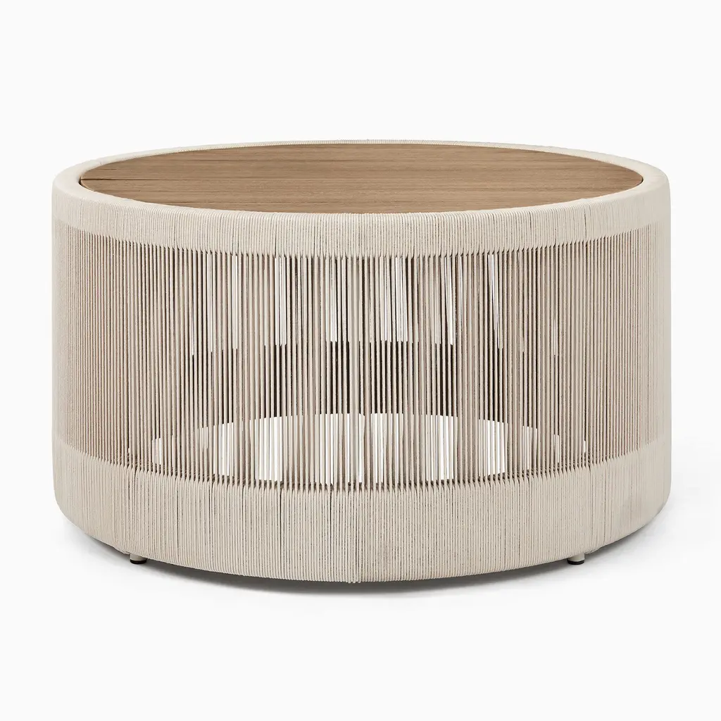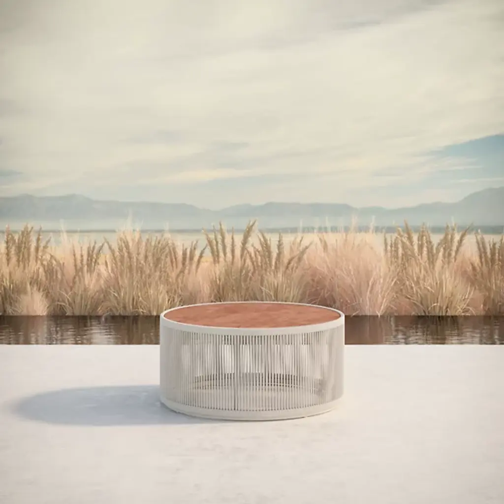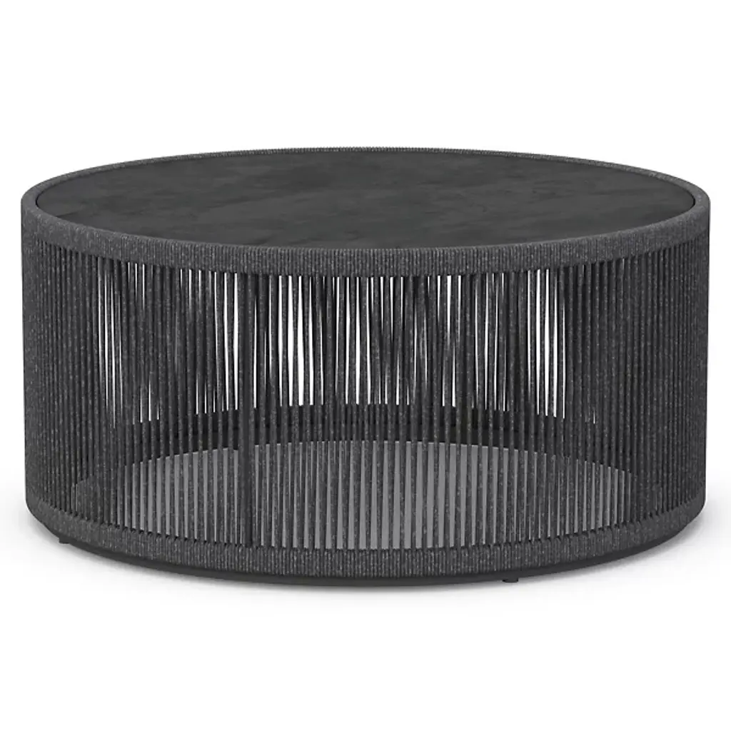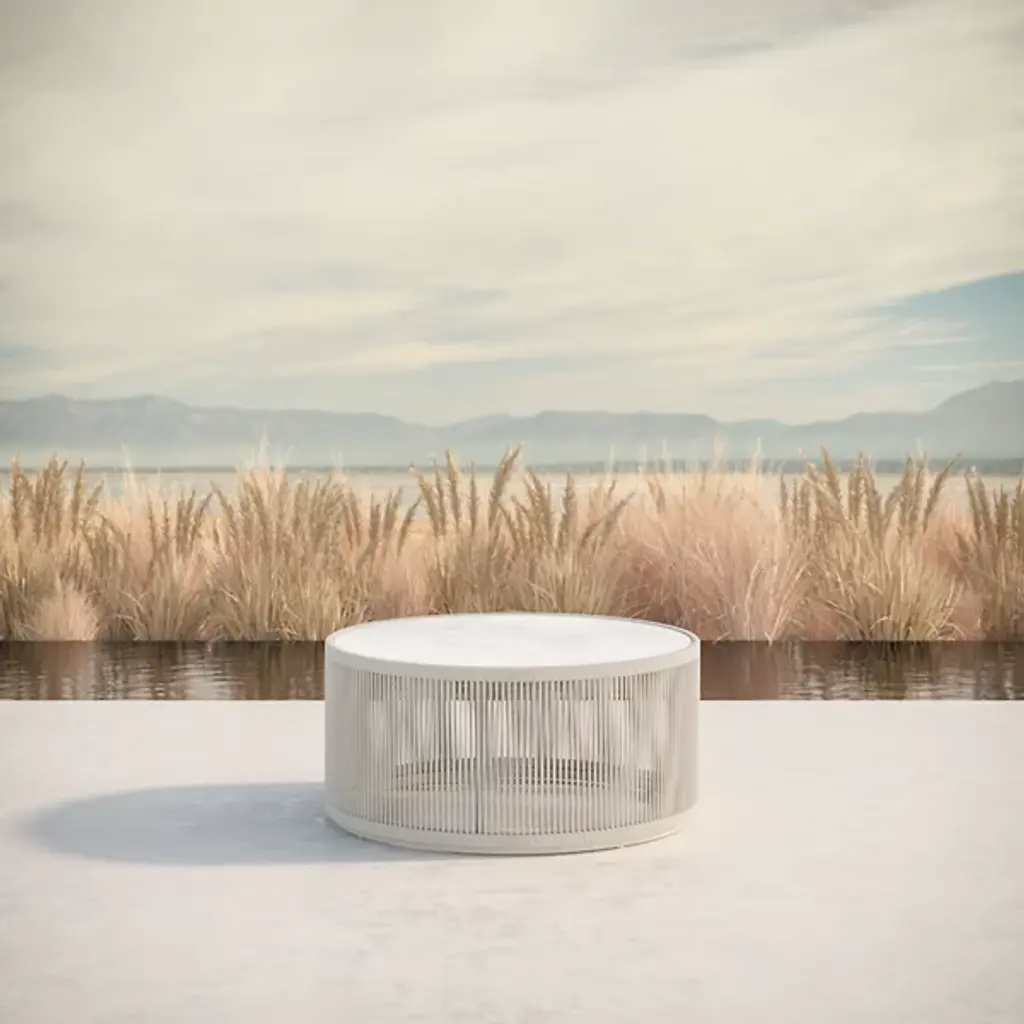 The Malta Round Outdoor Coffee Table from Azzurro Living showcases a drum-like silhouette where vertical rope patterns create rhythmic texture around its cylindrical base. All-weather textelene weaves around a fully welded, powder-coated aluminum frame, while colorfast materials resist fading, sagging, and cracking. The durable Dekton tabletop provides comprehensive weather resistance while maintaining its appearance throughout the seasons. The high-strength polyester core enhances the table's structural integrity, and its refined detailing demonstrates careful attention to both material quality and construction techniques, delivering reliable performance in outdoor environments.